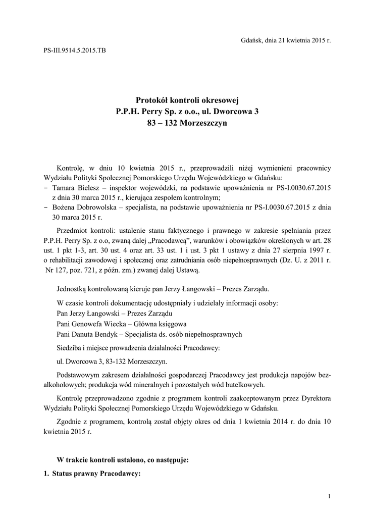 Gdańsk, dnia 21 kwietnia 2015 r. PS-III.9514.5.2015.TB Protokół kontroli okresowej P.P.H. Perry Sp. z o.o., ul. Dworcowa 3 83 – 132 Morzeszczyn Kontrolę, w dniu 10 kwietnia 2015 r., przeprowadzili niżej wymienieni pracownicy Wydziału Polityki Społecznej Pomorskiego Urzędu Wojewódzkiego w Gdańsku: - Tamara Bielesz – inspektor wojewódzki, na podstawie upoważnienia nr PS-I.0030.67.2015 z dnia 30 marca 2015 r., kierująca zespołem kontrolnym; - Bożena Dobrowolska – specjalista, na podstawie upoważnienia nr PS-I.0030.67.2015 z dnia 30 marca 2015 r. Przedmiot kontroli: ustalenie stanu faktycznego i prawnego w zakresie spełniania przez P.P.H. Perry Sp. z o.o, zwaną dalej „Pracodawcą”, warunków i obowiązków określonych w art. 28 ust. 1 pkt 1-3, art. 30 ust. 4 oraz art. 33 ust. 1 i ust. 3 pkt 1 ustawy z dnia 27 sierpnia 1997 r. o rehabilitacji zawodowej i społecznej oraz zatrudniania osób niepełnosprawnych (Dz. U. z 2011 r. Nr 127, poz. 721, z późn. zm.) zwanej dalej Ustawą. Jednostką kontrolowaną kieruje pan Jerzy Łangowski – Prezes Zarządu. W czasie kontroli dokumentację udostępniały i udzielały informacji osoby: Pan Jerzy Łangowski – Prezes Zarządu Pani Genowefa Wiecka – Główna księgowa Pani Danuta Bendyk – Specjalista ds. osób niepełnosprawnych Siedziba i miejsce prowadzenia działalności Pracodawcy: ul. Dworcowa 3, 83-132 Morzeszczyn. Podstawowym zakresem działalności gospodarczej Pracodawcy jest produkcja napojów bezalkoholowych; produkcja wód mineralnych i pozostałych wód butelkowych. Kontrolę przeprowadzono zgodnie z programem kontroli zaakceptowanym przez Dyrektora Wydziału Polityki Społecznej Pomorskiego Urzędu Wojewódzkiego w Gdańsku. Zgodnie z programem, kontrolą został objęty okres od dnia 1 kwietnia 2014 r. do dnia 10 kwietnia 2015 r. W trakcie kontroli ustalono, co następuje: 1. Status prawny Pracodawcy: 1 Pracodawca prowadzi działalność na podstawie: - Wpisu do KRS Nr 0000094546 Rejestru Przedsiębiorców, prowadzonego przez Sąd Rejonowy Gdańsk-Północ w Gdańsku, VII Wydział Gospodarczy Krajowego Rejestru Sądowego. - Decyzji Wojewody Pomorskiego Nr D/10/2005 z dnia 19 kwietnia 2005 r. 2. Spełnianie przez Pracodawcę warunków określonych w art. 28 ustawy z dnia 27 sierpnia 1997 r. o rehabilitacji zawodowej i społecznej oraz zatrudniania osób niepełnosprawnych: 1) stan zatrudnienia ogółem: []* osób ([]*etatów), w tym niepełnosprawnych []*osób ([]* etatów). Wszystkie osoby zatrudnione są na podstawie przepisów kodeksu pracy. []*osób ([]*etatów) ma orzeczony lekki stopień niepełnosprawności, []*osób []* etatów) ma orzeczony umiarkowany stopień niepełnosprawności, []*osoby ([]* etaty) mają orzeczony znaczny stopień niepełnosprawności (zestawienie zatrudnienia na miesiąc kwiecień, w tym na dzień 10 kwietnia 2015 r., stanowi znacznik nr 1 do protokołu). Pracodawca przedstawił zespołowi kontrolnemu stan zatrudnienia w losowo wybranym czasie kontrolowanego okresu: maj, sierpień, grudzień 2014 r., styczeń 2015 r. (zestawienia stanowią załączniki nr 2, 3, 4, 5 do protokołu). Zespół kontrolny stwierdził, że w okresie poddanym kontroli pracodawca wypełniał warunki zatrudnienia, określone w art. 28 ust. 1 ustawy z dnia 27 sierpnia 1997 r. o rehabilitacji zawodowej i społecznej oraz zatrudniania osób niepełnosprawnych, dla pracodawców posiadających status zakładu pracy chronionej. W trakcie czynności kontrolnych skontrolowano akta osobowe []*losowo wybranych osób niepełnosprawnych zatrudnionych w zakładzie: []*osób mających orzeczony znaczny stopień niepełnosprawności, []*osób mających orzeczony umiarkowany stopień niepełnosprawności oraz []*osób mających orzeczony lekki stopień niepełnosprawności(zestawienie stanowi załącznik nr 7 do protokołu). We wszystkich aktach osobowych, objętych kontrolą, stwierdza się aktualne umowy o pracę (z treści umowy wynika zakres czynności), aktualne zaświadczenia lekarskie o braku przeciwwskazań zdrowotnych do wykonywania pracy na stanowisku oraz orzeczenia o stopniu niepełnosprawności. 2) wskaźnik zatrudnienia osób niepełnosprawnych wynosi []*%, wskaźnik zatrudnienia osób niepełnosprawnych z umiarkowanym lub znacznym stopniem niepełnosprawności wynosi []*% (stan na dzień kontroli). Pracodawca przedstawił wskaźniki zatrudnienia w ww. miesiącach kontrolowanego okresu. Zespół kontrolny stwierdził, że w okresie poddanym kontroli pracodawca osiągał wartości wskaźników zatrudnienia, określone w art. 28 ust. 1 pkt 1a ustawy z dnia 27 sierpnia 1997 r. o rehabilitacji zawodowej i społecznej oraz zatrudniania osób niepełnosprawnych, dla pracodawców posiadających status zakładu pracy chronionej. 3) obiekty i pomieszczenia w Morzeszczynie przy ul. Dworcowej 3, użytkowane, w ramach statusu zakładu pracy chronionej, na podstawie na podstawie decyzji Państwowej Inspekcji Pracy Oddział w Malborku nr rej.:1M-03119-51200-15/05 z dnia 17 marca 2005 r. , oraz decyzji Nr 03119-51200-K079-Ao11/14 z dnia 15 grudnia 2014 r. dla nowo użytkowanej części, stwierdzającej, że obiekty i pomieszczenia odpowiadają przepisom i zasadom bezpieczeństwa i 2 higieny pracy, uwzględniają potrzeby zatrudnionych tu osób niepełnosprawnych w zakresie przystosowania stanowisk pracy, pomieszczeń higieniczno- sanitarnych i ciągów komunikacyjnych oraz spełniają wymagania dostępności do nich. Wyniki kontroli Państwowej Inspekcji Pracy, zakończonej protokołem nr 03119-5317-K079-Pt/14 z dnia 10 grudnia 2014 r., potwierdzają, że obiekty są przystosowane dla potrzeb zatrudnionych osób niepełnosprawnych. Pomieszczenia higieniczno-sanitarne są dostosowane do wymogów obowiązujących w tym względzie. 4) w celu realizacji świadczeń w zakresie profilaktycznej i specjalistycznej opieki zdrowotnej oraz poradnictwa i usług rehabilitacyjnych oraz na opiekę doraźną w czasie urlopu piel