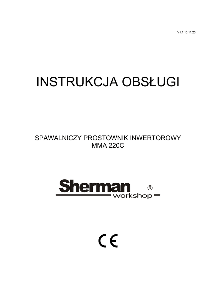 V1.1 15.11.25 INSTRUKCJA OBSŁUGI SPAWALNICZY PROSTOWNIK INWERTOROWY MMA 220C OSTRZEŻENIE! Przed instalacją i rozruchem urządzenia należy zapoznać się z niniejszą instrukcją 1. UWAGI OGÓLNE Uruchomienia i eksploatacji urządzenia można dokonać tylko po dokładnym zapoznaniu się z niniejszą Instrukcją Obsługi. Ze względu na ciągły rozwój techniczny urządzenia, pewne jego funkcje mogą ulegać modyfikacji i ich działanie może różnić się szczegółami od opisów w instrukcji. Nie jest to błędem urządzenia, lecz wynikiem postępu i ciągłych prac modyfikacyjnych urządzenia. Uszkodzenie urządzenia spowodowane niewłaściwą obsługą powoduje utratę uprawnień z tytułu gwarancji. Wszelkie przeróbki prostownika są zabronione i powodują utratę gwarancji. 2. BEZPIECZEŃSTWO Pracownicy obsługujący urządzenie powinni posiadać niezbędne kwalifikacje uprawniające ich do wykonywania prac spawalniczych: • powinni posiadać uprawnienia spawacza elektrycznego w zakresie spawania elektrodami otulonymi. • znać zasady BHP przy eksploatacji urządzeń elektroenergetycznych jakimi są urządzenia spawalnicze i osprzęt pomocniczy zasilany energią elektryczną, • znać treść niniejszej instrukcji i eksploatować urządzenie zgodnie z jego przeznaczeniem. OSTRZEŻENIE Spawanie może zagrażać bezpieczeństwu operatora i pozostałych osób przebywających w pobliżu. Dlatego podczas spawania należy zachować szczególne środki ostrożności. Przed przystąpieniem do spawania należy zapoznać się z przepisami BHP obowiązującym na stanowisku pracy. W czasie spawania elektrycznego metodami MMA oraz TIG istnieją następujące zagrożenia: • PORAŻENIE PRĄDEM ELEKTRYCZNYM • NEGATYWNE ODDZIAŁYWANIE ŁUKU NA OCZY I SKÓRĘ CZŁOWIEKA • ZATRUCIE PARAMI I GAZAMI • OPARZENIA • ZAGROŻENIA WYBUCHEM I POŻAREM • HAŁAS Zapobieganie porażeniu prądem elektrycznym: • podłączać urządzenie do technicznie sprawnej instalacji elektrycznej w właściwym zabezpieczeniu i skuteczności zerowania (dodatkowej ochrony przeciwporażeniowej); należy sprawdzić i poprawnie podłączyć do sieci także inne urządzenia na stanowisku pracy spawacza, • przewody prądowe montować przy wyłączonym urządzeniu, • nie dotykać jednocześnie nieizolowanych części uchwytu elektrodowego, elektrody i przedmiotu spawanego, w tym obudowy urządzenia, • nie używać uchwytów i przewodów prądowych o uszkodzonej izolacji, • w warunkach szczególnego zagrożenia porażeniem prądem elektrycznym (praca w środowiskach o dużej wilgotności i zbiornikach zamkniętych) pracować z pomocnikiem wspomagającym pracę spawacza i czuwającym nad bezpieczeństwem, stosować ubranie i rękawice o dobrych właściwościach izolacyjnych, • w razie zauważenia jakichkolwiek nieprawidłowości, należy zwrócić się do kompetentnych osób w celu ich usunięcia, • Zabroniona jest eksploatacja urządzenia ze zdjętymi osłonami. Zapobieganie negatywnemu oddziaływaniu łuku elektrycznego na oczy i skórę człowieka: • Stosować ubrania ochronne (rękawice, fartuch, buty skórzane), • Stosować tarcze lub przyłbice ochronne z właściwie dobranym filtrem, • Stosować zasłony ochronne z niepalnych materiałów oraz właściwie dobierać kolorystykę ścian absorbujących szkodliwe promieniowanie. Zapobieganie zatruciom parami i gazami wydzielanymi w czasie spawania z otuliny elektrod i parowania metali: • Stosować urządzenia wentylacyjne i odciągi instalowane na stanowiskach o ograniczonej wymianie powietrza, 2 • Przedmuchiwać świeżym powietrzem przy pracach w przestrzeni zamkniętej (zbiorniki), • Stosować maski i respiratory. Zapobieganie oparzeniom: • Stosować odpowiednią odzież ochronną i obuwie chroniące od oparzeń pochodzących od promieniowania łuku i odprysków, • Unikać zabrudzeń odzieży smarami i olejami mogącymi doprowadzić do jej zapalenia Zapobieganie wybuchowi i pożarom: • Zabrania się eksploatacji urządzenia i spawania w pomieszczeniach zagrożonych wybuchem lub pożarem. • Stanowisko spawalnicze powinno być wyposażone w sprzęt gaśniczy. • Stanowisko spawalnicze powinno znajdować się w bezpiecznej odległości od materiałów łatwopalnych. Zapobieganie negatywnemu oddziaływaniu hałasu: • Stosować zatyczki do uszu lub inne środki ochrony przed hałasem • Ostrzegać o niebezpieczeństwie osób znajdujących się w pobliżu OSTRZEŻENIE! Nie wolno używać źródła prądu do rozmrażania zamarzniętych rur. Przed uruchomieniem urządzenia należy: • Sprawdzić stan połączeń elektrycznych i mechanicznych. Zabrania się używać uchwytów i przewodów prądowych o uszkodzonej izolacji. Niewłaściwa izolacja uchwytów i przewodów prądowych grozi porażeniem prądem elektrycznym, • Zadbać o właściwe warunki pracy, tj. zapewnić właściwą temperaturę, wilgotność i wentylację w miejscu pracy. Poza pomieszczeniami zamkniętymi chronić przed opadami atmosferycznymi, • Umieścić prostownik w miejscu umożliwiającym jego łatwą obsługę. Osoby obsługujące spawarkę powinny: • posiadać uprawnienia do spawania elektrycznego elektrodami otulonymi (metoda MMA), • znać i przestrzegać przepisy BHP obowiązujące przy wykonywaniu prac spawalniczych, • używać właściwego, specjalistycznego sprzętu ochronnego: rękawic, fartucha, butów gumowych, tarczy lub przyłbicy spawalniczej z odpowiednio dobranym filtrem. • znać treść niniejszej instrukcji obsługi i eksploatować spawarkę zgodnie z jej przeznaczeniem. Wszelkie naprawy urządzenia mogą być dokonywane wyłącznie po odłączeniu wtyczki z gniazdka zasilającego. Gdy urządzenie jest podłączone do sieci niedozwolone jest dotykanie gołą ręką ani przez wilgotną odzież żadnych elementów tworzących obwód prądu spawania. Zabronione jest zdejmowanie osłon zewnętrznych przy urządzeniu włączonym do sie
