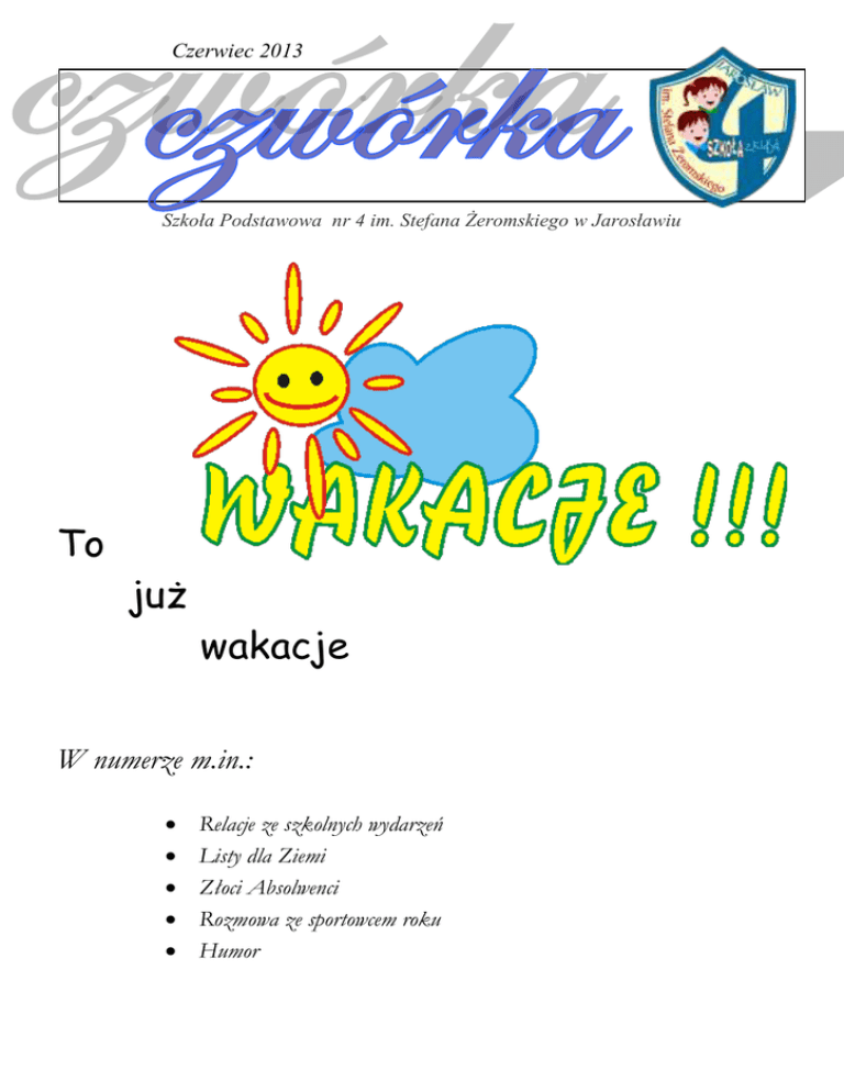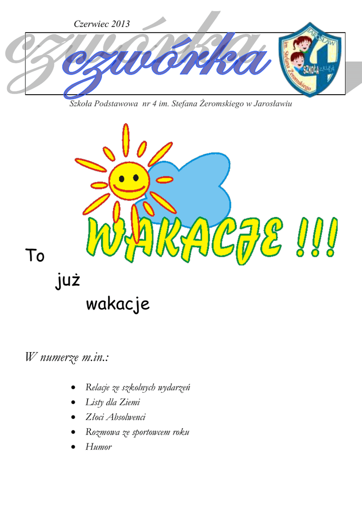 Czerwiec 2013 Szkoła Podstawowa nr 4 im. Stefana Żeromskiego w Jarosławiu To już wakacje W numerze m.in.: Relacje ze szkolnych wydarzeń Listy dla Ziemi Złoci Absolwenci Rozmowa ze sportowcem roku Humor Od redakcji POŻEGNANIA NADSZEDŁ CZAS To już ostatnie dni przed wakacjami. Dla nas, szóstoklasistów, ostatnie dni w szkole. I nasz ostatni numer czasopisma „Czwórka”. Ostatnia wycieczka (dla klasy VI b do Krakowa, dla innych do Radawy), ostatnia dyskoteka, ostatnie lekcje, ostatnie spotkania z całą klasą... Wciąż powtarza się słowo „ostatni”. Przyszedł czas, by pożegnać szkołę, pożegnać nauczycieli i kolegów. W naszym przypadku pożegnać również Czytelników. Tak się składa, że przez ostatnie lata gazetkę redagowali przede wszystkim uczniowie, którzy właśnie stają się absolwentami. W tym roku były to same szóstoklasistki. Miło było nam przygotowywać materiały do pisma cieszącego się popularnością wśród uczniów. Teraz czas na Was, młodsi Czytelnicy. Przekazujemy gazetkę w Wasze ręce. Nie tylko ją czytajcie, ale i wspólnie twórzcie. POWODZENIA !!! JULIA TROJNIAK Zlot Gwiaździsty ŚLADAMI PRZESZŁOŚCI „Obok Orła znak Pogoni, poszli nasi w bój bez broni – 150. rocznica Powstania Styczniowego – mieszkańcy Podkarpacia w Powstaniu Styczniowym” – tak w pełni brzmiał tytuł tegorocznej, dwunastej edycji Zlotu Gwiaździstego – Śladami Przeszłości. Najwyższe miejsca, jak co roku, przypadły naszej szkole. Rozdanie nagród odbyło się 26 kwietnia w jarosławskim Opactwie. Prace historyczne, pisane przez uczniów na Zlot Gwiaździsty, wymagają poważnych badań historycznych oraz rozmów ze świadkami wydarzeń lub ich krewnymi. W tegorocznej edycji konkursu o zasięgu byłego województwa przemyskiego brali udział uczniowie, których zadaniem było napisanie pracy poświęconej konkretnym bohaterom powstania1863 r. Temat był o tyle trudniejszy od poprzednich, że niemożliwe jest dotarcie do uczestników wydarzeń z II połowy XIX wieku. Pozostało więc odnalezienie osób, które pamiętają świadectwa powstańców. Prace naszych uczniów i uczennic okazały się najlepsze. I miejsce otrzymała Dominika Sęk (VI a), II miejsce – Oliwia Gładysz (VI a), natomiast III miejsce Weronika Brzozowska (VI b). Zostały również przyznane wyróżnienia. Otrzymali je: Karolina Mazur (VI a), Kornelia Puszyńska (VI a), Michał Parzniewski (VI a), Hubert Olejarz (VI c), Michał Biliński (VI c) oraz Michał Krzywiński (VI c). Ponadto za uzyskanie największej liczby punktów nasza szkoła otrzymała Puchar Przechodni Dowódcy Garnizonu Jarosław. EMILIA MATREJEK WYŚPIEWAŁA PIERWSZE MIEJSCE Nasza uczennica Katarzyna Wygnaniec zajęła I miejsce w powiatowym konkursie piosenki O Złoty Klucz do Sławy. Konkurs odbył się w Miejskim Ośrodku Kultury w Jarosławiu 19 kwietnia, a koncert finałowy – 9 maja. Kasia Wygnaniec z klasy V c wyśpiewała sobie zwycięstwo piosenką Być kobietą (słowa Magdalena Czapińska, muzyka Włodzimierz Korcz, wykonanie oryginalne Alicja Majewska). Rywalizacja była spora – ogółem w zmaganiach o Złoty Klucz wzięło udział 40 solistów i 3 zespoły. Uczestników podzielono na 4 kategorie. Wśród starszych uczniów szkół podstawowych (klasy IV – VI) wygrała nasza reprezentantka. Podczas przesłuchań konkursowych widzami byli tylko jurorzy oraz uczestnicy wraz z opiekunami. Okazją do zaprezentowania się w znacznie szerszym gronie stał się koncert laureatów, który odbył się 9 maja. UCZCILI DZIEŃ ZIEMI 22 kwietnia to Światowy Dzień Ziemi – czas, kiedy mamy sobie uświadamiać, czym jest dla nas planeta, na której mieszkamy i jak ją chronić. Klasy II e, III a i III b uczciły ten dzień w szczególny sposób. Po raz pierwszy Dzień Ziemi obchodzono w Stanach Zjednoczonych w 1970 roku. Drugoklasiści z tej okazji przygotowali widowisko poetycko – muzyczne „SOS dla Ziemi, czyli posprzątajmy naszą planetę”. Przedstawienie miało wydźwięk edukacyjny. Jego odbiorcy poznali szereg zachowań ekologicznych, których stosowanie w codziennym życiu jest bardzo ważne. Na zakończenie odbył się pokaz mody ekologicznej. Uczniowie II e wyszli na „wybieg” w samodzielnie zaprojektowanych i wykonanych strojach oraz biżuterii. Wszystko zostało przygotowane z materiałów wtórnych. Z kolei uczniowie klas : III a i III b włączyli się w akcję pisania listów do Ziemi, odbywającą się pod patronatem Fundacji Ekologicznej „Arka”. Treść listów miała zachęcić dorosłych do ochrony środowiska. Dzieci wybrały się też wspólnie do parku miejskiego, by uporządkować zieleńce i posegregować śmieci. Zachęcamy do przeczytania dwóch wybranych listów. LISTY DLA ZIEMI Jarosław, 21.04.2013 r. Droga Ciociu! Zaczęłam interesować się ekologią. Uświadomiłam sobie, jak bardzo ludzie przyczyniają się do niszczenia Ziemi. Zanieczyszczają środowisko wieloma odpadami. Bardzo ważne jest segregowanie śmieci. Codziennie wyrzucamy opakowania po różnych produktach. Wystarczy tylko je posegregować i wrzucić do odpowiednich kontenerów. Na każdym osiedlu są ustawione pojemniki na papier, szkło czy plastik. Ciociu, czy wiesz, że zwykła torba foliowa rozkłada się nawet do 400 lat, a kartka papieru 6 miesięcy? Dlatego trzeba ją umieścić w pojemniku z napisem ,,papier’’. Wtedy szybko zostanie znowu wykorzystana i powstanie z niej np. nowa książka z bajkami. Szkło to też materiał wielokrotnego użytku, który może być wiele razy przetworzony. Dlatego tak ważne jest, aby wyrzucić szklaną butelkę czy słoik do odpowiedniego pojemnika. Gorąco zachęcam Cię do segregowania śmieci. W tak prosty sposób możesz zrobić coś dobrego dla Ziemi. Pozdrawiam Cię Julia Jarosław, 29.04.2013r. Drodzy Rodzice i Dziadkowie! Na początku chcę wyrazić, jak trudno pogodzić mi się z zaśmiecaniem Ziemi. Piszę, bo chciałabym Was zachę
