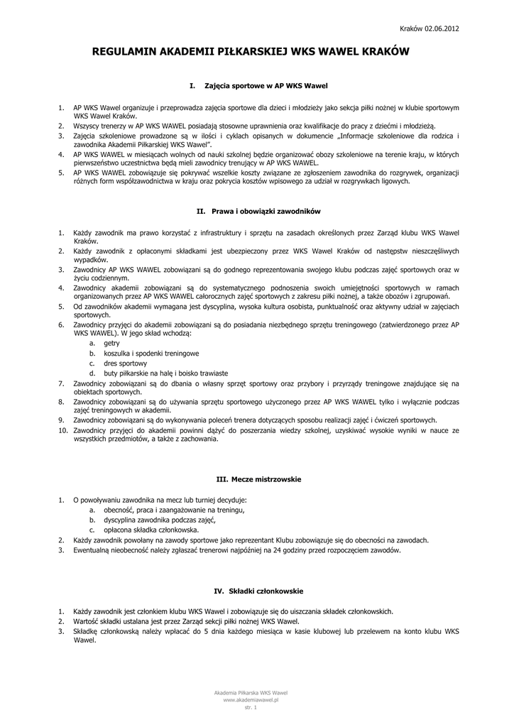 REGULAMIN AKADEMII PIŁKARSKIEJ WKS WAWEL KRAKÓW