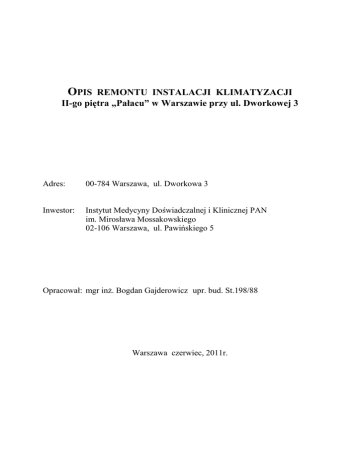 OPIS REMONTU INSTALACJI KLIMATYZACJI II-go piętra „Pałacu” w Warszawie przy ul. Dworkowej 3 Adres: 00-784 Warszawa, ul. Dworkowa 3 Inwestor: Instytut Medycyny Doświadczalnej i Klinicznej PAN im. Mirosława Mossakowskiego 02-106 Warszawa, ul. Pawińskiego 5 Opracował: mgr inż. Bogdan Gajderowicz upr. bud. St.198/88 Warszawa czerwiec, 2011r. OPIS TECHNICZNY 1. Przedmiotem opracowania jest remont instalacji klimatyzacji II-giego piętra „Pałacu” 2. Podstawa opracowania: Projekt Wykonawczy Instalacji chłodniczych, opracowany przez DMS Sernice P.P.H.U. Sp. z o.o. ul. Melomanów 2A lok. 31, 00-712 W-wa, maj 1998r. 3. Opis stanu istniejącego: − Klimakonwektory do których doprowadzana jest woda chłodnicza, wykonano jako elementy dochładzające w pomieszczeniach klimatyzowanych. Pracują na powietrzu obiegowym ze sterowaniem termostatem pokojowym. − Źródłem chłodu jest agregat chłodniczy firmy Trane typ ECGWH 115 zlokalizowany w maszynowni wentylacyjnej w piwnicy, współpracujący ze skraplaczem umieszczonym na dachu budynku. − Z agregatu chłodniczego woda chłodnicza doprowadzana jest do klimakonwektorów siecią rurociągów. Instalacja wody chłodniczej jest wspólna dla wszystkich pomieszczeń biurowych w budynku na wszystkich kondygnacjach. − Zestawienie mocy chłodniczych klimakonwektorów w pomieszczeniach biurowych na II-gim piętrze budynku (numeracja pomieszczeń zgodnie z rysunkiem): strona północna: pom. nr 1 - 862 W - 1 szt. pom. nr 5 - 1149 W - 1 szt. pom. nr 9 - 1049 W - 1 szt. pom. nr 12 - 2430 W - 2 szt. strona południowa: pom. nr 2 - 3185 W - 2 szt. pom. nr 7 - 2904 W - 2 szt. pom. nr 11 - 2877 W - 2 szt. W pomieszczeniach zamontowane są klimakonwektory podsufitowe oraz w pomieszczeniu 306 (owalna sala) – urządzania przypodłogowe. 4. Opis zużucia instalacji klimatyzacyjnej: − układ sterowania klimakonwektorami w większości pomieszczeń działa nieprawidłowo – wymiany wymagają zarówno termostaty jak i zawory regulacyjne; − agregat chłodniczy (chiller) wymaga wykonania prac serwisowych i remontowych: uszczelnienie i uzupełnienie układu glikolowego; − działanie presostatów wymaga sprawdzenia; − elektronika sterująca pracą chillera wymaga wymiany; − klimakonwektory zamontowane w pomieszczeniach wykazują duży stopień zużycia, głośna praca wentylatorów, skorodowane obudowy. 2 5. Przewidywane rozwiązanie: − wymiana klimakonwektorów z zaworami regulacyjnymi i termostatami: klimakonwektory nadstropowe – 9 szt.; urządzenia ścienne – 2 szt. − wykonanie prac serwisowych agregatu chłodniczego oraz wymiana freonu lub wymiana agregatu chłodniczego; − sprawdzenie szczelności układu wody chłodniczej, napełnienie układu wodą uzdatnioną z montażem układu zmiękczania wody; − uszczelnienie układu glikolowego, uzupełnienie czynnika. 3