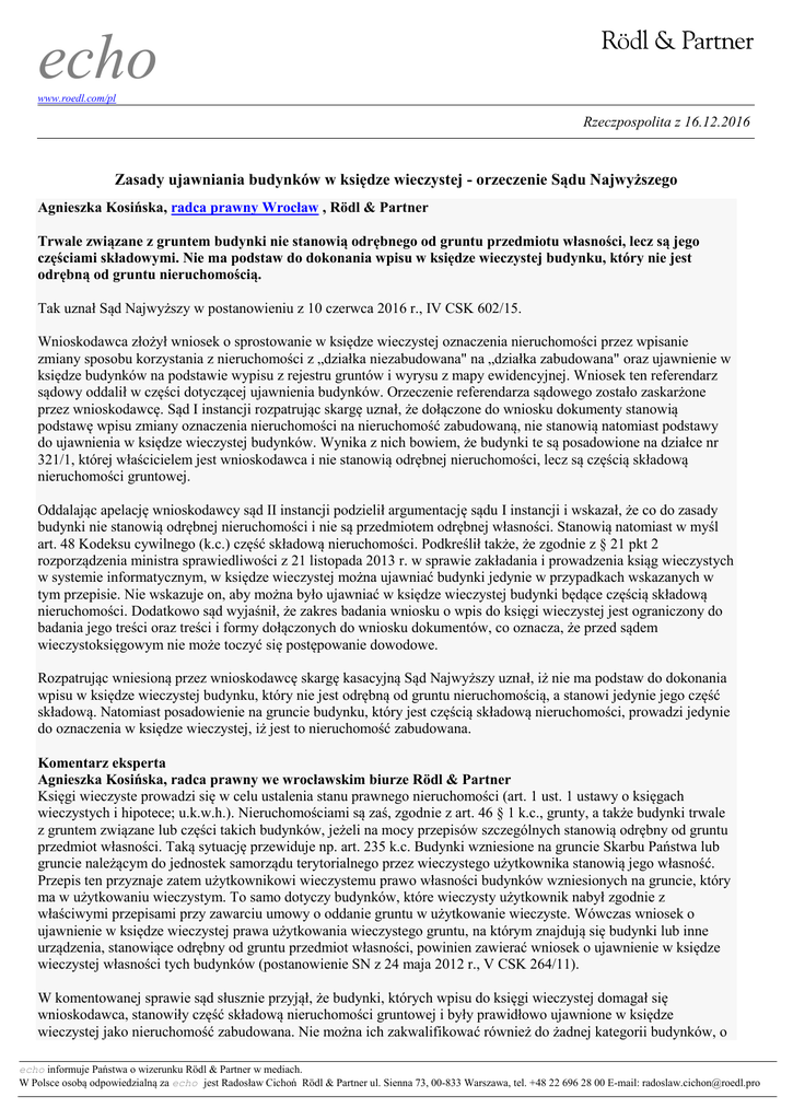 echo www.roedl.com/pl Rzeczpospolita z 16.12.2016 Zasady ujawniania budynków w księdze wieczystej - orzeczenie Sądu Najwyższego Agnieszka Kosińska, radca prawny Wrocław , Rödl & Partner Trwale związane z gruntem budynki nie stanowią odrębnego od gruntu przedmiotu własności, lecz są jego częściami składowymi. Nie ma podstaw do dokonania wpisu w księdze wieczystej budynku, który nie jest odrębną od gruntu nieruchomością. Tak uznał Sąd Najwyższy w postanowieniu z 10 czerwca 2016 r., IV CSK 602/15. Wnioskodawca złożył wniosek o sprostowanie w księdze wieczystej oznaczenia nieruchomości przez wpisanie zmiany sposobu korzystania z nieruchomości z „działka niezabudowana" na „działka zabudowana" oraz ujawnienie w księdze budynków na podstawie wypisu z rejestru gruntów i wyrysu z mapy ewidencyjnej. Wniosek ten referendarz sądowy oddalił w części dotyczącej ujawnienia budynków. Orzeczenie referendarza sądowego zostało zaskarżone przez wnioskodawcę. Sąd I instancji rozpatrując skargę uznał, że dołączone do wniosku dokumenty stanowią podstawę wpisu zmiany oznaczenia nieruchomości na nieruchomość zabudowaną, nie stanowią natomiast podstawy do ujawnienia w księdze wieczystej budynków. Wynika z nich bowiem, że budynki te są posadowione na działce nr 321/1, której właścicielem jest wnioskodawca i nie stanowią odrębnej nieruchomości, lecz są częścią składową nieruchomości gruntowej. Oddalając apelację wnioskodawcy sąd II instancji podzielił argumentację sądu I instancji i wskazał, że co do zasady budynki nie stanowią odrębnej nieruchomości i nie są przedmiotem odrębnej własności. Stanowią natomiast w myśl art. 48 Kodeksu cywilnego (k.c.) część składową nieruchomości. Podkreślił także, że zgodnie z § 21 pkt 2 rozporządzenia ministra sprawiedliwości z 21 listopada 2013 r. w sprawie zakładania i prowadzenia ksiąg wieczystych w systemie informatycznym, w księdze wieczystej można ujawniać budynki jedynie w przypadkach wskazanych w tym przepisie. Nie wskazuje on, aby można było ujawniać w księdze wieczystej budynki będące częścią składową nieruchomości. Dodatkowo sąd wyjaśnił, że zakres badania wniosku o wpis do księgi wieczystej jest ograniczony do badania jego treści oraz treści i formy dołączonych do wniosku dokumentów, co oznacza, że przed sądem wieczystoksięgowym nie może toczyć się postępowanie dowodowe. Rozpatrując wniesioną przez wnioskodawcę skargę kasacyjną Sąd Najwyższy uznał, iż nie ma podstaw do dokonania wpisu w księdze wieczystej budynku, który nie jest odrębną od gruntu nieruchomością, a stanowi jedynie jego część składową. Natomiast posadowienie na gruncie budynku, który jest częścią składową nieruchomości, prowadzi jedynie do oznaczenia w księdze wieczystej, iż jest to nieruchomość zabudowana. Komentarz eksperta Agnieszka Kosińska, radca prawny we wrocławskim biurze Rödl & Partner Księgi wieczyste prowadzi się w celu ustalenia stanu prawnego nieruchomości (art. 1 ust. 1 ustawy o księgach wieczystych i hipotece; u.k.w.h.). Nieruchomościami są zaś, zgodnie z art. 46 § 1 k.c., grunty, a także budynki trwale z gruntem związane lub części takich budynków, jeżeli na mocy przepisów szczególnych stanowią odrębny od gruntu przedmiot własności. Taką sytuację przewiduje np. art. 235 k.c. Budynki wzniesione na gruncie Skarbu Państwa lub gruncie należącym do jednostek samorządu terytorialnego przez wieczystego użytkownika stanowią jego własność. Przepis ten przyznaje zatem użytkownikowi wieczystemu prawo własności budynków wzniesionych na gruncie, który ma w użytkowaniu wieczystym. To samo dotyczy budynków, które wieczysty użytkownik nabył zgodnie z właściwymi przepisami przy zawarciu umowy o oddanie gruntu w użytkowanie wieczyste. Wówczas wniosek o ujawnienie w księdze wieczystej prawa użytkowania wieczystego gruntu, na którym znajdują się budynki lub inne urządzenia, stanowiące odrębny od gruntu przedmiot własności, powinien zawierać wniosek o ujawnienie w księdze wieczystej własności tych budynków (postanowienie SN z 24 maja 2012 r., V CSK 264/11). W komentowanej sprawie sąd słusznie przyjął, że budynki, których wpisu do księgi wieczystej domagał się wnioskodawca, stanowiły część składową nieruchomości gruntowej i były prawidłowo ujawnione w księdze wieczystej jako nieruchomość zabudowana. Nie można ich zakwalifikować również do żadnej kategorii budynków, o echo informuje Państwa o wizerunku Rödl & Partner w mediach. W Polsce osobą odpowiedzialną za echo jest Radosław Cichoń Rödl & Partner ul. Sienna 73, 00-833 Warszawa, tel. +48 22 696 28 00 E-mail: [email protected] których mowa w § 21 pkt 2 rozporządzenia ministra sprawiedliwości z 21 listopada 2013 r. w sprawie zakładania i prowadzenia ksiąg wieczystych w systemie informatycznym. Sąd Najwyższy podkreślił, iż dane katastralne stanowią podstawę ujawnienia w księdze wieczystej tylko danych odnoszących się do nieruchomości. Posadowienie na gruncie budynku, który stanowi jej część składową, prowadzi do zmiany stanu prawnego nieruchomości tylko w tym sensie, że należy ujawnić, iż jest to wtedy nieruchomość zabudowana. W konsekwencji Sąd Najwyższy stwierdził, że z przepisów ustawy o księgach wieczystych, ani z przepisów rozporządzenia z 21 listopada 2013 r., nie wynika możliwość ujawnienia w księdze wieczystej budynków, nie stanowiących odrębnej nieruchomości, lecz będących częścią składową nieruchomości gruntowej. Źródło: http://www.rp.pl/Firma/312169985-Zasady-ujawniania-budynkow-w-ksiedze-wieczystej---orzeczenie-SaduNajwyzszego.html#ap-1 echo informuje Państwa o wizerunku Rödl & Partner w mediach. W Polsce osobą odpowiedzialną za echo jest Radosław Cichoń Rödl & Partner ul. Sienna 73, 00-833 Warszawa, tel. +48 22 696 28 