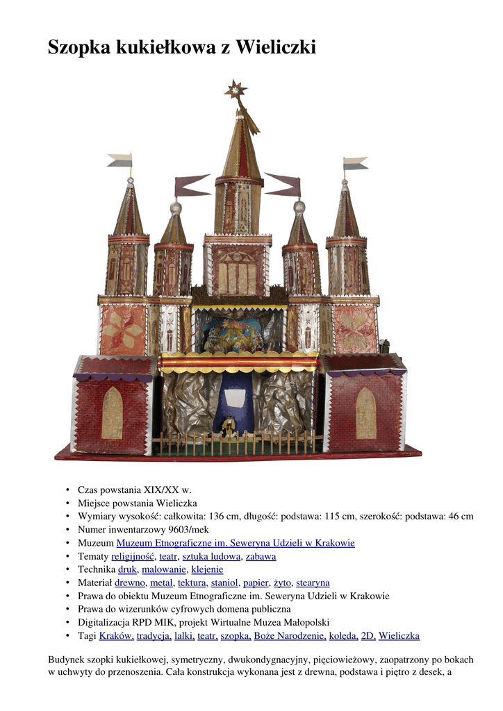 Szopka kukiełkowa z Wieliczki • • • • • • • • • • • • Czas powstania XIX/XX w. Miejsce powstania Wieliczka Wymiary wysokość: całkowita: 136 cm, długość: podstawa: 115 cm, szerokość: podstawa: 46 cm Numer inwentarzowy 9603/mek Muzeum Muzeum Etnograficzne im. Seweryna Udzieli w Krakowie Tematy religijność, teatr, sztuka ludowa, zabawa Technika druk, malowanie, klejenie Materiał drewno, metal, tektura, staniol, papier, żyto, stearyna Prawa do obiektu Muzeum Etnograficzne im. Seweryna Udzieli w Krakowie Prawa do wizerunków cyfrowych domena publiczna Digitalizacja RPD MIK, projekt Wirtualne Muzea Małopolski Tagi Kraków, tradycja, lalki, teatr, szopka, Boże Narodzenie, kolęda, 2D, Wieliczka Budynek szopki kukiełkowej, symetryczny, dwukondygnacyjny, pięciowieżowy, zaopatrzony po bokach w uchwyty do przenoszenia. Cała konstrukcja wykonana jest z drewna, podstawa i piętro z desek, a szkielet z listewek. Ściany z tektury i kartonu: parter oklejony jest czerwonym papierem z wymalowanymi czarnym tuszem „cegiełkami”, a ściany piętra i wież oklejone są wycinankami z papieru, o kształtach okien i gwiazdkowych zdobin. Poszczególne piętra oddzielone są zdobiącymi szopkę poziomymi, wielokolorowymi paskami ze srebrnymi ząbkami po bokach. Wieże boczne o ośmiu ścianach wzmocnionych przy zewnętrznych krawędziach okrągłymi, srebrnymi filarkami ze spiralnymi paskami z gotyckimi hełmami w formie smukłych, ośmiobocznych ostrosłupów zwieńczonych srebrnymi kulami i chorągiewkami nad nimi: czerwonymi, powiewającymi do środka (środkowe), i białoniebieskimi (zewnętrzne), powiewającymi na zewnątrz. Środkowa wieża — osadzona na czworobocznym budyneczku, dziewięcioboczna, z takim samym ostrosłupowym hełmem — zwieńczona jest ośmioramienną gwiazdą z ogonem według popularnego wyobrażenia — gwiazdą betlejemską. W centrum piętra, pomiędzy ścianami z symetrycznymi wycinankami w kształcie sześciopłatkowych kwiatów, znajduje się wnęka wyklejona papierem w kolorze srebrnym, a w jej wnętrzu drukowane na papierze, kolorowe figurki, wycięte według konturów. W głębi drukowany fragment ściany na niebieskim tle z żółtymi gwiazdkami, w okienku ściany dwa kotki oraz na jej tle ptaszek. W środku scena Bożego Narodzenia, czyli Dzieciątko Jezus w żłóbku, Najświętsza Maryja Panna i św. Józef pochyleni nad nim, za nimi osioł i wół, a przed i po bokach: zajączki i postacie adorujące — Trzej Królowie, Krakowiacy, Górale, Górnicy z dziećmi. Nad nimi aniołki unoszą szarfę z napisem: „WESOŁYCH ŚWIĄT”, a w tle pięcioramienna gwiazda z ogonem. Z przodu zwisają pod daszkiem, jak girlandy, kawałki łańcucha choinkowego ze strzępków srebrnej i czerwonej folii aluminiowej. Pierwotnie większość figurek znajdowała się na parterze, ustawione były w głębi, na tle pomiętego, szarego papieru imitującego skałę (obecnie jest tam Góral z owieczkami, figurki prawdopodobnie wtórne, wklejone podczas konserwacji, tak jak część figurek z piętra). Jest to wcześniejszy sposób pokazywania w scenie Narodzenia szopy stajennej jako skalistej groty, a także jej umiejscowienia na parterze szopki kukiełkowej. Jedynie figurki pastuszków i owiec znajdowały się na piętrze. Tam też znajduje się obecnie cała scena Narodzenia pod daszkiem z kłosów zboża, wspartym na dwóch okrągłych słupkach, co ma wyobrażać strzechę na stajence betlejemskiej. Ten eksponat muzealny to przykład wyjątkowej, znanej jedynie w Polsce, kolędniczej szopki kukiełkowej — przenośnego teatrzyku wywodzącego się ze wspólnej dla chrześcijańskiej Europy tradycji jasełek, czyli aranżowania w kościołach w czasie świąt Bożego Narodzenia scenekobrazów przedstawiających nowo narodzone Dzieciątko Jezus w otoczeniu Świętej Rodziny i osób je adorujących. Według Jędrzeja Kitowicza: „Mamy wiadomość z Ewangelii, że Chrystus, narodzony w stajni, złożony był in praesepio. Praesepe znaczy w polskiej mowie żłób. Jasła zaś zowią się zagrody pod żłobem, gdzie słomę na podściel pod konie służącą kładą; Ten co pierwszy wymyślił jasełka (…) rozumiał, że żłób i jasła są imiona jednę rzecz znaczące, tę samę, co słowo łacińskie praesepe, przeto lalkom swoim i fraszkom dziecinnym, którymi wyrażał Narodzenie Chrystusowe, nadał imię jasełka”. W legendzie twórcą pierwszych jasełek był w XIII wieku św. Franciszek, a faktem jest, że zwyczaj ten upowszechnił się w chrześcijańskich krajach europejskich już w średniowieczu za sprawą zakonów franciszkańskich. W Polsce w XVIII wieku, dla uatrakcyjnienia ustawianych w kościołach jasełek, braciszkowie zakonni zaczęli wprowadzać między nie kukiełki poruszane z ukrycia, a przedstawiające scenki świeckie, bynajmniej nie związane z Ewangelią, za to wprowadzające wesołość nieprzystającą do powagi świątyni. Zakaz urządzania takich przedstawień w kościołach wydany w 1736 roku przez księcia Teodora Czartoryskiego, biskupa poznańskiego (1704—1768) dał impuls do rozwoju szopki kukiełkowej — wędrownego teatrzyku bożonarodzeniowego, urządzanego w przenośnym, drewnianym budyneczku, nazywanym szopką. Takie budynki szopek w swoim założeniu miały odwzorowywać kościół, w którym inscenizowano jasełka, a więc dodawano po bokach, początkowo dwie, następnie w większej liczbie — wieże. I niezależnie od liczby pięter, wież, kopuł, wycinanek, zdobin, czasem bardziej przypominających fantazyjne pałace, zawsze w centralnej części umieszczano scenę jasełkową — jakby przeniesioną z kościoła — figurki pod słomianym daszkiem wspartym na filarkach, czyli skromną stajenkę betlejemską, tak jak w opisywanej szopce wielickiej. Stanisław i Tadeusz Estreicherowie, kryjący się pod pseudonimem dr Jan Krupski w książeczce pt. Szopka krakowska w 1904 roku pisali: „… s