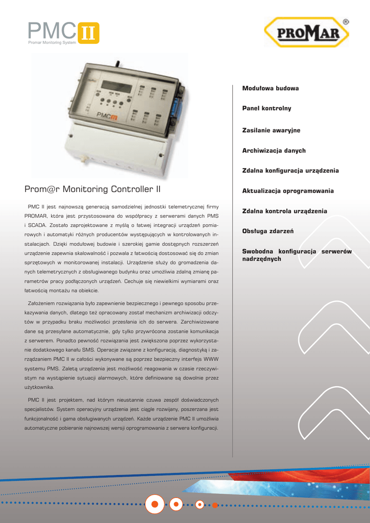 Modułowa budowa Panel kontrolny Zasilanie awaryjne Archiwizacja danych Zdalna konfiguracja urządzenia Prom@r Monitoring Controller II PMC II jest najnowszą generacją samodzielnej jednostki telemetrycznej firmy PROMAR, która jest przystosowana do współpracy z serwerami danych PMS i SCADA. Zostało zaprojektowane z myślą o łatwej integracji urządzeń pomiarowych i automatyki różnych producentów występujących w kontrolowanych in- Aktualizacja oprogramowania Zdalna kontrola urządzenia Obsługa zdarzeń stalacjach. Dzięki modułowej budowie i szerokiej gamie dostępnych rozszerzeń urządzenie zapewnia skalowalność i pozwala z łatwością dostosować się do zmian sprzętowych w monitorowanej instalacji. Urządzenie służy do gromadzenia danych telemetrycznych z obsługiwanego budynku oraz umożliwia zdalną zmianę parametrów pracy podłączonych urządzeń. Cechuje się niewielkimi wymiarami oraz łatwością montażu na obiekcie. Założeniem rozwiązania było zapewnienie bezpiecznego i pewnego sposobu przekazywania danych, dlatego też opracowany został mechanizm archiwizacji odczytów w przypadku braku możliwości przesłania ich do serwera. Zarchiwizowane dane są przesyłane automatycznie, gdy tylko przywrócona zostanie komunikacja z serwerem. Ponadto pewność rozwiązania jest zwiększona poprzez wykorzystanie dodatkowego kanału SMS. Operacje związane z konfiguracją, diagnostyką i zarządzaniem PMC II w całości wykonywane są poprzez bezpieczny interfejs WWW systemu PMS. Zaletą urządzenia jest możliwość reagowania w czasie rzeczywistym na wystąpienie sytuacji alarmowych, które definiowane są dowolnie przez użytkownika. PMC II jest projektem, nad którym nieustannie czuwa zespół doświadczonych specjalistów. System operacyjny urządzenia jest ciągle rozwijany, poszerzana jest funkcjonalność i gama obsługiwanych urządzeń. Każde urządzenie PMC II umożliwia automatyczne pobieranie najnowszej wersji oprogramowania z serwera konfiguracji. Swobodna konfiguracja serwerów nadrzędnych Modułowa budowa Wymiary Urządzenie posiada sześć kanałów komunikacyjnych, które można wyposażyć w moduły rozszerzeń umożliwiające obsługę wybranego interfejsu elektrycznego. Panel kontrolny Wbudowany panel kontrolny umożliwia manualną obsługę PMC II. Natomiast wyświetlacz LCD pokazuje najważniejsze informacje o stanie urządzenia. Pozwala to instalatorowi na konfigurację i diagnostykę urządzenia. Zasilanie awaryjne PMC II może być wyposażone w moduł zasilania awaryjnego. W przypadku zaniku zasilania moduł pozwala na bezpieczne wyłączenie urządzenia po uprzednim powiadomieniu systemu nadrzędnego. Jeżeli wymagana jest ciągła praca urządzenia, zapewni to zewnętrzne zasilanie awaryjne. Archiwizacja danych Przy braku połączenia z systemem nadrzędnym (np. awaria usługi GPRS) urządzenie automatycznie przechodzi w tryb archiwizowania danych. Wszystkie odczytywane dane opatrzone są znacznikami czasowymi i zapisywane w lokalnej pamięci urządzenia (ok. 3000 odczytów). Po odzyskaniu połączenia z systemem nadrzędnym następuje proces przekazania danych do serwera. Szerokość 207 mm Wysokość 185 mm Głębokość 119 mm Temperatura pracy -20°C ÷ +50°C Klasa ochrony IP65 Komunikacja z serwerem GSM 850/900/1800/1900 MHz Zasilanie 15 V DC max. 500 mA Ilość obsługiwanych modułów rozszerzeń 6 P2COM-232 RS232 P2COM-485 RS485 (32 slave) P2COM-MB4 MBUS (4 slave) P2COM-OPT Optoizolowany Wejścia Dwustanowe ze stykami bezpotencjałowymi 2 Wyjścia Dwustanowe typu OC; max. 24 V 100 mA 1 Interfejsy obsługiwane przez moduły rozszerzeń Obsługiwane protokoły m.in.: MODBUS; ECL 200/300; ECL 2000; SNP; NCP; Xenta; SBUS_DATA; VITOTRONIC; MULTICALL; MBUS; GAZMODEM; EN 62056-21 Regulatory Ciepłomierze Satchwell Seria IAC Seria MMC Seria MN Apator LQM LQM II LQM III TAC Seria Xenta Metron Metronic 3 Metronic 4 Danfoss ECL200 ECL300 ECL2000 Saia Seria PCD Actaris Siemens RVA 63.242 RVA 46.223 RVA 46.531 RVD 230 RVD 240 CF-Echo CF-50 CF-51 CF-55 ThermiFlu CF-Combi CF-MAX Kamstrup Multical 66C Multical III Multical 601 Multical 401 Danfoss EEM-1 EEM-C Satronic PolluStat PolluTherm Mas Cieplik2000 Aquatherm Seria Supercal Sharky ABB F2 Zdalna konfiguracja urządzenia Oprogramowanie PMC II pozwala na zdalną zmianę konfiguracji oraz zarządzanie bez potrzeby fizycznej dostępności do urządzenia. Za pomocą interfejsu WWW można skonfigurować: typ obsługiwanego urządzenia, odczytywane parametry, definicje alarmów. Możliwa jest zdalna rekonfiguracja urządzenia, np. po wymianie ciepłomierza bądź regulatora. Aktualizacja oprogramowania System operacyjny urządzenia jest ciągle rozwijany. PMC II umożliwia zdalne pobieranie najnowszej wersji oprogramowania. Zdalna kontrola urządzenia Frisko RX-FOX Samson Seria Trovis (protokół Modbus) Control MicroXL i inne Jonhson Controls Seria FX Urządzenie jest kontrolowane z systemu nadrzędnego. Pozwala to służbom utrzymania ruchu na kompleksowe zarządzanie działaniem PMC II. Obsługa zdarzeń PMC II zapewnia obsługę alarmów i przekroczeń. Możliwe jest zdefiniowanie warunków alarmowych dla odczytywanych parametrów. System nadrzędny zostanie powiadomiony o alarmie, gdy warunek spełniony będzie przez ściśle określony czas. Innym rodzajem zdarzenia jest kontrola zakresu zmiany wartości parametru. Dla zapewnienia maksymalnego bezpieczeństwa informacje o alarmach mogą być wysyłane awaryjnym kanałem SMS. Swobodna konfiguracja serwerów nadrzędnych PMC II pozwala na dowolne zdefiniowanie wybranego serwera danych, np. dowolny serwer PMS, serwery SCADA. WOJEWÓDZTWO KUJAWSKO-POMORSKIE Inne liczniki Gazomierze Każdy z dostępnym impulsatorem Rejestrator gazu Każdy z protokołem GazModem 1 GazModem 2 Liczniki energii elektrycznej Każdy z dostępnym impulsatorem Każdy z wyjściem zgodnym z EN 62056-21 Wodomierze Każdy z dostępnym impulsatorem Każdy z wyjściem 