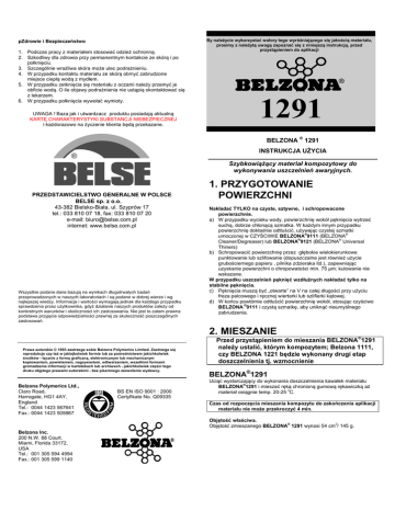 pZdrowie i Bezpieczeństwo 1. Podczas pracy z materiałem stosować odzież ochronną. 2. Szkodliwy dla zdrowia przy permanentnym kontakcie ze skórą i po połknięciu. 3. Szczególnie wrażliwa skóra może ulec podrażnieniu. 4. W przypadku kontaktu materiału ze skórą obmyć zabrudzone miejsce ciepłą wodą z mydłem. 5. W przypadku zetknięcia się materiału z oczami należy przemyć je obficie wodą. O ile objawy podrażnienia nie ustąpią skontaktować się z lekarzem. 6. W przypadku połknięcia wywołać wymioty. UWAGA ! Baza jak i utwardzacz produktu posiadają aktualną KARTĘ CHARAKTERYSTYKI SUBSTANCJI NIEBEZPIECZNEJ i każdorazowo na życzenie klienta będą przekazane. By należycie wykorzystać walory tego wyróżniającego się jakością materiału, prosimy z należytą uwagą zapoznać się z niniejszą instrukcją, przed przystąpieniem do aplikacji 1291 BELZONA ® 1291 INSTRUKCJA UŻYCIA Szybkowiążący materiał kompozytowy do wykonywania uszczelnień awaryjnych. PRZEDSTAWICIELSTWO GENERALNE W POLSCE BELSE sp. z o.o. 43-382 Bielsko-Biała, ul. Szyprów 17 tel.: 033 810 07 18, fax: 033 810 07 20 e-mail: [email protected] internet: www.belse.com.pl Wszystkie podane dane bazują na wynikach długotrwałych badań przeprowadzonych w naszych laboratoriach i są podane w dobrej wierze i wg najlepszej wiedzy. Informacje i wartości wymagają jednak dla każdego przypadku sprawdzenia przez użytkownika, gdyż działanie naszych produktów zależy od konkretnych warunków i okoliczności ich zastosowania. Nie jest to zatem prawna podstawa przyjęcia odpowiedzialności prawnej za skuteczność poszczególnych zastosowań. 1. PRZYGOTOWANIE POWIERZCHNI Nakładać TYLKO na czyste, sztywne, i schropowacone powierzchnie. a) W przypadku wycieku wody, powierzchnię wokół pęknięcia wytrzeć suchą, dobrze chłonącą szmatka. W każdym innym przypadku powierzchnię dokładnie odtłuścić, używając czystej szmatki ® ® umoczonej w CZYŚCIWIE BELZONA 9111 (BELZONA ® ® Cleaner/Degreaser) lub BELZONA 9121 (BELZONA Universal Thiners) b) Schropowacić powierzchnię przez głębokie wielokierunkowe punktowanie lub szlifowanie (dopuszczalne jest również użycie grubościernego papieru , pilnika zdzieraka itd.), zapewniając uzyskanie powierzchni o chropowatości min. 75 µm; kulowanie nie wskazane. W przypadku uszczelnień pęknięć wzdłużnych nakładać tylko na stabilne pęknięcia. c) Pęknięcia muszą być „otwarte” na V na całej długości przy użyciu freza palcowego i ręcznej wiertarki lub szlifierki kątowej. d) W końcu powtórnie odtłuścić powierzchnię wokół, stosując czyściwo ® BELZONA 9111 i czystą szmatkę, aby uniknąć nieumyślnego zabrudzenia. 2. MIESZANIE Prawa autorskie © 1993 zastrzega sobie Belzona Polymerics Limited. Zastrzega się reprodukcje czy też w jakiejkolwiek formie lub za pośrednictwem jakichkolwiek środków - łącznie z formą graficzną, elektronicznym lub mechanicznym kopiowaniem, powielaniem, nagrywaniem, odtwarzaniem, wszelkimi formami gromadzenia informacji w kartotekach lub archiwach - jakichkolwiek części tego druku objętego prawami autorskimi - bez pisemnego zezwolenia wydawcy. Belzona Polymerics Ltd., Claro Road, Harrogate, HG1 4AY, England Tel.: 0044 1423 567641 Fax.: 0044 1423 505967 BS EN ISO 9001 : 2000 Certyfikate No. Q09335 Przed przystąpieniem do mieszania BELZONA®1291 należy ustalić, którym kompozytem; Belzona 1111, czy BELZONA 1221 będzie wykonany drugi etap doszczelnienia tj. wzmocnienie BELZONA®1291 Uciąć wystarczający do wykonania doszczelnienia kawałek materiału ® BELZONA 1291 i mieszać ręką chronioną gumową rękawiczką aż o materiał osiągnie temp. 20-25 C. Czas od rozpoczęcia mieszania kompozytu do zakończenia aplikacji materiału nie może przekroczyć 4 min. Objętość właściwa. ® 3 Objętość zmieszanego BELZONA 1291 wynosi 54 cm / 145 g. Belzona Inc. 200 N.W. 88 Court. Miami, Florida 33172, USA Tel.: 001 305 594 4994 Fax.: 001 305 599 1140 BELZONA®1221 4. CZYSZCZENIE a) Przeciąć do końca obydwa opakowania Bazy i Utwardzacza. b) Używając prostego ostrza aplikatora lub innego narzędzia mieszającego wycisnąć z opakowania na płytę do mieszania oba składniki. c) Oba składniki zmieszać dokładnie, aż do uzyskania jednolitej, szarej masy, bez smug i wtrąceń. ® Od momentu wymieszania, BELZONA 1221 musi być użyty w czasie podanym w tabeli, zależnie od temperatury otoczenia: UWAGA: Wyposażenie takie jak szpatułki oraz płyty służące do mieszania powinny być wyczyszczone natychmiast po ich użyciu czystą szmatką namoczoną w alternatywnych środkach ® odtłuszczających, ponieważ BELZONA 9111 Cleaner/Degreaser nie rozpuszcza kompozytów. Plastikowe aplikatory, szpatułki oraz płyty służące do mieszania mogą być ponownie użyte po wysuszeniu. Temperatura 5OC 15OC 25OC materiał należy zużyć w czasie 5 min. 4 min. 3 min. UWAGI: Mieszanie małych ilości. ® Przy mieszaniu mniejszych ilości BELZONA 1221 niż cały pojemnik należy zachować następujące proporcje mieszania: Objętościowo - 1 części Bazy do 1 części Utwardzacza, Wagowo - 2 części Bazy do 1 części Utwardzacza Pojemność objętościowa. ® 3 Objętość zmieszanego BELZONA 1221 wynosi 68.75 cm / 0,125 kg BELZONA®1111 Wyłożyć całą zawartość pojemników z materiałem bazowym i z utwardzaczem na płytę do mieszania. Oba materiały zmieszać, aż do uzyskania szarej jednolitej masy, bez smug i wtrąceń. ® Od momentu wymieszania, BELZONA 1111 musi być użyty w czasie podanym w tabeli, zależnie od temperatury otoczenia: Temperatura 5OC 15OC 25OC materiał należy zużyć w czasie 35 min. 25 min. 15 min. UWAGI: Mieszanie w niskich temperaturach. O Aby ułatwić mieszanie materiałów w temperaturze poniżej 5 C, należy ogrzać oba składniki tj. materiał bazowy i utwardzacz, aż uzyskają O temperaturę 20-25 C. Mieszanie małych ilości. ® Przy mies