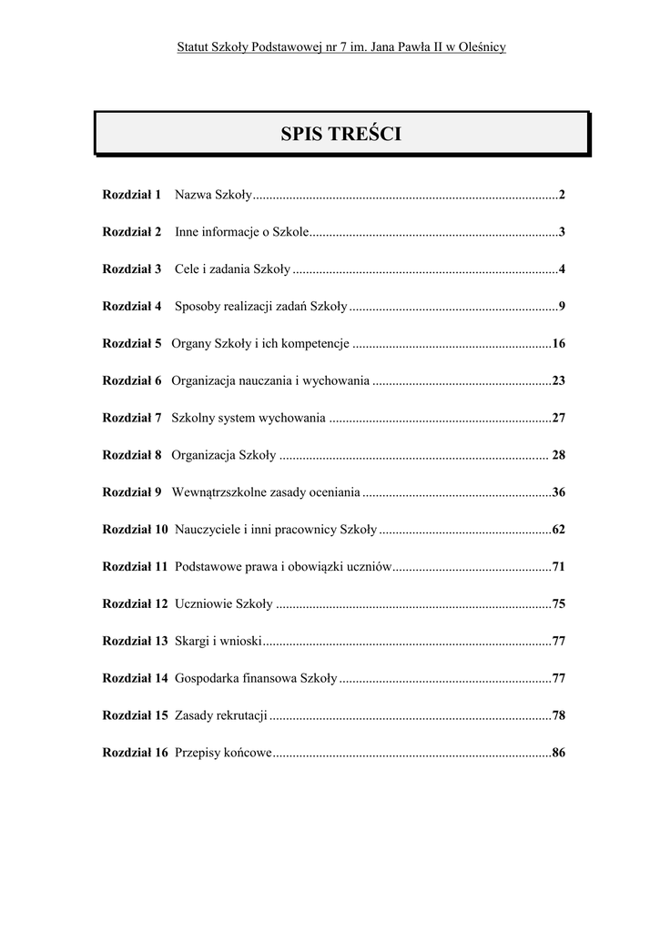 Statut Szkoły Podstawowej nr 7 im. Jana Pawła II w Oleśnicy SPIS TREŚCI Rozdział 1 Nazwa Szkoły ............................................................................................ 2 Rozdział 2 Inne informacje o Szkole...........................................................................3 Rozdział 3 Cele i zadania Szkoły ................................................................................4 Rozdział 4 Sposoby realizacji zadań Szkoły ............................................................... 9 Rozdział 5 Organy Szkoły i ich kompetencje ............................................................ 16 Rozdział 6 Organizacja nauczania i wychowania ...................................................... 23 Rozdział 7 Szkolny system wychowania ...................................................................27 Rozdział 8 Organizacja Szkoły ............................................................................. .... 28 Rozdział 9 Wewnątrzszkolne zasady oceniania ......................................................... 36 Rozdział 10 Nauczyciele i inni pracownicy Szkoły .................................................... 62 Rozdział 11 Podstawowe prawa i obowiązki uczniów................................................ 71 Rozdział 12 Uczniowie Szkoły ................................................................................... 75 Rozdział 13 Skargi i wnioski ....................................................................................... 77 Rozdział 14 Gospodarka finansowa Szkoły ................................................................ 77 Rozdział 15 Zasady rekrutacji ..................................................................................... 78 Rozdział 16 Przepisy końcowe .................................................................................... 86 Statut Szkoły Podstawowej nr 7 im. Jana Pawła II w Oleśnicy ROZDZIAŁ 1 NAZWA SZKOŁY §1 PODSTAWY PRAWNE 1. Szkoła Podstawowa nr 7 im. Jana Pawła II w Oleśnicy, zwana dalej Szkołą, działa na podstawie: 1.1. Ustawy z dnia 7.09.1991 r. o systemie oświaty (Dz. U. z 2004 r. Nr 256, poz. 2572 ze zmianami), 1.2. Rozporządzenia Ministra Edukacji Narodowej z dnia 21 maja 2001 r. w sprawie ramowych statutów publicznego przedszkola i publicznych szkół (Dz. U. Nr 61, poz. 624 z późn. zm.), 1.3. Uchwały Nr VII/45/99 Rady Miejskiej Oleśnicy z dnia 26 marca 1999 r. w sprawie przekształcenia publicznej Szkoły Podstawowej nr 7 w Oleśnicy, 1.4. Uchwały Nr 150/III/99 Zarządu Miejskiego Oleśnicy z dnia 1 kwietnia 1999 r. w sprawie nadania aktu założycielskiego publicznej szkole podstawowej, jako jednostce organizacyjnej Gminy Miejskiej Oleśnicy, 1.5. Uchwały Nr XI/78/2003 Rady Miasta Oleśnicy z dnia 26 września 2003 r. w sprawie nadania Szkole Podstawowej nr 7 w Oleśnicy imienia Jana Pawła II, 1.6. Zarządzenia Nr 254/IV/2003 Burmistrza Miasta Oleśnicy z dnia 1 października 2003 r. w sprawie zmiany aktu założycielskiego Szkoły Podstawowej nr 7 Oleśnicy, dla której organem prowadzącym jest Miasto Oleśnica. Strona 2 z 87 Statut Szkoły Podstawowej nr 7 im. Jana Pawła II w Oleśnicy PRZEPISY OGÓLNE 1. Szkoła Podstawowa nr 7 w Oleśnicy, zwana dalej Szkołą, jest placówką publiczną. 1.1. prowadzi bezpłatne nauczanie i wychowanie w zakresie co najmniej podstawy programowej kształcenia ogólnego, 1.2. przeprowadza rekrutację dzieci w oparciu o zasadę powszechnej dostępności, 1.3. zatrudnia nauczycieli oraz innych pracowników posiadających kwalifikacje określone w odrębnych przepisach. 2. Siedzibą Szkoły jest budynek przy ulicy 11 Listopada 10. 3. Szkoła posiada salę gimnastyczną znajdującą się przy ulicy Żeromskiego 10. 4. Organem prowadzącym Szkoły jest Miasto Oleśnica. 5. Nadzór pedagogiczny nad Szkołą sprawuje Dolnośląski Kurator Oświaty we Wrocławiu. §2 1. Uchwałą nr XI / 78 / 2003 Rady Miasta Oleśnicy z dnia 26 września 2003 r. Szkole nadano imię: Jana Pawła II, a dzień 16 października jest Świętem Szkoły. 2. Szkoła posiada własny sztandar i ceremoniał. §3 1. Nazwa Szkoły jest używana przez w pełnym brzmieniu. 2. Na pieczęciach i stemplach może być używany czytelny skrót nazwy. ROZDZIAŁ 2 INNE INFORMACJE O SZKOLE §4 1. Czas trwania cyklu kształcenia w Szkole wynosi 6 lat. 2. W Szkole prowadzi się klasy zerowe. 3. W Szkole mogą być prowadzone oddziały przedszkolne. 4. Szkoła prowadzi świetlicę oraz zapewnia funkcjonowanie stołówki. Strona 3 z 87 Statut Szkoły Podstawowej nr 7 im. Jana Pawła II w Oleśnicy 5. Szkoła należy do Sieci Szkół Promujących Zdrowie oraz Rodziny Szkół Imienia Jana Pawła II. ROZDZIAŁ 3 CELE I ZADANIA SZKOŁY §5 1. Szkoła realizuje cele i zadania określone w ustawie o systemie oświaty, przepisach wydanych na jej podstawie oraz innych aktach prawnych regulujących pracę placówek oświatowych. 2. Szkoła opracowała Misję Szkoły i Wizję Szkoły. Stanowią one integralną część oferty edukacyjnej, a osiągnięcie zawartych w nich założeń jest jednym z głównych celów działalności Szkoły. §6 Misja Szkoły We wszystkich działaniach kierujemy się poszanowaniem praw i godności człowieka. Wychowujemy uczniów w duchu uniwersalnych wartości moralnych, tolerancji, patriotyzmu i solidarności. Celem wszystkich działań jest dobro podopiecznych, ich intelektualny, emocjonalny, społeczny, estetyczny i fizyczny rozwój, a także ich dalszy los. Przygotowujemy uczniów do świadomego i racjonalnego funkcjonowania w świecie ludzi dorosłych oraz do pełnienia ważnych ról społecznych. Współdziałamy z rodzicami, którzy są najlepszymi sojusznikami nauczycieli, zwłaszcza wychowawców. Wizja Szkoły „W wychowaniu chodzi właśnie o to, ażeby człowiek stawał się coraz bardziej człowiekiem. O to, żeby bardziej był, a nie tylko miał, aby więc przez to, co ma, umiał bardziej i pełniej być c