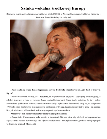 Sztuka wokalna środkowej Europy Rozmowa z Antonim Malczakiem, dyrektorem MCK SOKÓŁ w Nowym Sączu oraz dyrektorem Festiwalu i Konkursu Sztuki Wokalnej im. Ady Sari - Jakie nadzieje wiąże Pan z tegoroczną edycją Festiwalu i Konkursu im. Ady Sari w Nowym Sączu? - Przede wszystkim wierzę, że - podobnie jak w poprzednich edycjach - usłyszymy świetne głosy, a młodzi śpiewacy wyjadą z Nowego Sącza usatysfakcjonowani. Mam także nadzieję, że jury będzie zadowolone, publiczność radosna, a sztuka wokalna dzięki sądeckiemu festiwalowi, który się już odbywa od 1985 roku i jest najstarszym nieprzerwanym konkursem w Polsce, będzie się rozwijać w kraju i za granicą. Bo - jak wiadomo - od lat w konkursie mamy zagranicznych uczestników. - Obserwuje Pan kariery laureatów różnych edycji konkursu? - Oczywiście. Utrzymujemy stały kontakt z laureatami. Nie ma roku, aby nie byli oni zapraszani do Sącza, a to na koncert noworoczny, albo - jak w zeszłym roku - na turę koncertową, podczas której wystąpili w dziesięciu miastach Małopolski. - Wielu z laureatów konkursu odniosło sukcesy, jak chociażby Iwona Sobotka, Iwona Hossa, Zofia Kilanowicz, Tomasz Kuk... - ... i Andrzej Dobber, laureat pierwszej edycji, który będzie w tym roku jurorem naszego konkursu. Jak wiadomo, w świat sztuki Andrzej Dobber startował właśnie z Nowego Sącza, gdzie wcale nie dostał pierwszej nagrody. - W tym roku konkurs laureatów odbędzie się w ramach programu unijnego. - Pieniądze unijne udało nam się zdobyć już po raz drugi; teraz i podczas poprzedniej edycji, dwa lata temu, zrealizowanej w ramach projektu unijnego „Sztuka wokalna Europy Środkowej”. W tym roku rozpoczęliśmy realizację projektu unijnego „Młoda publiczność w operze – przystąpienie Małopolskiego Centrum Kultury SOKÓŁ do organizacji Opera Europa”. MCK SOKÓŁ jako pierwsza instytucja kultury w Małopolsce a trzecia w Polsce, po Teatrze Wielkim – Operze Narodowej w Warszawie i Teatrze Wielkim w Łodzi przystąpiła do organizacji sieciowej Opera Europa, stowarzyszenia z siedzibą w Brukseli, zrzeszającego 107 członków z 33 krajów europejskich. - Kim są członkowie tej organizacji? - To teatry operowe, festiwale wokalne, fundacje, stowarzyszenia oraz centra kultury zajmujące się promocją sztuki operowej. Celem przystąpienia do organizacji jest nawiązanie i rozwój kontaktów, pozyskanie wiedzy, umiejętności i doświadczeń w zakresie dobrych praktyk europejskich, promujących przedsięwzięcia artystyczne, ze szczególnym uwzględnieniem muzycznych, wśród dzieci i młodzież w wieku 7-19 lat Małopolski oraz transfer wiedzy, doświadczeń i umiejętności na grunt instytucji małopolskich, działających w obszarze kultury. - W ramach tego projektu zrealizowany zostanie m.in. koncert laureatów tegorocznego Festiwalu Sztuki Wokalnej im. Ady Sari. - Niezbędnym warunkiem merytorycznym przystąpienia do sieci jest przygotowanie minimum jednej produkcji w dziedzinie opery rocznie. W przyszłym roku, wiosną - po raz pierwszy w Polsce – w Nowym Sączu, zorganizujemy European Opera Days. Ten promocyjny event weekendowy, odbędzie się w 21 miastach Europy (w Polsce nie ma dotychczas instytucji, która podjęła się jego realizacji). Jego celem jest otwarcie się na sztukę operową i propagowanie jej wśród europejskich społeczeństw w atrakcyjnej i przystępnej formule. - Konkursowi, jak zwykle towarzyszy festiwal pełen różnorodnych wydarzeń muzycznych. Co Pan poleciłby przede wszystkim? - Staramy się utrzymać pomysł z poprzedniej edycji, a więc prezentowanie sztuki wokalnej Europy Środkowej. Dwa lata temu był to przegląd spektakli operowych z pięciu państw, w tym roku jest skromniej, ale przedstawimy dwa wielkie oratoria, które nigdy w Nowym Sączu nie były prezentowane. Oratorium Dvoraka „Święta Ludmiła” zainauguruje festiwal i będzie to polskie prawykonanie tego utworu. Przed publicznością stanie ponad stu wykonawców: chór Filharmonii z Pragi i orkiestra Filharmonii z Brna. 5 maja natomiast usłyszymy zaś „Siedem Bram Jerozolimy” Krzysztofa Pendereckiego. - Utwór zabrzmi pod batutą kompozytora, który nie pierwszy raz będzie gościł na festiwalu w Nowym Sączu. - Kompozytor trzykrotnie już dyrygował na naszym festiwalu. Tym razem poprowadzi NOSPR i chóry Filharmonii Krakowskiej oraz Polskiego radia z Krakowa. Jako soliści wystąpią laureaci różnych edycji naszego konkursu, zaś narratorem będzie Jerzy Trela. Utwór wykonany zostanie w chwili szczególnej, w kilka dni po beatyfikacja Jana Pawła II. Warto przypomnieć, że na 20-lecie pontyfikatu Jana Pawła II zaprezentowaliśmy „Credo” Pendereckiego, dedykując je papieżowi. Było to trzecie wykonanie po USA i Krakowie. Teraz w tym samym kościele, pięć dni po beatyfikacji, zabrzmi „Siedem bram Jerozolimy”. Utworem tym będziemy wspominać, że Jan Paweł II był pierwszym papieżem, który modlił się pod ścianą płaczu w Jerozolimie. ROZMAWIAŁA: AGNIESZKA MALATYŃSKA-STANKIEWICZ FOT. KOW Dziennik Polski – Kurier Festiwalowy nr 1, 23.04.2011 r.