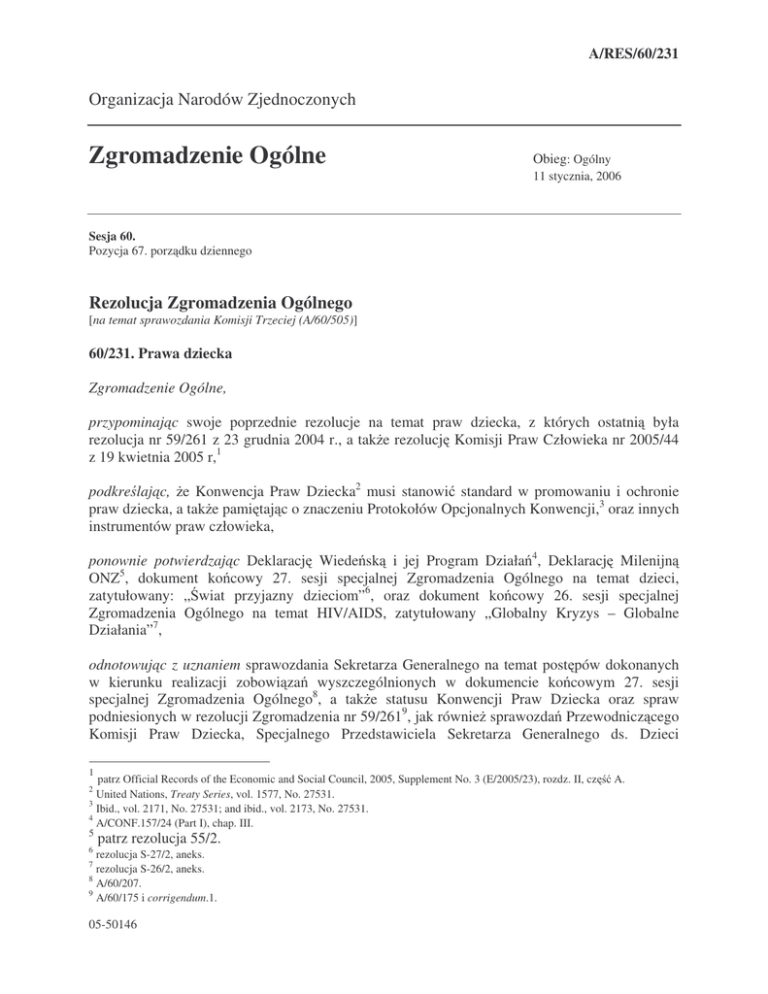 A/RES/60/231 Organizacja Narodów Zjednoczonych Zgromadzenie Ogólne Obieg: Ogólny 11 stycznia, 2006 Sesja 60. Pozycja 67. porz dku dziennego Rezolucja Zgromadzenia Ogólnego [na temat sprawozdania Komisji Trzeciej (A/60/505)] 60/231. Prawa dziecka Zgromadzenie Ogólne, przypominaj c swoje poprzednie rezolucje na temat praw dziecka, z których ostatni była rezolucja nr 59/261 z 23 grudnia 2004 r., a tak e rezolucj Komisji Praw Człowieka nr 2005/44 z 19 kwietnia 2005 r,1 podkre laj c, e Konwencja Praw Dziecka2 musi stanowi standard w promowaniu i ochronie praw dziecka, a tak e pami taj c o znaczeniu Protokołów Opcjonalnych Konwencji,3 oraz innych instrumentów praw człowieka, ponownie potwierdzaj c Deklaracj Wiede sk i jej Program Działa 4, Deklaracj Milenijn ONZ5, dokument ko cowy 27. sesji specjalnej Zgromadzenia Ogólnego na temat dzieci, zatytułowany: „ wiat przyjazny dzieciom”6, oraz dokument ko cowy 26. sesji specjalnej Zgromadzenia Ogólnego na temat HIV/AIDS, zatytułowany „Globalny Kryzys – Globalne Działania”7, odnotowuj c z uznaniem sprawozdania Sekretarza Generalnego na temat post pów dokonanych w kierunku realizacji zobowi za wyszczególnionych w dokumencie ko cowym 27. sesji specjalnej Zgromadzenia Ogólnego8, a tak e statusu Konwencji Praw Dziecka oraz spraw podniesionych w rezolucji Zgromadzenia nr 59/2619, jak równie sprawozda Przewodnicz cego Komisji Praw Dziecka, Specjalnego Przedstawiciela Sekretarza Generalnego ds. Dzieci 1 patrz Official Records of the Economic and Social Council, 2005, Supplement No. 3 (E/2005/23), rozdz. II, cz United Nations, Treaty Series, vol. 1577, No. 27531. 3 Ibid., vol. 2171, No. 27531; and ibid., vol. 2173, No. 27531. 4 A/CONF.157/24 (Part I), chap. III. 2 5 6 patrz rezolucja 55/2. rezolucja S-27/2, aneks. 7 rezolucja S-26/2, aneks. 8 A/60/207. 9 A/60/175 i corrigendum.1. 05-50146 A. A/RES/60/231 i Konfliktów Zbrojnych10, oraz studium przemocy wobec dzieci autorstwa Niezale nego Eksperta ONZ11, potwierdzaj c ponownie, e pierwszoplanowym czynnikiem we wszystkich działaniach dotycz cych dzieci b dzie najlepiej poj ty interes dziecka, uznaj c znaczenie wł czenia punktu widzenia ochrony dziecka do wszystkich działa z zakresu praw człowieka, zgodnie z tym, co podkre laj dokumenty ko cowe Szczytu wiatowego z roku 2005, gł boko zaniepokojone faktem, e sytuacja dzieci w wielu cz ciach wiata pozostaje krytyczna, w rodowisku wzrastaj cej globalizacji, b d c wynikiem trwałego ubóstwa, nierówno ci społecznych, nieodpowiednich warunków socjalnych i ekonomicznych, pandemii – w szczególno ci HIV/AIDS, malarii i gru licy – zniszcze rodowiska, kl sk ywiołowych, konfliktów zbrojnych, przesiedle , przemocy, nadu y , wyzysku, handlu dzie mi i ich organami, prostytucji w ród dzieci, pornografii dzieci cej oraz dzieci cej turystyki seksualnej, zaniedbania, analfabetyzmu, głodu, nietolerancji, dyskryminacji, rasizmu, ksenofobii, nierówno ci płci, niepełnosprawno ci i nieodpowiedniej ochrony prawnej, a tak e przekonane, e niezb dne s pilne i skuteczne działania w skali krajowej i mi dzynarodowej, podkre laj c potrzeb wł czenia perspektywy płci w główny nurt wszystkich programów dotycz cych dzieci, a tak e uznaj c dziecko za osob posiadaj c przysługuj ce jej prawa we wszystkich programach dotycz cych dzieci, I Wdra anie Konwencji Praw Dziecka oraz jej Protokołów Opcjonalnych 1. Potwierdza, e ogólne zasady, m.in. w zakresie najlepiej poj tego interesu dziecka, niedyskryminacji, uczestnictwa i rozwoju, stanowi ramowe zasady wszelkich działa dotycz cych dzieci, w tym równie dorastaj cej młodzie y; 2. Nalega, by Pa stwa Członkowskie, które jeszcze tego nie uczyniły, przyst piły do Konwencji Praw Dziecka2 oraz jej Protokołów Opcjonalnych3 traktuj c to w sposób priorytetowy, a tak e by w pełni wdro yły zasady tych dokumentów, m.in. poprzez wdro enie skutecznych ustaw i zasad na poziomie krajowym; 3. Nalega, by Pa stwa Członkowskie wycofały zastrze enia nieprzystaj ce do przedmiotu i celu Konwencji lub jej Protokołów Opcjonalnych, a tak e by rozwa yły przeanalizowanie innych zastrze e z my l o ich wycofaniu; 4. Wita z zadowoleniem prac Komisji Praw Dziecka, a tak e wzywa wszystkie Pa stwa do wzmocnienia ich współpracy z Komisj , do terminowego wypełniania ich zobowi za sprawozdawczych w ramach Konwencji i jej Protokołów Opcjonalnych, zgodnie 10 11 A/60/335. A/60/282. 05-50146 A/RES/60/231 z opracowanymi przez Komisj wdra aniu Konwencji; wytycznymi, a tak e do uwzgl dniania jej zalece przy 5. Prosi, aby wszystkie wła ciwe organy i mechanizmy systemu ONZ regularnie i systematycznie uwzgl dniały wyra n perspektyw praw dziecka we wszystkich działaniach w ramach wypełniania ich mandatów, a tak e aby zapewniły przeszkolenie swego personelu w zakresie praw dziecka, jak równie wzywa Pa stwa Członkowskie do dalszej cisłej współpracy w ramach wszystkich tych mechanizmów, w szczególno ci do współpracy ze specjalnymi sprawozdawcami i specjalnymi przedstawicielami ONZ; 6. Zach ca Pa stwa Członkowskie do wzmocnienia swych krajowych potencjałów statystycznych oraz do korzystania z danych statystycznych w podziale – m.in. – na wiek, płe i inne czynniki istotne z punktu widzenia powstawania ró nic, a tak e z innych wska ników statystycznych na poziomie krajowym, ponadregionalnym, regionalnym i mi dzynarodowym, w celu opracowania i oceny polityki i programów społecznych, tak aby umo liwi sprawne i skuteczne wykorzystanie zasobów gospodarczych i społecznych w celu pełnej realizacji praw dziecka; II Promocja i ochrona praw dziecka Rejestracja, relacje rodzinne i adopcja 7. Po raz kolejny nalega, by wszystkie Pa stwa zintensyfikowały swe wysiłki w celu zapewnienia zgodno ci z obowi zkami wynikaj cymi z Konwencji Praw Dziecka2 w zakresie ochrony to samo ci dziecka, w tym w zakresie narodowo ci i relacji rodzinnych, zgodnie z obowi zuj cym prawem; zezwalania na rejestracj dziecka natychm