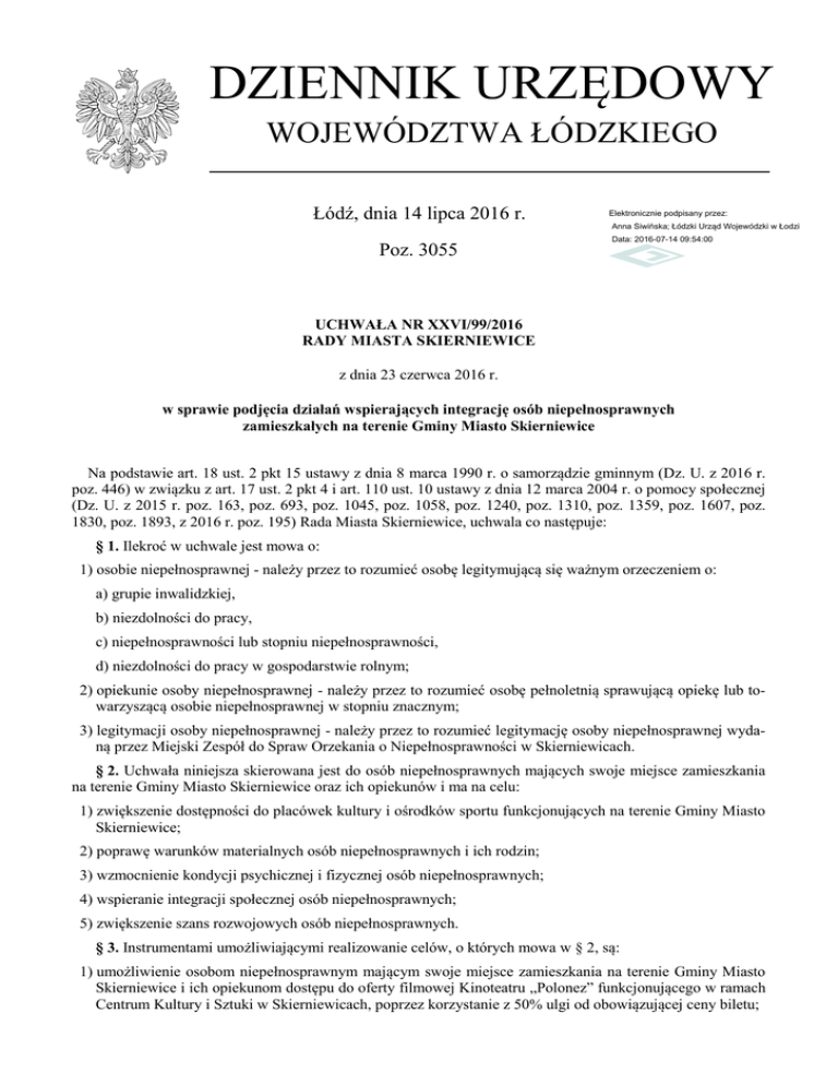 DZIENNIK URZĘDOWY WOJEWÓDZTWA ŁÓDZKIEGO Łódź, dnia 14 lipca 2016 r. Elektronicznie podpisany przez: Anna Siwińska; Łódzki Urząd Wojewódzki w Łodzi Poz. 3055 Data: 2016-07-14 09:54:00 UCHWAŁA NR XXVI/99/2016 RADY MIASTA SKIERNIEWICE z dnia 23 czerwca 2016 r. w sprawie podjęcia działań wspierających integrację osób niepełnosprawnych zamieszkałych na terenie Gminy Miasto Skierniewice Na podstawie art. 18 ust. 2 pkt 15 ustawy z dnia 8 marca 1990 r. o samorządzie gminnym (Dz. U. z 2016 r. poz. 446) w związku z art. 17 ust. 2 pkt 4 i art. 110 ust. 10 ustawy z dnia 12 marca 2004 r. o pomocy społecznej (Dz. U. z 2015 r. poz. 163, poz. 693, poz. 1045, poz. 1058, poz. 1240, poz. 1310, poz. 1359, poz. 1607, poz. 1830, poz. 1893, z 2016 r. poz. 195) Rada Miasta Skierniewice, uchwala co następuje: § 1. Ilekroć w uchwale jest mowa o: 1) osobie niepełnosprawnej - należy przez to rozumieć osobę legitymującą się ważnym orzeczeniem o: a) grupie inwalidzkiej, b) niezdolności do pracy, c) niepełnosprawności lub stopniu niepełnosprawności, d) niezdolności do pracy w gospodarstwie rolnym; 2) opiekunie osoby niepełnosprawnej - należy przez to rozumieć osobę pełnoletnią sprawującą opiekę lub towarzyszącą osobie niepełnosprawnej w stopniu znacznym; 3) legitymacji osoby niepełnosprawnej - należy przez to rozumieć legitymację osoby niepełnosprawnej wydaną przez Miejski Zespół do Spraw Orzekania o Niepełnosprawności w Skierniewicach. § 2. Uchwała niniejsza skierowana jest do osób niepełnosprawnych mających swoje miejsce zamieszkania na terenie Gminy Miasto Skierniewice oraz ich opiekunów i ma na celu: 1) zwiększenie dostępności do placówek kultury i ośrodków sportu funkcjonujących na terenie Gminy Miasto Skierniewice; 2) poprawę warunków materialnych osób niepełnosprawnych i ich rodzin; 3) wzmocnienie kondycji psychicznej i fizycznej osób niepełnosprawnych; 4) wspieranie integracji społecznej osób niepełnosprawnych; 5) zwiększenie szans rozwojowych osób niepełnosprawnych. § 3. Instrumentami umożliwiającymi realizowanie celów, o których mowa w § 2, są: 1) umożliwienie osobom niepełnosprawnym mającym swoje miejsce zamieszkania na terenie Gminy Miasto Skierniewice i ich opiekunom dostępu do oferty filmowej Kinoteatru „Polonez” funkcjonującego w ramach Centrum Kultury i Sztuki w Skierniewicach, poprzez korzystanie z 50% ulgi od obowiązującej ceny biletu; Dziennik Urzędowy Województwa Łódzkiego –2– Poz. 3055 2) umożliwienie osobom niepełnosprawnym mającym swoje miejsce zamieszkania na terenie Gminy Miasto Skierniewice bezpłatnego dostępu do zajęć organizowanych przez Centrum Kultury i Sztuki w Skierniewicach; 3) umożliwienie osobom niepełnosprawnym mającym swoje miejsce zamieszkania na terenie Gminy Miasto Skierniewice korzystania z 50% ulgi do zakupu biletu na spektakle teatralne odbywające się w Centrum Kultury i Sztuki w Skierniewicach przy ulicy Reymonta 33; 4) umożliwienie osobom niepełnosprawnym mającym swoje miejsce zamieszkania na terenie Gminy Miasto Skierniewice korzystania z 50% ulgi do zakupu biletu wstępu do hal sportowych należących do Ośrodka Sportu i Rekreacji w Skierniewicach. § 4. Dokumentem potwierdzającym uprawnienia do korzystania z instrumentów, o których mowa w § 3, jest legitymacja osoby niepełnosprawnej. § 5. Jednostką koordynującą realizację działań wspierających integrację osób niepełnosprawnych zamieszkałych na terenie Gminy Miasto Skierniewice jest Wydział Rozwoju Gospodarczego, Sportu i Spraw Społecznych Urzędu Miasta Skierniewice. § 6. Prezydent Miasta Skierniewice przedstawi Radzie Miasta Skierniewice informację z realizacji niniejszej uchwały za poprzedni rok, najpóźniej do 30 maja po upływie danego roku budżetowego. § 7. Środki niezbędne na realizację instrumentów, o których mowa w § 3, zabezpieczone będą w budżecie na dany rok budżetowy Miasta Skierniewice. § 8. Wykonanie uchwały powierza się Prezydentowi Miasta Skierniewice. § 9. Uchwała wchodzi w życie po upływie 14 dni od ogłoszenia w Dzienniku Urzędowym Województwa Łódzkiego. Przewodniczący Rady Andrzej Melon