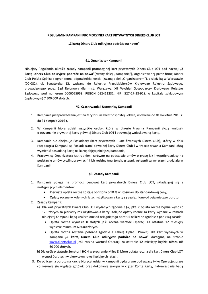 REGULAMIN KAMPANII PROMOCYJNEJ KART PRYWATNYCH DINERS CLUB LOT „Z kartą Diners Club odkryjesz podróże na nowo” §1. Organizator Kampanii Niniejszy Regulamin określa zasady Kampanii promocyjnej kart prywatnych Diners Club LOT pod nazwą: „Z kartą Diners Club odkryjesz podróże na nowo”(zwany dalej „Kampanią”), organizowanej przez firmę Diners Club Polska Spółka z ograniczoną odpowiedzialnością (zwaną dalej „Organizatorem”), z siedzibą w Warszawie (00-082), ul. Senatorska 12, wpisaną do Rejestru Przedsiębiorców Krajowego Rejestru Sądowego, prowadzonego przez Sąd Rejonowy dla m.st. Warszawy, XII Wydział Gospodarczy Krajowego Rejestru Sądowego pod numerem 0000025953, REGON 012411231, NIP: 527-17-28-928, o kapitale zakładowym (wpłaconym) 7 500 000 złotych. §2. Czas trwania i Uczestnicy Kampanii 1. Kampania przeprowadzana jest na terytorium Rzeczpospolitej Polskiej w okresie od 01 kwietnia 2016 r. do 31 sierpnia 2016 r. 2. W Kampanii biorą udział wszystkie osoby, które w okresie trwania Kampanii złożą wniosek o otrzymanie prywatnej karty głównej Diners Club LOT i otrzymają wnioskowaną kartę. 3. Kampania nie obejmuje Posiadaczy (kart prywatnych i kart firmowych Diners Club), którzy w dniu rozpoczęcia Kampanii są Posiadaczami dowolnej karty Diners Club i w trakcie trwania Kampanii chcą wymienić posiadaną kartę na kartę objętą niniejszą Kampanią. Pracownicy Organizatora (zatrudnieni zarówno na podstawie umów o pracę jak i współpracujący na podstawie umów cywilnoprawnych) i ich rodziny (małżonek, zstępni, wstępni) są wyłączeni z udziału w Kampanii. 4. §3. Zasady Kampanii 1. Kampania polega na promocji cenowej kart prywatnych Diners Club LOT, składającej się z następujących elementów: Pierwsza opłata roczna zostaje obniżona o 50 % w stosunku do standardowej ceny; Opłaty roczne w kolejnych latach użytkowania karty są uzależnione od osiągniętego obrotu. 2. Zasady Kampanii: a) Dla kart prywatnych Diners Club LOT wydanych zgodnie z §2, pkt. 2 opłata roczna będzie wynosić 175 złotych za pierwszy rok użytkowania karty. Kolejne opłaty roczne za karty wydane w ramach niniejszej Kampanii będą uzależnione od osiągniętego obrotu i naliczane zgodnie z poniższą zasadą: Opłata roczna wyniesie 0 złotych jeśli roczna wartość Operacji za ostatnie 12 miesięcy wyniesie minimum 60 000 złotych. Opłata roczna zostanie pobrana zgodnie z Tabelą Opłat i Prowizji dla kart wydanych w Kampanii „Z kartą Diners Club odkryjesz podróże na nowo” dostępną na stronie www.dinersclub.pl jeśli roczna wartość Operacji za ostatnie 12 miesięcy będzie niższa niż 60 000 złotych. b) Dla osób o statusie Senator i HON w programie Miles & More opłata roczna dla kart Diners Club LOT wynosi 0 złotych w pierwszym roku i kolejnych latach. 3. Do obliczenia obrotu na karcie biorącej udział w Kampanii będą brane pod uwagę tylko Operacje, przez co rozumie się wypłatę gotówki oraz dokonanie zakupu w ciężar Konta Karty, natomiast nie będą brane pod uwagę transakcje o charakterze uznaniowym nie skutkujące zakupem towaru/usługi oraz opłaty o charakterze uznaniowym lub obciążeniowym wymienione w Tabeli Opłat i Prowizji. §4. Reklamacje 1. Wszelkie reklamacje związane z przeprowadzeniem promocji w ramach niniejszej Kampanii Uczestnik może składać na zasadach określonych w Regulaminie przyjmowania i rozpatrywania reklamacji w ramach świadczonych usług płatniczych Diners Club Polska dostępnym na stronie www.dinersclub.pl. 2. Reklamacje rozpatruje Organizator Kampanii niezwłocznie, jednak nie później niż w ciągu 30 dni od daty ich wpływu do Organizatora. 3. Decyzja Organizatora w przedmiocie rozpatrywanej reklamacji nie wyłącza ani nie ogranicza uprawnień Uczestnika Promocji do dochodzenia swoich roszczeń na podstawie powszechnie obowiązujących przepisów prawa w tym wystąpienia z powództwem do Sądu powszechnego. 4. We wszystkich sprawach nieuregulowanych w niniejszym Regulaminie stosuje się postanowienia Regulaminu Kart Prywatnych Diners Club. §5. Ustalenia końcowe 1. Informacje o Kampanii w formie niniejszego Regulaminu dostępne są w siedzibie Organizatora w Dziale Obsługi Klienta oraz na stronie www.dinersclub.pl. 2. W sytuacjach nieokreślonych niniejszym Regulaminem zastosowanie będą miały powszechnie obowiązujące przepisy prawa. Warszawa, marzec 2016 r.