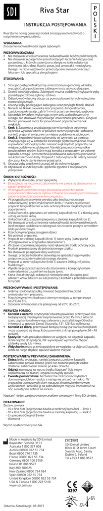 P O L S K I Riva Star INSTRUKCJA POSTĘPOWANIA Riva Star to nowej generacji środek znoszący nadwrażliwość o natychmiastowym działaniu. WSKAZANIA: Znoszenie nadwrażliwości szyjek zębowych. PRZECIWWSKAZANIA • Nie stosować w celu zniesienia nadwrażliwości zębów próchniczych. • Nie stosować u pacjentów przechodzących leczenie tarczycy oraz pacjentów, u których stwierdzono alergię na takie substancje chemiczne jak srebro, fluorki, potas, jod, amoniak i metakrylany. Uwaga: w razie wątpliwości przed użyciem skonsultować się z lekarzem lub specjalistą alergologiem. STOSOWANIE: 1. Stosując pastę profilaktyczną umieszczoną w gumowej wkładce, wyczyścić zęby poddawane zabiegowi oraz zęby przylegające. 2. Ocenić kondycję zębów. Zabiegowi można poddawać wyłącznie zęby posiadające zdrową zębinę i szkliwo. 3. Odizolować właściwy obszar za pomocą bawełnianych wałeczków stomatologicznych. 4. Osuszyć zęby podlegające zabiegowi oraz przyległe tkanki dziąseł. 5. Nanieść na tkanki niewielką ilość preparatu Gingival Barrier, częściowo pokrywając ząb (<1 mm) i przestrzenie międzyzębowe. 6. Utwardzić światłem, wykonując w tym celu wahadłowe ruchy. Uwaga: nie stosować miejscowego utwardzania preparatu Gingival Barrier, ponieważ może to spowodować poparzenie tkanek miękkich. 7. Krok 1: Za pomocą znajdującego się w komplecie srebrnego pędzelka wykonać otwór w powłoce srebrnej kapsułki i ostrożnie nanieść preparat wyłącznie na miejsce poddawane zabiegowi. 8. Krok 2: Bezpośrednio po wykonaniu tej czynności za pomocą znajdującego się w komplecie zielonego pędzelka wykonać otwór w powłoce zielonej kapsułki i nanieść większą ilość preparatu na miejsce poddawane zabiegowi. Nanieść preparat na wszystkie powierzchnie zębów, które mają kontakt z preparatem ze srebrnej kapsułki. Uwaga: powierzchnia poddawana zabiegowi pierwotnie ma kolor kremowo-biały. Preparat z zielonej kapsułki należy nanosić do czasu, kiedy stanie się ona przejrzysta. 9. Osuszyć zęby wacikiem i usunąć żel do ochrony dziąseł. 10. Utylizować zużyte kapsułki i pędzelki zgodnie z miejscowymi przepisami. ŚRODKI OSTROŻNOŚCI: • Wyłącznie do użytku przez specjalistę. • Ze względu na możliwość zabarwienia nie zaleca się stosowania na zębach przednich. • W przypadku niewłaściwego stosowania wyrób ten może powodować zabarwienie zębów. O fakcie tym należy poinformować pacjenta przed zastosowaniem preparatu. • W przypadku stosowania wyrobu jako środka znoszącego nadwrażliwość, przed wykonaniem kroku 1 należy zastosować preparat Gingival Barrier w celu ochrony tkanek miękkich przed poparzeniem. • Unikać kontaktu preparatu ze srebrnej kapsułki (krok 1) z tkanką jamy ustnej, oczami i skórą. • Unikać kontaktu z oczami preparatu z zielonej kapsułki (krok 2). • Nie stosować w celu zniesienia nadwrażliwości zębów próchniczych, jeżeli miejsce poddawane zabiegowi nie zostanie pokryte cementem szkło-jonomerowym. • Przechowywać poza zasięgiem dzieci. • Nie połykać preparatu. • Preparat ze srebrnej kapsułki (krok 1) barwi zęby (patrz punkt „Postępowanie w przypadku zabarwienia”). • W czasie stosowania preparatu nosić rękawiczki i środki ochrony oczu. • Produkt przeznaczony do jednorazowego użytku. • Nie stosować po upływie daty ważności. • Uwaga: przepisy federalne zezwalają na sprzedaż tego wyrobu wyłącznie przez dentystę lub na jego zlecenie. • Preparat w srebrnej kapsułce (krok 1) zawiera 0,06 g/ml jonów fluorkowych. • Wyrób nie jest przeznaczony do stosowania z kompozytowymi materiałami do uzupełnień na bazie żywic. • Karta charakterystyki substancji niebezpiecznej dostępna pod adresem www.sdi.com.au lub prosimy o kontakt z przedstawicielem firmy SDI. PRZECHOWYWANIE I POSTĘPOWANIE: • Srebrną i zieloną kapsułkę otwierać bezpośrednio przed wykorzystaniem preparatu. • Przechowywać w chłodnym i ciemnym miejscu w temperaturze od 2°C do 8°C. • Stosować w temperaturze pokojowej od 20°C do 25°C. PIERWSZA POMOC: • Kontakt z oczami: przytrzymać otwartą powiekę i przemywać oko bieżącą wodą. Przemywać nieprzerwanie przez 15 minut albo do czasu uzyskania odmiennego zalecenia z australijskiego Ośrodka Informacji w sprawie Zatruć (Australia, 131 126) lub od lekarza. • Kontakt ze skórą: przemywać bieżącą wodą (na tkankach miękkich może utworzyć się strup, który powinien zniknąć po upływie 24 – 48 godzin). • Spożycie: mało prawdopodobne ze względu na objętość kapsułki. Jeżeli dojdzie do spożycia, NIE wywoływać wymiotów. Wypić szklankę wody lub mleka. • Wdychanie: mało prawdopodobne ze względu na objętość kapsułki. Jeżeli do niego dojdzie, opuścić skażone miejsce. POSTĘPOWANIE W PRZYPADKU ZABARWIENIA: • Skóra: lekko wcierając, nanieść preparat z zielonej kapsułki. Zabarwienie powoli zniknie (jeżeli nie zostanie podjęte żadne działanie, zabarwienie zniknie po kilku dniach). • Odzież: namoczyć na noc w środku Napisan* (lub innym odplamiaczu do tkanin) i wyprać w zwykły sposób. • Twarde powierzchnie: bezzwłocznie zastosować wybielacz domowy (podchloryn sodu), a następnie zetrzeć na mokro. W przypadku uporczywych plam nasączyć chusteczkę domowym wybielaczem i umieścić ją na zabrudzonym miejscu. Pozostawić na noc, a następnie zetrzeć na mokro. Napisan* nie jest zarejestrowanym znakiem towarowym firmy SDI Limited. OPAKOWANIE: Zestaw zawiera - 10 x Riva Star (pojedyncza dawka w srebrnej kapsułce) — krok 1 - 10 x Riva Star (pojedyncza dawka w zielonej kapsułce) — krok 2 - 2 x preparat Gingival Barrier - akcesoria Wyrób opatentowany w USA. Made in Australia by SDI Limited Bayswater, Victoria 3153 Australia 1 800 337 003 Austria 00800 022 55 734 Brazil 0800 770 1735 France 00800 022 55 734 Germany 0800 100 5759 Ireland 01 886 9577 Italy