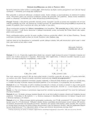 Zadania kwalikacyjne na obóz w Pasterce 2014 Spo±ród poni»szych zada« wybierz i rozwi¡» pi¦¢. Je±li obawiasz si¦ bª¦du, mo»esz przygotowa¢ sze±¢ (ale nie wi¦cej) rozwi¡za« we¹miemy pod uwag¦ pi¦¢ najlepszych. Ilo±¢ gwiazdek w nawiasach informuje o trudno±ci zada«. atwe zadania s¡ wprowadzeniem do niektórych trudniejszych. Oczywi±cie opªaca si¦ rozwi¡za¢ trudniejsze zadania (ile gwiazdek, tyle punktów). Mo»na dosta¢ dodatkowy punkt za elegancj¦ rozwi¡zania (np. ªadn¡ interpretacj¡ kombinatoryczn¡). Uwaga! Zadania z du»¡ ilo±ci¡ gwiazdek stanowi¡ pewne wyzwanie i prawie na pewno nie rozwi¡»esz ich od razu. Je±li nie poddadz¡ si¦ wcale, nie zaªamuj si¦ i wybierz prostsze! W poprzednich latach próg kwalikacji znajdowaª si¦ poni»ej 15 punktów (cho¢ oczywi±cie nie wiem, jak b¦dzie w tym roku). Twoje rozwi¡zania powinny by¢ dobrze uzasadnione oraz kompletne. Nie powoªuj si¦ na fakty, które nie s¡ dla Ciebie oczywiste je±li chcesz skorzysta¢ z jakiego± twierdzenia, podaj zrozumiaªy dla Ciebie dowód albo napisz, gdzie mo»na go znale¹¢. Swoje rozwi¡zania mo»esz przesªa¢ do mnie e-mailem (wówczas potwierdz¦ odbiór), lub do biura Funduszu. Termin nadsyªania rozwi¡za« b¦dzie podany na stronie Funduszu: www.fundusz.org. Je±li nie udaªo mi si¦ sformuªowa¢ w zrozumiaªy sposób jakiego± zadania, lub je±li chciaª(a)by± spyta¢ mnie o cokolwiek, pisz ±miaªo na mój adres e-mail. Powodzenia, Aleksander Zabªocki [email protected] Zadanie 1 (? ? ?). Cz¡steczka w¦glowodoru skªada si¦ z atomów w¦gla (maj¡cych zawsze 4 wi¡zania z innymi ato- mami) oraz wodoru (maj¡cych 1 wi¡zanie). Rozwa»amy takie w¦glowodory, w których wszystkie wi¡zania s¡ pojedyncze, ale mog¡ wyst¦powa¢ rozgaª¦zienia, a nawet cykle: H H H H C C C H H H H H C H H H H C C C C H H H H H C4 H10 (bez cykli) H C C H H H C6 H12 (zawiera cykl) Sam wzór sumaryczny postaci Ca Hb nie daje peªnej wiedzy o ksztaªcie cz¡steczki, ale znaj¡c czy zawiera ona cykle. Znajd¹ t¦ reguª¦ i przedstaw matematyczny aib dowód jej poprawno±ci.1 mo»na stwierdzi¢, W poni»szych dwóch zadaniach rozwa»amy turnieje siatkówki, w których ka»da dru»yna gra jeden raz z ka»d¡ inn¡, a o wyniku decyduje wyª¡cznie sumaryczna liczba punktów (1 za zwyci¦stwo, 0 za przegran¡, nie ma remisów). Zadanie 2 (? ? ?). Udowodnij, »e je±li w turnieju uczestniczyªo n dru»yn, to mo»na je ustawi¢ w ci¡g w taki sposób, »e pierwsza dru»yna w ci¡gu wygraªa swój mecz z drug¡, druga z trzeci¡ itd., wreszcie z (n − 1)-sza wygraªa swój mecz n-t¡. Bonus (?). Czy n-ta dru»yna w powy»szym ci¡gu musi by¢ ostatnia wg ª¡cznej punktacji? Czy mo»e by¢ (jedynym) zwyci¦zc¡ turnieju? Zadanie 3 (??). Na koniec pewnego turnieju okazaªo si¦, »e nie byªo »adnych remisów równie» pod wzgl¦dem ª¡cznej punktacji. Udowodnij, »e dla ka»dych z dru»yn¡ zajmuj¡c¡ Zadanie 4 (? ? ?). ª¡cznie maj¡ j -te i < j, dru»yna zajmuj¡ca w klasykacji ko«cowej i-te miejsce wygraªa mecz miejsce. Mapa pewnego miasta przypomina szachownic¦: jest 75 ulic poziomych i 75 pionowych, które 75 × 75 skrzy»owa«. Odlegªo±¢ mi¦dzy dwoma s¡siednimi skrzy»owaniami wynosi zawsze 100 metrów. Na ka»dym skrzy»owaniu stoi skrzynka pocztowa. Listonosz chce przej±¢ obok ka»dej z nich; ponadto chce wyruszy¢ ze swojego domu (stoj¡cego tu» obok pewnego skrzy»owania) i tam te» zako«czy¢ obchód. Jaka jest minimalna dªugo±¢ ª¡cznej drogi listonosza? Czy odpowied¹ zale»y od tego, przy którym skrzy»owaniu stoi jego dom? 1 Cho¢by Ci¦ korciªo, nie opisuj 15 rodzajów w¦glowodorów spotykanych najcz¦±ciej w przyrodzie. Taki opis nie tworzy dowodu. 1 W poni»szych zadaniach zakªadamy, »e Zadanie 5 . (??) Na przyj¦ciu byªo znajomo±¢ jest relacj¡ symetryczn¡ (je±li A zna B, to B zna A). 100 osób. Udowodnij, »e w±ród nich musz¡ znale¹¢ si¦ albo trzy takie, które si¦ wszystkie znaj¡, albo trzy takie, w±ród których »adne dwie si¦ nie znaj¡. Bonus (?). Podan¡ powy»ej liczb¦ 100 mo»na by znacznie zmniejszy¢. Znajd¹ najmniejsze musi by¢ speªniona na dowolnym spotkaniu Zadanie 6 (??). n n takie, »e teza zadania osób. Na przyj¦ciu byªo 60 osób. Okazaªo si¦, »e ka»de dwie osoby (znaj¡ce si¦ lub nie) miaªy przynajmniej jednego wspólnego znajomego. Udowodnij, »e na przyj¦ciu byªa osoba maj¡ca przynajmniej o±mioro znajomych. W poni»szych zadaniach zakªadamy, »e województwa s¡ spójne (nie skªadaj¡ si¦ z osobnych cz¦±ci). Graniczenie oznacza posiadanie wspólnego odcinka, nie wystarczy punkt (np. czarne pola na szachownicy nie granicz¡ ze sob¡). Zadanie 7 (??). Czy Polsk¦ da si¦ podzieli¢ na 37 województw tak, »eby ka»de graniczyªo dokªadnie z trzema innymi? Zadanie 8 (? ? ??). Czy Polsk¦ da si¦ podzieli¢ na 16 województw tak, »eby ka»de graniczyªo dokªadnie z pi¦cioma innymi i »eby granica pa«stwa przebiegaªa przez dokªadnie 9 z nich? Denicja. X Niech b¦dzie zmienn¡ losow¡ o warto±ciach naturalnych (np. wynik rzutu ko±ci¡). Zachowanie takiej k jej prawdopodobie«stwo pk (np. »eby opisa¢ p1 = . . . = p6 = 61 , za± dalsze pk wynosz¡ 0). p1 + 2 · p2 + 3 · p3 + . . .. Intuicyjnie, jest to ±rednia warto±¢ zmiennej mo»emy opisa¢, podaj¡c dla ka»dej potencjalnej warto±ci zachowanie zwykªej ko±ci do gry, wystarczy wiedzie¢, »e Warto±ci¡ oczekiwan¡ zmiennej X, zmiennej X nazywamy sum¦ gdyby spyta¢ o t¦ warto±¢ w sposób losowy i niezale»ny bardzo wiele razy. 3 21 . Warto±¢ oczekiwana czasu jazdy poci¡giem z Warszawy 1 do Krakowa (zwykle 3 godziny, ale 4 szansy na godzinne opó¹nienie) to 195 minut. Na przykªad warto±¢ oczekiwana wyniku rzutu ko±ci¡ to Zadanie 9 (? ? ?). Adam rzuca monet¡ tak dªugo, a» otrzyma po kolei dwa ró»ne wyniki. Nast¦pnie rzuca tak dªugo, a» wypadnie ponownie pierwszy z tamtych wyników. Oblicz warto±