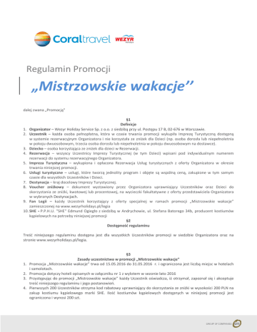 Regulamin Promocji „Mistrzowskie wakacje’’ Warszawa” dalej zwana „Promocją” §1 Definicje 1. Organizator – Wezyr Holiday Service Sp. z o.o. z siedzibą przy ul. Postępu 17 B, 02-676 w Warszawie. 2. Uczestnik – każda osoba pełnopłatna, która w czasie trwania promocji wykupiła Imprezę Turystyczną dostępną w systemie rezerwacyjnym Organizatora i nie korzystała ze zniżek dla Dzieci (np. osoba dorosła lub niepełnoletnia w pokoju dwuosobowym, trzecia osoba dorosła lub niepełnoletnia w pokoju dwuosobowym na dostawce). 3. Dziecko – osoba korzystająca ze zniżek dla dzieci w Rezerwacji. 4. Rezerwacja – wszyscy Uczestnicy Imprezy Turystycznej (w tym Dzieci) wpisani pod indywidualnym numerem rezerwacji do systemu rezerwacyjnego Organizatora. 5. Impreza Turystyczna – wykupiona i opłacona Rezerwacja Usług turystycznych z oferty Organizatora w okresie trwania niniejszej promocji. 6. Usługi turystyczne – usługi, które tworzą jednolity program i objęte są wspólną ceną, zakupione w tym samym czasie dla wszystkich Uczestników i Dzieci. 7. Destynacja – kraj docelowy Imprezy Turystycznej. 8. Voucher zniżkowy – dokument wystawiony przez Organizatora uprawniający Uczestników oraz Dzieci do skorzystania ze zniżki, kwotowej lub procentowej, na wycieczki fakultatywne z oferty przedstawiciela Organizatora w wybranych Destynacjach. 9. Fan Legii – każdy Uczestnik korzystający z oferty specjalnej w ramach promocji „Mistrzowskie wakacje” zamieszczonej na www.wezyrholidays.pl/legia 10. SHE - P.P.H.U. "SHE" Edmund Ogiegło z siedzibą w Andrychowie, ul. Stefana Batorego 34b, producent kostiumów kąpielowych na potrzeby niniejszej promocji §2 Dostępność regulaminu Treść niniejszego regulaminu dostępna jest dla wszystkich Uczestników promocji w siedzibie Organizatora oraz na stronie www.wezyrholidays.pl/legia. 1. 2. 3. 4. §3 Zasady uczestnictwa w promocji „Mistrzowskie wakacje” Promocja „Mistrzowskie wakacje” trwa od 15.05.2016 do 31.05.2016 r. i ograniczona jest liczbą miejsc w hotelach i samolotach. Promocja dotyczy hoteli opisanych w załączniku nr 1 z wylotem w sezonie lato 2016 Przystępując do promocji „Mistrzowskie wakacje” każdy Uczestnik oświadcza, iż otrzymał, zapoznał się i akceptuje treść niniejszego regulaminu i jego postanowień. Pierwszych 200 Uczestników otrzyma kod rabatowy uprawniający do skorzystania ze zniżki w wysokości 200 PLN na zakup kostiumu kąpielowego marki SHE. Ilość kostiumów kąpielowych dostępnych w niniejszej promocji jest ograniczona i wynosi 200 szt. 5. Warunkiem upoważniającym do otrzymania kodu rabatowego opisanego w pkt 4 powyżej, jest prawidłowe wypełnienie formularza zgłoszeniowego zamieszczonego na stronie www.wezyrholidays.pl/legia Uczestnik spełniający powyższe warunki zostanie wpisany na listę osób uprawnionych do otrzymania kodu rabatowego. Kompletna lista, zawierająca imiona i nazwiska oraz adresy mailowe uczestników zostanie przekazana do firmy SHE, gdzie zostaną wygenerowane kody rabatowe, automatycznie wysyłane na adres e-mail Uczestnika. Zamówiony kostium Uczestnik otrzyma za pośrednictwem kuriera na wskazany w formularzu zgłoszeniowym adres i na koszt firmy SHE, w terminie od 5 do 10 dni roboczych liczonych od złożenia zamówienia na stronie www.she.pl. 6. Zniżkę można uzyskać w biurach sprzedaży Coral Travel Wezyr Holidays, u Autoryzowanych Agentów oraz przy rezerwacji online na www.wezyrholidays.pl. 7. Zniżki opisane w ust. 4 powyżej nie są zawarte w systemie rezerwacyjnym Organizatora i zostaną dodane do Rezerwacji w momencie, w którym zostanie potwierdzona z rezerwacji „Opcjonalnej” na „Stałą” lub założona jako rezerwacja „Stała”. §4 Płatności Uczestnik zobowiązany jest do wpłaty wyłącznie zaliczki w wysokości opisanej w Warunkach Imprez Turystycznych Organizatora. §5 Rezygnacja lub zmiana rezerwacji W przypadku rezygnacji z Imprezy Turystycznej lub dokonywanych zmian w Rezerwacji przez Uczestnika w okresie trwania niniejszej promocji zastosowanie mają Warunki Imprez Turystycznych, dostępne w siedzibie lub na stronie internetowej Organizatora pod adresem https://www.wezyrholidays.pl/o-wezyrholidays#dokumenty §6 Reklamacje Wszystkie roszczenia, reklamacje, uwagi i zastrzeżenia co do przebiegu niniejszej promocji wysłane na adres siedziby Organizatora wymagają formy pisemnej pod rygorem nieważności. 1. 2. 3. 4. §7 Postanowienia końcowe Prawem właściwym dla wykładni i stosowania niniejszego regulaminu promocji jest prawo polskie. W zakresie nieuregulowanym niniejszym regulaminem stosuje się obowiązujące w dniu zawarcia umowy Warunki Imprez Turystycznych Organizatora. Promocja „Mistrzowskie wakacje” nie łączy się z innymi promocjami. Organizator zastrzega sobie prawo do odwołania niniejszej promocji lub zmiany niniejszego regulaminu, bez konieczności podawania przyczyn, z zastrzeżeniem, że odwołanie niniejszej promocji lub zmiana niniejszego regulaminu nie wpłynie na prawa i obowiązki uprzednio nabyte przez Uczestnika, który dokonał Rezerwacji przed odwołaniem niniejszej promocji lub zmiany niniejszego regulaminu. Informacja o odwołaniu niniejszej promocji lub zmianie niniejszego regulaminu zostanie podana przez Organizatora do wiadomości publicznej. Załącznik nr 1 1. Lista Destynacji i hoteli biorących udział w promocji „Mistrzowskie Wakacje” w terminie od 15 do 31 maja 2016. 1.1. TURCJA - XANADU RESORT - EFTALIA VILLAGE - OTIUM ECO CLUB - BODRUM HOLIDAY 1.2 GRECJA - CRETA MARIS BEACH RESORT - MEROPI - FAMILY WORLD AQUA BEACH - DODECA SEA RESORT 1.3 HISZPANIA - GRAN GARBI HOTEL - GARBI PARK LLORET - LA CARABELA - HIPOTELS MARFIL PLAYA 1.4 BUŁGARIA - AQUA AZUR HRIZANTHEMA AMFORA DIAMOND 1.5 EGIPT - MIRAGE AQUAPARK - STELLA DI MARE BEACH RESORT & SPA - MAKADI BAY - OTIUM AMPHORAS