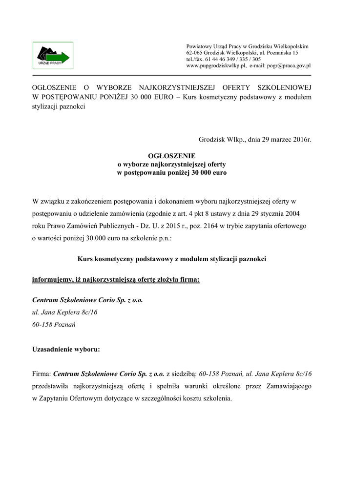 Powiatowy Urząd Pracy w Grodzisku Wielkopolskim 62-065 Grodzisk Wielkopolski, ul. Poznańska 15 tel./fax. 61 44 46 349 / 335 / 305 www.pupgrodziskwlkp.pl, e-mail: [email protected] OGŁOSZENIE O WYBORZE NAJKORZYSTNIEJSZEJ OFERTY SZKOLENIOWEJ W POSTĘPOWANIU PONIŻEJ 30 000 EURO – Kurs kosmetyczny podstawowy z modułem stylizacji paznokci Grodzisk Wlkp., dnia 29 marzec 2016r. OGŁOSZENIE o wyborze najkorzystniejszej oferty w postępowaniu poniżej 30 000 euro W związku z zakończeniem postępowania i dokonaniem wyboru najkorzystniejszej oferty w postępowaniu o udzielenie zamówienia (zgodnie z art. 4 pkt 8 ustawy z dnia 29 stycznia 2004 roku Prawo Zamówień Publicznych - Dz. U. z 2015 r., poz. 2164 w trybie zapytania ofertowego o wartości poniżej 30 000 euro na szkolenie p.n.: Kurs kosmetyczny podstawowy z modułem stylizacji paznokci informujemy, iż najkorzystniejszą ofertę złożyła firma: Centrum Szkoleniowe Corio Sp. z o.o. ul. Jana Keplera 8c/16 60-158 Poznań Uzasadnienie wyboru: Firma: Centrum Szkoleniowe Corio Sp. z o.o. z siedzibą: 60-158 Poznań, ul. Jana Keplera 8c/16 przedstawiła najkorzystniejszą ofertę i spełniła warunki określone przez Zamawiającego w Zapytaniu Ofertowym dotyczące w szczególności kosztu szkolenia.