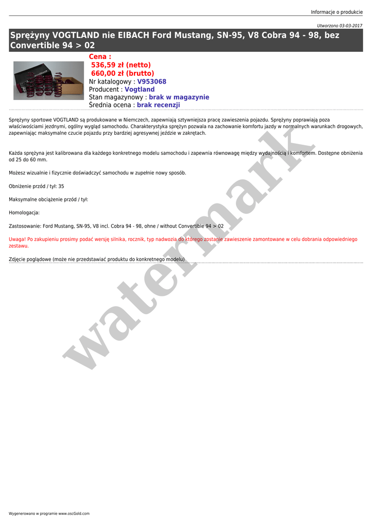 Informacje o produkcie Utworzono 03-03-2017 Sprężyny VOGTLAND nie EIBACH Ford Mustang, SN-95, V8 Cobra 94 - 98, bez Convertible 94 > 02 Cena : 536,59 zł (netto) 660,00 zł (brutto) Nr katalogowy : V953068 Producent : Vogtland Stan magazynowy : brak w magazynie Średnia ocena : brak recenzji er m ar k Sprężyny sportowe VOGTLAND są produkowane w Niemczech, zapewniają sztywniejsza pracę zawieszenia pojazdu. Sprężyny poprawiają poza właściwościami jezdnymi, ogólny wygląd samochodu. Charakterystyka sprężyn pozwala na zachowanie komfortu jazdy w normalnych warunkach drogowych, zapewniając maksymalne czucie pojazdu przy bardziej agresywnej jeździe w zakrętach. Każda sprężyna jest kalibrowana dla każdego konkretnego modelu samochodu i zapewnia równowagę między wydajnością i komfortem. Dostępne obniżenia od 25 do 60 mm. Możesz wizualnie i fizycznie doświadczyć samochodu w zupełnie nowy sposób. Obniżenie przód / tył: 35 Maksymalne obciążenie przód / tył: Homologacja: Zastosowanie: Ford Mustang, SN-95, V8 incl. Cobra 94 - 98, ohne / without Convertible 94 > 02 Uwaga! Po zakupieniu prosimy podać wersję silnika, rocznik, typ nadwozia do którego zostanie zawieszenie zamontowane w celu dobrania odpowiedniego zestawu. w at Zdjęcie poglądowe (może nie przedstawiać produktu do konkretnego modelu) Wygenerowano w programie www.oscGold.com