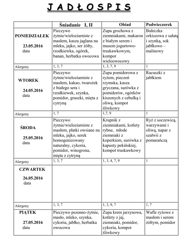 J A D Ł O S P I S Śniadanie I, II Obiad Pieczywo Zupa grochowa z ziemniakami, makaron PONIEDZIAŁEK żytnie/wieloziarniste z masłem, kasza jaglana na z białym serem i mleku, jajko, ser żółty, musem jogurtowo23.05.2016 data rzodkiewka, ogórek, truskawkowym, banan, herbatka owocowa kompot wieloowocowy Alergeny WTOREK 24.05.2016 data Alergeny ŚRODA 25.05.2016 data Alergeny Podwieczorek Bułeczka orkiszowa z sałatą i szynką, sok jabłkowo – malinowy 1, 3, 7 1, 3, 7, 9 1 Pieczywo żytnie/wieloziarniste z masłem, kakao, twarożek z białego sera i rzodkiewek, szynka, pomidor, gruszki, mięta z cytryną Zupa pomidorowa z ryżem, pieczeń rzymska, kasza gryczana, surówka z pomidorów, ogórków kiszonych z cebulką i oliwą, kompot śliwkowy Racuszki z jabłkiem 1, 7 1,7, 9 1 Pieczywo żytnie/wieloziarniste z masłem, płatki owsiane na mleku, jajko, serek homogenizowany naturalny, cykoria, pomidor, winogrona, mięta z cytryną Krupnik z ziemniakami, kotlety rybne, młode ziemniaki z koperkiem, surówka z kapusty pekińskiej, kompot truskawkowy Ryż z soczewicą, warzywami i oliwą, napar z szałwii z pomarańczą 1, 3, 7 1, 3, 4, 7, 9 1 1, 3, 7 1, 3, 9, 7 1, 7 Pieczywo pszenno-żytnie, masło, mleko, szynka, cykoria, jabłko, herbatka owocowa Zupa krem jarzynowa, Wafle ryżowe z kotlety z jaj, masłem i serem ziemniaki, pomidor, żółtym, pomidor cykoria, kompot śliwkowy CZWARTEK 26.05.2016 data Alergeny PIĄTEK 27.05.2016 data Alergeny 1,7 1,3,7,9 1, 7 KĄCIK GŁODOMORA O GODZINIE 16 OO - KANAPKI RÓŻNE, NAPÓJ. Alergeny (podane w jadłospisie liczby oznaczają wymienione niżej alergeny): SUBSTANCJE LUB PRODUKTY POWODUJĄCE ALERGIE LUB REAKCJE NIETOLERANCJI (wg załącznika II do ROZPORZĄDZENIA PARLAMENTU EUROPEJSKIEGO I RADY (UE) NR 1169/2011 z dnia 25 października 2011 r.) 1. Zboża zawierające gluten 2. Skorupiaki i produkty pochodne 3. Jaja i produkty pochodne 4. Ryby i produkty pochodne 5. Orzeszki ziemne (arachidowe) i produkty pochodne 6. Soja i produkty pochodne 7. Mleko i produkty pochodne 8. Orzechy 9. Seler i produkty pochodne 10. Gorczyca i produkty pochodne 11. Nasiona sezamu i produkty pochodne 12. Dwutlenek siarki i siarczyny w stężeniach powyżej 10 mg/kg lub 10 mg/litr w przeliczeniu na całkowitą zawartość SO2 dla produktów w postaci gotowej bezpośrednio do spożycia lub w postaci przygotowanej do spożycia zgodnie z instrukcjami wytwórców 13. Łubin i produkty pochodne 14. Mięczaki i produkty pochodne GRAMATURY POSIŁKÓW Śniadanie I i II Pieczywo masło wędlina ser żółty 35g 5g 15-20 g 15-20g Obiad Zupa gulasz (z sosem) Kotlet z piersi indyka udko kurczaka 150g 80-100g Podwieczorek Pieczywo wędlina ser żółty warzywa surowe pasty warzywne (z fasoli, ciecierzycy) shake jogurtowy sałatka owocowa 250 ml 100- 120 g 65 g 80-90g warzywa (pomidor, ogórek,) 20g pulpet 60g sałata rzodkiewka/kalarepka 4g 4g Mleko/kakao 200 ml Zupa mleczna Owoce 200 ml 80-100 g ziemniak ryż kasza (jęczmienna, gryczana , kuskus) makaron surówka 150ml 130-150g 80-100g warzywa surowe 20g 80-100g 100g racuchy/placki z dynią ryż z jabłkiem 90-100 g warzywa gotowane (marchew, buraki, kalafior, brokuły, fasolka szparagowa) 70g ciasto kruche (wyrób własny) mizeria 120g ogórek kiszony Herbatka owocowa/mięta 150 ml kompot owocowy 200 ml makaron z polewą jogurtową wafle ryżowe sok (jabłkowy, pomarańczowy) 25g 20g 15g 20g 150g 150g 10g 150-200 ml