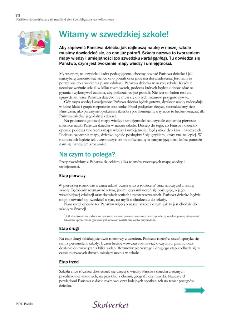 Till Förälder/vårdnadshavare till nyanländ elev i de obligatoriska skolformerna Witamy w szwedzkiej szkole! Aby zapewnić Państwa dziecku jak najlepszą naukę w naszej szkole musimy dowiedzieć się, co ono już potrafi. Szkoła nazywa to tworzeniem mapy wiedzy i umiejętności (po szwedzku kartläggning). Tu dowiedzą się Państwo, czym jest tworzenie mapy wiedzy i umiejętności. My wszyscy, nauczyciele i kadra pedagogiczna, chcemy poznać Państwa dziecko i jak najszybciej zorientować się, co ono potrafi oraz jakie ma doświadczenia. Jest nam to potrzebne do stworzenia planu edukacji Państwa dziecka w naszej szkole. Każdy z uczniów weźmie udział w kilku rozmowach, podczas których będzie odpowiadać na pytania i wykonywać zadania, aby pokazać, co już potrafi. Nie jest to żaden test ani sprawdzian, więc Państwa dziecko nie musi się do tych rozmów przygotowywać. Gdy mapa wiedzy i umiejętności Państwa dziecka będzie gotowa, dyrektor szkoły zadecyduje, w której klasie i grupie rozpocznie ono naukę. Przed podjęciem decyzji, skontaktujemy się z Państwem, jako prawnymi opiekunami dziecka i poinformujemy o tym, co to będzie oznaczać dla Państwa dziecka i jego dalszej edukacji. Na podstawie gotowej mapy wiedzy i umiejętności nauczyciele zaplanują pierwsze miesiące nauki Państwa dziecka w naszej szkole. Dostęp do tego, co Państwa dziecko opowie podczas tworzenia mapy wiedzy i umiejętności, będą mieć dyrektor i nauczyciele. Podczas tworzenia mapy, dziecko będzie posługiwać się językiem, który zna najlepiej. W rozmowach będzie też uczestniczyć osoba mówiąca tym samym językiem, która pomoże nam się nawzajem zrozumieć. Na czym to polega? Przeprowadzimy z Państwa dzieckiem kilka rozmów tworzących mapę wiedzy i umiejętnosci. Etap pierwszy W pierwszej rozmowie wezmą udział uczeń wraz z rodzicem* oraz nauczyciel z naszej szkoły. Będziemy rozmawiać o tym, jakimi językami uczeń się posługuje, o jego wcześniejszej edukacji oraz doświadczeniach i zainteresowaniach. Państwa dziecko będzie mogło również opowiedzieć o tym, co myśli o chodzeniu do szkoły. Nauczyciel opowie też Państwu więcej o naszej szkole i o tym, jak to jest chodzić do szkoły w Szwecji. * Jeśli dziecko nie ma rodzica ani opiekuna, w czasie pierwszej rozmowy może być obecny opiekun prawny (förmyndare) lub osoba upoważniona (god man), jeśli uczniowi została taka osoba przydzielona. Etap drugi Na etap drugi składają sie dwie rozmowy z uczniem. Podczas rozmów uczeń spotyka się sam z personelem szkoły. Uczeń będzie wówczas rozmawiać o czytaniu, pisaniu oraz dostanie do rozwiązania kilka zadań. Rozmowy pierwszego i drugiego etapu odbędą się w czasie pierwszych dwóch miesięcy ucznia w szkole. Etap trzeci POL Polska Szkoła chce również dowiedzieć się więcej o wiedzy Państwa dziecka z różnych przedmiotów szkolnych, na przykład z chemii, geografii czy muzyki. Nauczyciel powiadomi Państwa o dacie rozmowy oraz kolejnych spotkaniach na temat postępów dziecka. Till Förälder/vårdnadshavare till nyanländ elev i de obligatoriska skolformerna Gdzie można znaleźć wiecej informacji? www.omsvenskaskolan.se www.skolverket.se/nyanlanda POL Polska