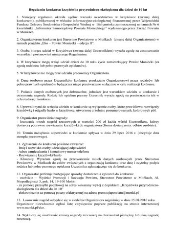 Regulamin konkursu krzyżówka przyrodniczo-ekologiczna dla dzieci do 10 lat 1. Niniejszy regulamin określa ogólne warunki uczestnictwa w krzyżówce (zwanej dalej konkursem), publikowanej w wkładce informacyjno-ekologicznej finansowanej przez Wojewódzki Fundusz Ochrony Środowiska i Gospodarki Wodnej w Białymstoku zamieszczonej na łamach Nr 6 kwartalnika „Informator Samorządowy Powiatu Monieckiego” wydawanego przez Zarząd Powiatu w Mońkach. 2. Organizatorem konkursu jest Starostwo Powiatowe w Mońkach (zwane dalej Organizatorem) w ramach projektu „Eko – Powiat Moniecki – edycja II”. 3. Osoba biorąca udział w Krzyżówce (zwana dalej Uczestnikiem) wyraża zgodę na zastosowanie wszystkich postanowień niniejszego Regulaminu. 4. W krzyżówce mogą wziąć udział dzieci do 10 roku życia zamieszkujący Powiat Moniecki (za zgodą rodziców lub pełno prawnych opiekunów). 5. W krzyżówce nie mogą brać udziału pracownicy Organizatora. 6. Dane osobowe przez Uczestników konkursu przekazane Organizatorowi przez rodziców lub pełno prawnych opiekunów będą przez niego przetwarzane wyłącznie w celu realizacji konkursu. 7. Podanie danych osobowych jest dobrowolne, jednakże jest warunkiem udziału w konkursie i otrzymania nagrody. Rodzic lub opiekun prawny Uczestnik wyraża zgodę na przetwarzania ich w celu realizacji konkursu. 8. Uprawnionymi do wzięcia udziału w konkursie są wyłącznie osoby, które prawidłowo rozwiązały krzyżówkę i odgadły hasło w krzyżówce, utworzone z kolejno ponumerowanych, kolorowych pół. 9. Organizator przewidział nagrody: - losowanie trzech nagród rzeczowych o wartości 200 zł każda wśród Uczestników, którzy dostarczą poprawne rozwiązanie krzyżówki do organizatora (forma dostarczenia: odbiór osobisty). 10. Termin nadsyłania odpowiedzi w konkursie upływa w dniu 29 lipca 2016 r. (decyduje data stempla pocztowego). 11. Zgłoszenie do konkursu powinno zawierać: - Imię i nazwisko osoby udzielającej odpowiedzi - Adres zamieszkania i kontaktowy numer telefonu - Rozwiązanie krzyżówki/hasło - Klauzulę: Wyrażam zgodę na przetwarzanie moich danych osobowych przez Starostwo Powiatowe w Mońkach do celów związanych z organizacją konkursu oraz datę i czytelny podpis rodzica lub pełno prawnego opiekuna Uczestnika zgłaszającego się do konkursu. 12. Organizator preferuje następujące sposoby dostarczenia zgłoszeń do konkursu: - osobiście – Wydział Promocji i Rozwoju Powiatu, Starostwo Powiatowe w Mońkach, Al. Niepodległości 3, pok. 14, 19-100 Mońki - za pomocą przesyłki pocztowej na adres wskazany wyżej z dopiskiem „Krzyżówka przyrodniczoekologiczna dla dzieci do lat 10” - elektronicznie za pomocą poczty elektrycznej na adres: [email protected] 13. Losowanie nagród odbędzie się w siedzibie Organizatora najpóźniej w dniu 15.08.2016 roku. Organizator niezwłocznie ogłosi listę zwycięzców poprzez publikację na stronie internetowej www.monki.pl/eko. 14. Wyklucza się możliwość zmiany nagrody rzeczowej na ekwiwalent pieniężny lub inną nagrodę rzeczową. 15. Organizator dołoży wszelkich starań w celu zapewnienia prawidłowego przebiegu konkursu. 16. Organizator zastrzega sobie prawo zmiany postanowień Regulaminu w razie zmiany przepisów prawnych lub z innej istotnej przyczyny. 17. Regulamin oraz dodatkowe informacje na temat Krzyżówki są dostępne na stronie internetowej www.monki.pl i w siedzibie Organizatora. 18. Ostateczna interpretacja niniejszego regulaminu należy do Organizatora. ORGANIZATOR