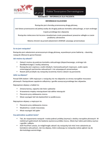 RZEŻĄCZKA – INFORMACJA DLA PACJENTA INFORMACJE KLUCZOWE Rzeżączka jest chorobą przenoszoną drogą płciową Jest łatwo przenoszona od jednej osoby do drugiej podczas kontaktu seksualnego, w tym oralnego Często przebiega bez objawów Rzeżączka nieleczona lub leczona niewłaściwie może powodować poważne odległe w czasie problemy zdrowotne Można chronić się przed zakażeniem ZAWSZE używając prezerwatyw Co to jest rzeżączka? Rzeżączka jest zakażeniem przenoszonym drogą płciową, wywołanym przez bakterię – dwoinkę rzeżączki (Neisseria gonorrhoeae). Jak można się zakazić? • • • Zakazić można się podczas kontaktu seksualnego (dopochwowego, oralnego lub doodbytniczego) z osobą zakażoną. Rzeżączka jest częstsza u osób młodych, homoseksualnych mężczyzn, osób często zmieniających partnerów seksualnych i nie używających prezerwatyw. Nawet jeśli przebyło się rzeżączkę wcześniej można zakazić się ponownie. Jakie są objawy? Ponad 50% kobiet i 10% mężczyzn z rzeżączką nie ma objawów ze strony narządów moczowo-‐ płciowych. Rzeżączkowe zapalenie odbytnicy i gardła zazwyczaj przebiega bez objawów. Najczęstsze objawy u kobiet to: • • • • Zmiana barwy, zapachu lub ilości upławów Krwawienia między miesiączkami lub obfite miesiączki Pieczenie przy oddawaniu moczu Może wystąpić ból lub dyskomfort w podbrzuszu Najczęstsze objawy u mężczyzn to: • • • Pieczenie przy oddawaniu moczu Wydzielina z cewki moczowej Może wystąpić ból jąder Czy potrzebne są jakieś testy? • • Tak, do rozpoznania rzeżączki trzeba pobrać próbkę (wymaz) z okolicy narządów płciowych. W niektórych gabinetach do badania wystarcza próbka moczu. Może być także potrzebny wymaz z gardła i odbytu. Jeśli Pan/Pani uważa, że mógł/mogła zakazić się rzeżączką lub mieć inne zakażenie po kontakcie seksualnym, lub ma objawy, które wskazują na rzeżączkę należy zgłosić się do dermatologa-‐wenerologa. • • Lekarz lub pielęgniarka pobierze wymaz (próbkę) z cewki moczowej lub szyjki macicy i prześle do laboratorium w celu wykonania testów w kierunku rzeżączki. Jeśli Pan/Pani miał/miała kontakty doodbytnicze lub oralne, należy powiedzieć o tym lekarzowi -‐ materiał do badań trzeba będzie pobrać z odbytu i gardła. W przypadku rozpoznania rzeżączki należy wykonać testy w kierunku innych zakażeń przenoszonych drogą płciową: HIV, kiły, zakażenia Chlamydia trachomatis, ponieważ można mieć więcej niż jedno zakażenie w tym samym czasie. Jakie jest leczenie? • • • Ważne jest rozpoczęcie leczenia tak szybko, jak to możliwe, ponieważ rzeżączka nieleczona może spowodować poważne powikłania i problemy zdrowotne. Leczenie rzeżączki polega na podaniu dwóch różnych antybiotyków, w tym jednego w zastrzyku. Podane antybiotyki leczą także zakażenie Chlamydia trachomatis, które często występuje razem z rzeżączką. Czy można mieć stosunki seksualne podczas rzeżączki? • Należy unikać kontaktów seksualnych dopóki Pan/Pani i partner/partnerka/partnerzy nie zakończą leczenia i dopóki nie ustąpią objawy. Jakie są możliwe powikłania rzeżączki? • • • Jeśli leczenie rozpoczęto wcześnie rzeżączka nie powinna prowadzić do odległych powikłań. Bez leczenia może powodować poważne problemy zdrowotne. U kobiet może wystąpić zapalenie narządów miednicy mniejszej z bólem brzucha i podbrzusza oraz możliwą niepłodnością lub ciążą pozamaciczną. U mężczyzn może dojść do zapalenia jąder i najądrzy. W rzadkich przypadkach w przebiegu nieleczonej rzeżączki może dojść do rozsiewu zakażenia z krwią i do powstania zmian w skórze i stawach. Rzeżączka w ciąży Kobieta w ciąży może zakazić dziecko podczas porodu, co może prowadzić u noworodka do zapalenia spojówek, które, jeśli nie jest leczone, może spowodować ślepotę. Czy muszę powiedzieć o zakażeniu partnerowi/partnerce? • Jeśli ma Pan/Pani rzeżączkę to bardzo ważne jest aby partner/partnerka oraz każdy • partner/partnerka z ostatnich byli zbadani i leczeni. Zapobiegnie to ponownemu zakażeniu oraz rozwojowi powikłań u partnerów/partnerek. Dalsza pomoc i dodatkowe informacje • Jeśli Pan/Pani podejrzewa, że ma rzeżączkę lub inne zakażenie przenoszone drogą płciową należy zgłosić się do poradni dermatologiczno-‐wenerologicznej. Data publikacji: 2010, Copyright © IUSTI 2010: www.iusti.org Polskie tłumaczenie: 2014, dr hab. med. Agnieszka B. Serwin
