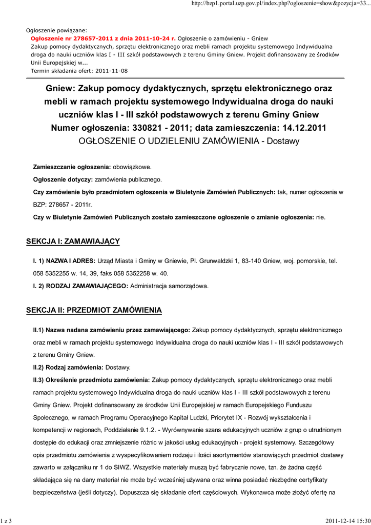 1z3 http://bzp1.portal.uzp.gov.pl/index.php?ogloszenie=show&pozycja=33... Ogłoszenie powiązane: Ogłoszenie nr 278657-2011 z dnia 2011-10-24 r. Ogłoszenie o zamówieniu - Gniew Zakup pomocy dydaktycznych, sprzętu elektronicznego oraz mebli ramach projektu systemowego Indywidualna droga do nauki uczniów klas I - III szkół podstawowych z terenu Gminy Gniew. Projekt dofinansowany ze środków Unii Europejskiej w... Termin składania ofert: 2011-11-08 Gniew: Zakup pomocy dydaktycznych, sprzętu elektronicznego oraz mebli w ramach projektu systemowego Indywidualna droga do nauki uczniów klas I - III szkół podstawowych z terenu Gminy Gniew Numer ogłoszenia: 330821 - 2011; data zamieszczenia: 14.12.2011 OGŁOSZENIE O UDZIELENIU ZAMÓWIENIA - Dostawy Zamieszczanie ogłoszenia: obowiązkowe. Ogłoszenie dotyczy: zamówienia publicznego. Czy zamówienie było przedmiotem ogłoszenia w Biuletynie Zamówień Publicznych: tak, numer ogłoszenia w BZP: 278657 - 2011r. Czy w Biuletynie Zamówień Publicznych zostało zamieszczone ogłoszenie o zmianie ogłoszenia: nie. SEKCJA I: ZAMAWIAJĄCY I. 1) NAZWA I ADRES: Urząd Miasta i Gminy w Gniewie, Pl. Grunwaldzki 1, 83-140 Gniew, woj. pomorskie, tel. 058 5352255 w. 14, 39, faks 058 5352258 w. 40. I. 2) RODZAJ ZAMAWIAJĄCEGO: Administracja samorządowa. SEKCJA II: PRZEDMIOT ZAMÓWIENIA II.1) Nazwa nadana zamówieniu przez zamawiającego: Zakup pomocy dydaktycznych, sprzętu elektronicznego oraz mebli w ramach projektu systemowego Indywidualna droga do nauki uczniów klas I - III szkół podstawowych z terenu Gminy Gniew. II.2) Rodzaj zamówienia: Dostawy. II.3) Określenie przedmiotu zamówienia: Zakup pomocy dydaktycznych, sprzętu elektronicznego oraz mebli ramach projektu systemowego Indywidualna droga do nauki uczniów klas I - III szkół podstawowych z terenu Gminy Gniew. Projekt dofinansowany ze środków Unii Europejskiej w ramach Europejskiego Funduszu Społecznego, w ramach Programu Operacyjnego Kapitał Ludzki, Priorytet IX - Rozwój wykształcenia i kompetencji w regionach, Poddziałanie 9.1.2. - Wyrównywanie szans edukacyjnych uczniów z grup o utrudnionym dostępie do edukacji oraz zmniejszenie różnic w jakości usług edukacyjnych - projekt systemowy. Szczegółowy opis przedmiotu zamówienia z wyspecyfikowaniem rodzaju i ilości asortymentów stanowiących przedmiot dostawy zawarto w załączniku nr 1 do SIWZ. Wszystkie materiały muszą być fabrycznie nowe, tzn. że żadna część składająca się na dany materiał nie może być wcześniej używana oraz winna posiadać niezbędne certyfikaty bezpieczeństwa (jeśli dotyczy). Dopuszcza się składanie ofert częściowych. Wykonawca może złożyć ofertę na 2011-12-14 15:30 2z3 http://bzp1.portal.uzp.gov.pl/index.php?ogloszenie=show&pozycja=33... jedną lub więcej części zamówienia. Każda pozycja części zamówienia musi być wyceniona przez Wykonawcę. Jeden wykonawca może złożyć ofertę na wszystkie wymienione niżej części: Część 1 - pomoce dydaktyczne (np. kolorowe klocki, puzzle planszowe, gry dydaktyczne, programy multimedialne, itp.) Część 2 - sprzęt elektroniczny (sprzęt audiowizualny) Część 3 - meble szkolne (stoliki, krzesła, szafy). Zamawiający dopuszcza możliwość przedstawienia w ofercie asortymentu równoważnego (innego niż podany /z nazwy/ przez http://bzp1.portal.uzp.gov.pl/index.php?ogloszenie=show&pozycja=27... 1 z 6 2011-10-24 14:52 Zamawiającego w załączniku nr 1 do SIWZ) pod warunkiem, iż oferowany asortyment będzie o takich samych lub lepszych parametrach technicznych, jakościowych, funkcjonalnych oraz użytkowych. Wszystkie dostarczone artykuły powinny posiadać oznakowanie zgodne z logotypem projektu. II.4) Wspólny Słownik Zamówień (CPV): 39.16.21.00-6, 30.21.31.00-6, 39.16.00.00-1. SEKCJA III: PROCEDURA III.1) TRYB UDZIELENIA ZAMÓWIENIA: Przetarg nieograniczony III.2) INFORMACJE ADMINISTRACYJNE Zamówienie dotyczy projektu/programu finansowanego ze środków Unii Europejskiej: tak, projekt/program: Indywidualna droga do nauki uczniów klas I-III szkół podstawowych z terenu Gminy Gniew. Projekt współfinansowany ze środków Unii Europejskiej w ramach Europejskiego Funduszu Społecznego, Priorytet IX, Poddziałanie 9.1.2. SEKCJA IV: UDZIELENIE ZAMÓWIENIA Część NR: 1 Nazwa: Pomoce dydaktyczne IV.1) DATA UDZIELENIA ZAMÓWIENIA: 06.12.2011. IV.2) LICZBA OTRZYMANYCH OFERT: 1. IV.3) LICZBA ODRZUCONYCH OFERT: 0. IV.4) NAZWA I ADRES WYKONAWCY, KTÓREMU UDZIELONO ZAMÓWIENIA: MOJE BAMBINO sp. z o.o. sp. k., Gdańska 80, 90-613 Łódź, kraj/woj. łódzkie. IV.5) Szacunkowa wartość zamówienia (bez VAT): 70243,90 PLN. IV.6) INFORMACJA O CENIE WYBRANEJ OFERTY ORAZ O OFERTACH Z NAJNIŻSZĄ I NAJWYŻSZĄ CENĄ Cena wybranej oferty: 82008,56 Oferta z najniższą ceną: 82008,56 / Oferta z najwyższą ceną: 82008,56 Waluta: PLN. Część NR: 2 Nazwa: Sprzęt elektroniczny IV.1) DATA UDZIELENIA ZAMÓWIENIA: 06.12.2011. IV.2) LICZBA OTRZYMANYCH OFERT: 1. IV.3) LICZBA ODRZUCONYCH OFERT: 0. IV.4) NAZWA I ADRES WYKONAWCY, KTÓREMU UDZIELONO ZAMÓWIENIA: MOJE BAMBINO sp. z o.o. sp. k., Gdańska 80, 90-613 Łódź, kraj/woj. łódzkie. 2011-12-14 15:30 3z3 http://bzp1.portal.uzp.gov.pl/index.php?ogloszenie=show&pozycja=33... IV.5) Szacunkowa wartość zamówienia (bez VAT): 1626,02 PLN. IV.6) INFORMACJA O CENIE WYBRANEJ OFERTY ORAZ O OFERTACH Z NAJNIŻSZĄ I NAJWYŻSZĄ CENĄ Cena wybranej oferty: 1999,00 Oferta z najniższą ceną: 1999,00 / Oferta z najwyższą ceną: 1999,00 Waluta: PLN. Część NR: 3 Nazwa: Meble szkolne IV.1) DATA UDZIELENIA ZAMÓWIENIA: 06.12.2011. IV.2) LICZBA OTRZYMANYCH OFERT: 1. IV.3) LICZBA ODRZUCONYCH OFERT: 0. IV.4) NAZWA I ADRES WYKONAWCY, KTÓREMU UDZIELONO ZAMÓWIENIA: MOJE BAMBINO sp. z o.o. sp. k., Gdańska 80, 90-613 Łódź, kraj/woj. łódzkie. IV.5) Szacunkowa wartość zamówienia (bez VAT): 18699,19 PLN. IV.6) INFORMACJA O CENIE WYBRANEJ OFERTY ORAZ O OFERTACH Z NAJNIŻSZĄ I N
