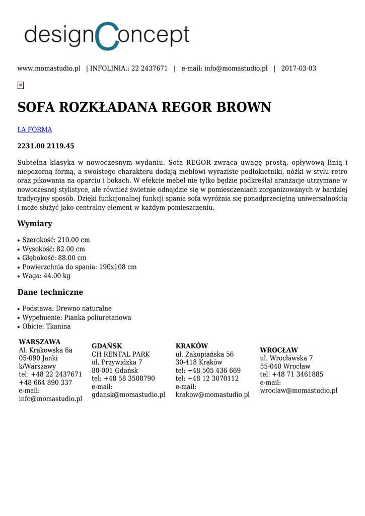 www.momastudio.pl | INFOLINIA.: 22 2437671 | e-mail: [email protected] | 2017-03-03 SOFA ROZKŁADANA REGOR BROWN LA FORMA 2231.00 2119.45 Subtelna klasyka w nowoczesnym wydaniu. Sofa REGOR zwraca uwagę prostą, opływową linią i niepozorną formą, a swoistego charakteru dodają meblowi wyraziste podłokietniki, nóżki w stylu retro oraz pikowania na oparciu i bokach. W efekcie mebel nie tylko będzie podkreślał aranżacje utrzymane w nowoczesnej stylistyce, ale również świetnie odnajdzie się w pomiesczeniach zorganizowanych w bardziej tradycyjny sposób. Dzięki funkcjonalnej funkcji spania sofa wyróżnia się ponadprzeciętną uniwersalnością i może służyć jako centralny element w każdym pomieszczeniu. Wymiary ● ● ● ● ● Szerokość: 210.00 cm Wysokość: 82.00 cm Głębokość: 88.00 cm Powierzchnia do spania: 190x108 cm Waga: 44.00 kg Dane techniczne ● ● ● Podstawa: Drewno naturalne Wypełnienie: Pianka poliuretanowa Obicie: Tkanina WARSZAWA Al. Krakowska 6a 05-090 Janki k/Warszawy tel: +48 22 2437671 +48 664 890 337 e-mail: [email protected] GDAŃSK CH RENTAL PARK ul. Przywidzka 7 80-001 Gdańsk tel: +48 58 3508790 e-mail: [email protected] KRAKÓW ul. Zakopiańska 56 30-418 Kraków tel: +48 505 436 669 tel: +48 12 3070112 e-mail: [email protected] WROCŁAW ul. Wrocławska 7 55-040 Wrocław tel: +48 71 3461885 e-mail: [email protected]