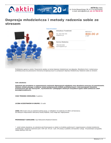 Depresja młodzieńcza i metody radzenia sobie ze stresem Twój konsultant Arkadiusz Trzebiński tel. 503 030 555 [email protected] NOWOŚĆ W OFERCIE 800.00 zł 800.00 zł z VAT Karina Gładecka 796 603 606 [email protected] Profilaktyka agresji w szkole. Poszerzenie wiedzy na temat depresji młodzieńczej i jej objawów. Określenie form i metod pracy profilaktycznej oraz planowanie interwencji terapeutycznych w przejawach depresji młodzieńczej. Radzenie sobie ze stresem. Cele szkolenia: Szkolenie jest przydatne w rozpoznawaniu zachowań depresyjnych młodzieży oraz określeniu przyczyn ich powstawania. Zdobyta wiedza pomaga w doborze metod podejmowania działań profilaktycznych i interwencyjnych.Szkolenie przeznaczone jest dla nauczycieli , wychowawców i pedagogów szkolnych wszystkich typów szkół (zwłaszcza szkół ponadgimnazjalnych). CZAS TRWANIA SZKOLENIA: 4 godziny LICZBA UCZESTNIKÓW W GRUPIE: 15 osób CENA: 800 zł jest ceną za szkolenie jednej grupy, w odległości nie większej niż 20km od Sosnowca. Do dalszych miejscowości doliczamy koszty dojazdu, ceny moga być negocjowane . PROWADZĄCY SZKOLENIE: mgr Aleksandra Radzioch-Dzienis * - jeżeli szkoła oświadcza, że szkolenie jest finansowane w całości ze środków publicznych i organizowane w drodze kształcenia zawodowego, szkolenie zwolnione jest z VAT (art. 43 ust. 1 pkt. 29 ustawy o podatku od towarów i usług). W pozostałym przypadku należy doliczyć 23% Vat Strona 1 / 2 Strona 2 / 2 Powered by TCPDF (www.tcpdf.org)
