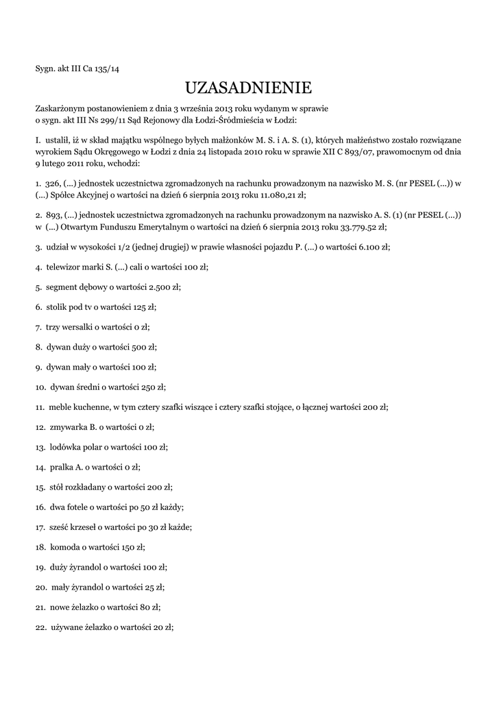 Sygn. akt III Ca 135/14 UZASADNIENIE Zaskarżonym postanowieniem z dnia 3 września 2013 roku wydanym w sprawie o sygn. akt III Ns 299/11 Sąd Rejonowy dla Łodzi-Śródmieścia w Łodzi: I. ustalił, iż w skład majątku wspólnego byłych małżonków M. S. i A. S. (1), których małżeństwo zostało rozwiązane wyrokiem Sądu Okręgowego w Łodzi z dnia 24 listopada 2010 roku w sprawie XII C 893/07, prawomocnym od dnia 9 lutego 2011 roku, wchodzi: 1. 326, (...) jednostek uczestnictwa zgromadzonych na rachunku prowadzonym na nazwisko M. S. (nr PESEL (...)) w (...) Spółce Akcyjnej o wartości na dzień 6 sierpnia 2013 roku 11.080,21 zł; 2. 893, (...) jednostek uczestnictwa zgromadzonych na rachunku prowadzonym na nazwisko A. S. (1) (nr PESEL (...)) w (...) Otwartym Funduszu Emerytalnym o wartości na dzień 6 sierpnia 2013 roku 33.779.52 zł; 3. udział w wysokości 1/2 (jednej drugiej) w prawie własności pojazdu P. (...) o wartości 6.100 zł; 4. telewizor marki S. (...) cali o wartości 100 zł; 5. segment dębowy o wartości 2.500 zł; 6. stolik pod tv o wartości 125 zł; 7. trzy wersalki o wartości 0 zł; 8. dywan duży o wartości 500 zł; 9. dywan mały o wartości 100 zł; 10. dywan średni o wartości 250 zł; 11. meble kuchenne, w tym cztery szafki wiszące i cztery szafki stojące, o łącznej wartości 200 zł; 12. zmywarka B. o wartości 0 zł; 13. lodówka polar o wartości 100 zł; 14. pralka A. o wartości 0 zł; 15. stół rozkładany o wartości 200 zł; 16. dwa fotele o wartości po 50 zł każdy; 17. sześć krzeseł o wartości po 30 zł każde; 18. komoda o wartości 150 zł; 19. duży żyrandol o wartości 100 zł; 20. mały żyrandol o wartości 25 zł; 21. nowe żelazko o wartości 80 zł; 22. używane żelazko o wartości 20 zł; 23. 6 kieliszków do wina, 6 kieliszków do wódki, 5 wazonów i 3 inne naczynia - o łącznej wartości 452 zł; 24. odkurzacz o wartości 0 zł; 25. trzy reprodukcje obrazów o łącznej wartości 150 zł; 26. krajalnica o wartości 50 zł; 27. radio o wartości 30 zł; 28. waga łazienkowa o wartości 30 zł; 29. zasłony, pościele i firanki o wartości 300 zł; 30. 110,834 jednostek uczestnictwa zgromadzonych na rachunku prowadzonym na nazwisko A. S. (1) (nr PESEL (...)) w P. (...) Towarzystwo Funduszy Inwestycyjnych SA. - P. Fundusz Inwestycyjny Otwarty subfundusz P. Zrównoważony (001- (...)) o wartości na dzień 30 lipca 2013 roku 13.095,04 zł; 31. 598,486 jednostek uczestnictwa zgromadzonych na rachunku prowadzonym na nazwisko A. S. (1) (nr PESEL (...)) w P. (...) Towarzystwo Funduszy Inwestycyjnych SA. - P. Fundusz Inwestycyjny Otwarty subfundusz P. Akcji Polskich o wartości na dzień 30 lipca 2013 roku 13.501,84 zł; II. oddalił wniosek w zakresie żądania ustalenia, że w skład majątku wspólnego wchodzi spółdzielcze lokatorskie prawo do lokalu nr (...), przy ul. (...) w Ł., przynależne M. S.; III. ustalił, iż oboje byli małżonkowie mają równe udziały w majątku wspólnym; IV. dokonał podziału majątku wspólnego opisanego w punkcie I w ten sposób, że: 1. przyznał na rzecz M. S. składnik majątkowy opisany w punkcie I podpunkcie 1, 5, 10, 12, 20, 23, 28 postanowienia oraz trzy z 6 krzeseł opisanych w punkcie I 17 postanowienia o łącznej wartości 14.337,21 zł; 2. przyznał na rzecz A. S. (1) składniki majątkowe opisane w punkcie I podpunkcie 2,3,4,6,7,8,9,11,13,14,15,16,17,18,19,21,22,24,25,26,27,29,30 i 31 postanowienia oraz trzy z 6 krzeseł opisanych w punkcie I 17 postanowienia, o łącznej wartości. 68.871,40 zł z obowiązkiem spłaty na rzecz M. S. kwoty 27.267,09 zł w terminie 2 (dwóch) miesięcy od uprawomocnienia się orzeczenia; V. ustalił, iż strony ponoszą koszty postępowania związane ze swoim udziałem w sprawie, które są równe; VI. nakazał A. S. (1) opuszczenie lokalu nr (...), położonego w Ł. przy ul. (...) wraz z mieniem; VII. stwierdził, iż A. S. (1) nie przysługuje prawo do lokalu socjalnego. Apelację od powyższego postanowienia złożył uczestnik postępowania A. S. (1). Zaskarżył postanowienie w części, tj. w punkcie I ppkt 3, a także w punktach II, III, IV, V, VI oraz VII. Skarżonemu postanowieniu zarzucił: 1. błąd w ustaleniach faktycznych polegający na przyjęciu, że A. S. (2) darowała wkład mieszkaniowy na rzecz wnioskodawczyni, podczas gdy ze zgromadzonego w sprawie materiału dowodowego wynika, że A. S. (2) darowała wkład mieszkaniowy obojgu uczestnikom postępowania, a w konsekwencji naruszenie prawa materialnego poprzez niewłaściwe zastosowanie art. 33 pkt 2 k.r.o. i przyjęcie, że spółdzielcze lokatorskie prawo do lokalu oznaczonego numerem (...) przy ul. (...) w Ł. weszło do majątku osobistego wnioskodawczyni i oddalenie w pkt. II wniosku w zakresie żądania ustalenia, że w skład majątku wspólnego wchodzi spółdzielcze prawo do lokalu nr (...) przy ulicy (...) w Ł.; 2. naruszenie prawa materialnego poprzez niewłaściwe zastosowanie art. 46 k.r.o. w zw. z art. 1035 k.c. w zw. z art. 212 § 1 k.c. poprzez przyjęcie wartości brutto ½ udziału we współwłasności pojazdu m-ki P. (...) o nr rej. (...); 3. naruszenie przepisów postępowania mające wpływ na treść postanowienia, a w szczególności: a) art. 567 § 1 k.p.c. poprzez nierozpoznanie w postanowieniu co do istoty sprawy wniosku uczestnika postępowania o ustalenie nierównych udziałów w majątku wspólnym małżonków oraz wniosku o rozliczenie wydatków i nakładów poczynionych przez uczestnika postępowania z majątku osobistego na majątek wspólny; b) art. 328 § 2 k.p.c. , 361 k.p.c., art.233 § l w zw. z art. 13 § 2 k.p.c. poprzez pominięcie w uzasadnieniu postanowienia kwestii zgłoszonego wniosku o ustalenie nierównych udziałów w majątku stron, ustalenie, że w skład majątku wspólnego stron wchodzi mieszkanie przy ulicy (...) w Ł., oraz dowolne ustalenie, że rozliczeniu nie podlega czynsz zapłacony przez uczestnika or