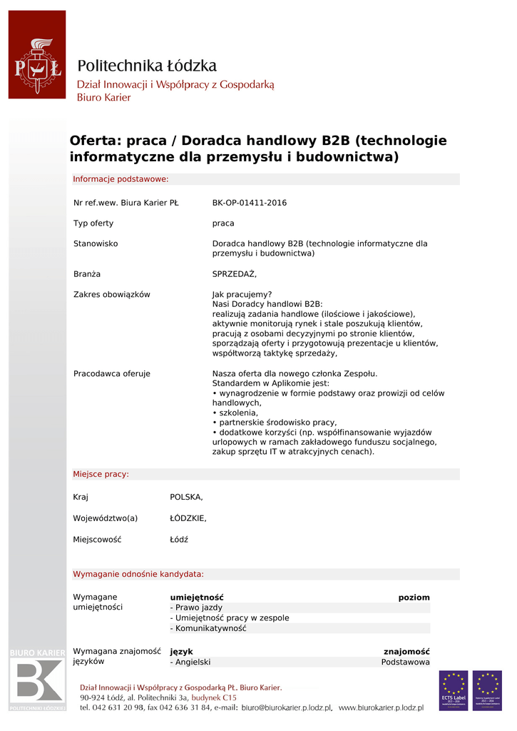 Oferta: praca / Doradca handlowy B2B (technologie informatyczne dla przemysłu i budownictwa) Informacje podstawowe: Nr ref.wew. Biura Karier PŁ BK-OP-01411-2016 Typ oferty praca Stanowisko Doradca handlowy B2B (technologie informatyczne dla przemysłu i budownictwa) Branża SPRZEDAŻ, Zakres obowiązków Jak pracujemy? Nasi Doradcy handlowi B2B: realizują zadania handlowe (ilościowe i jakościowe), aktywnie monitorują rynek i stale poszukują klientów, pracują z osobami decyzyjnymi po stronie klientów, sporządzają oferty i przygotowują prezentacje u klientów, współtworzą taktykę sprzedaży, Pracodawca oferuje Nasza oferta dla nowego członka Zespołu. Standardem w Aplikomie jest: • wynagrodzenie w formie podstawy oraz prowizji od celów handlowych, • szkolenia, • partnerskie środowisko pracy, • dodatkowe korzyści (np. współfinansowanie wyjazdów urlopowych w ramach zakładowego funduszu socjalnego, zakup sprzętu IT w atrakcyjnych cenach). Miejsce pracy: Kraj POLSKA, Województwo(a) ŁÓDZKIE, Miejscowość Łódź Wymaganie odnośnie kandydata: Wymagane umiejętności umiejętność - Prawo jazdy - Umiejętność pracy w zespole - Komunikatywność Wymagana znajomość języków język - Angielski poziom znajomość Podstawowa Dodatkowe umiejętności W naszym Zespole chętnie powitamy osobę, która: umie pracować w zespole, a także… chce podnosić swoje kwalifikacje i rozwijać się w zakresie sprzedaży B2B, ma ambicje, zaangażowanie, wiarę w sukces oraz codzienny uśmiech. Mile widziane będzie jeśli kandydat praktycznie realizował sprzedaż B2B (sprzedaż złożona) Dane kontaktowe: Nazwa firmy/Pracodawcy Kraj Województwo Miasto Adres Kod pocztowy Email Aplikom Sp. z o.o. POLSKA ŁÓDZKIE Łódź ul. Nowe Sady 2 94-102 [email protected] Sposób aplikacji: Osoby zainteresowane dołączeniem do grona pracowników naszej firmy zapraszamy do złożenia CV na adres mailowy [email protected] Zazwyczaj kandydaci przesyłają również list motywacyjny. My prosimy o odpowiedź na 2 poniższe pytania: • Z jakich sukcesów jesteś dumna/dumny w swojej dotychczasowej karierze zawodowej? • Co chcesz osiągnąć w ramach rozwoju zawodowego? Data umieszczenia: Oferta ważna od 20-06-2016 do 31-07-2017 Politechnika Łódzka, jest wpisana pod numerem 2414 do rejestru podmiotów prowadzących agencje zatrudnienia.