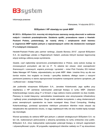 Informacja prasowa Warszawa, 14 stycznia 2013 r. B3System i HP stawiają na rynek MŚP W 2013 r. B3System S.A. mocniej niż dotychczas zaznaczy swoją obecność w sektorze małych i średnich przedsiębiorstw. Działania spółki, prowadzone razem z HewlettPackard Polska, potwierdzają, że rozwój oferty i zwiększenie skali biznesu w segmencie MŚP będzie jednym z najważniejszych celów dla dostawców rozwiązań IT w kolejnych miesiącach. Hewlett-Packard Polska jako partner rankingu „Gazele Biznesu 2012”, zaprosił B3System S.A. do wspólnego udziału w Regionalnych Galach, podczas których laureaci tegorocznej edycji rankingu odbiorą swoje wyróżnienia. Gazele, czyli najbardziej dynamiczne przedsiębiorstwa w Polsce, swój sukces budują na innowacyjnych pomysłach, ale też na IT. To właśnie ten obszar, obok oszczędności finansowych i czasowych, wspiera promocję i sprzedaż – mówi Piotr Ferszka, EG Indirect Sales Manager HP Polska, odpowiedzialny za rynek MŚP. Małe i średnie firmy są dla nas bardzo ważne, bez względu na branżę i specyfikę działania, dlatego razem z naszymi partnerami jesteśmy w stanie zaproponować kompletne rozwiązanie zarówno sprzętowe, jak i software’owe – dodaje Ferszka. Jak podkreśla wiceprezes B3System S.A., Jarosław Kolankowski, jego spółka przy współpracy z HP zamierza wykorzystać potencjał tkwiący w rynku MŚP. Zdaniem Kolankowskiego rozwój usług IT w firmach z tego sektora można podzielić na dwa modele. Pierwszy to model klasyczny: samodzielne inwestowanie oraz utrzymywanie infrastruktury i aplikacji przez przedsiębiorstwo. Drugi model zakłada korzystanie z usług dostarczanych przez zewnętrznych operatorów na bazie rozwiązań klasy Cloud Computing. Według Kolankowskiego, ponieważ sprostanie niektórym potrzebom klientów może okazać się nieopłacalne dla operatorów cloudu, w ciągu najbliższych kilku lat oba modele będą rozwijać się równolegle. Wzrost sprzedaży do sektora MŚP jest jednym z założeń strategicznych B3System S.A. na ten rok, realizowanym jednocześnie z aktywną sprzedażą na rynku enterprise oraz public. B3System S.A. chce maksymalnie wykorzystać potencjał tkwiący w różnych segmentach i zdywersyfikować ryzyko. W przypadku największych klientów nakłady na IT są stosunkowo duże, ale o kontrakty stara się wielu dostawców w warunkach silnej konkurencji cenowej. Duzi klienci posiadając spore zaplecze IT mogą też czasowo wstrzymywać nowe inwestycje. Sektor MŚP natomiast inwestuje w IT w sposób ciągły i przewidywalny. Dla tego sektora stanowimy wartość w postaci wiedzy i umiejętności przeniesienia ich zasobów firmy do zewnętrznego usługodawcy. Szczególnie, że nie ograniczamy się tylko do migracji fizycznej infrastruktury IT, ale zapewniamy bezpieczeństwo i optymalne zarządzanie taką infrastrukturą – mówi Jarosław Kolankowski. Małe i średnie przedsiębiorstwa będą miały możliwość poznania rozwiązań firm HP i B3System S.A. podczas czterech uroczystych spotkań – Regionalnych Gal „Gazel Biznesu 2012”, które odbędą się w Lublinie (22.01.2013 r.), Sosnowcu (23.01.2013 r.), Łodzi (5.02.2013 r.) i Krakowie (13.02.2013 r.). Więcej informacji: http://www.b3system.pl http://www.hp.pl http://gazele.pl/static/about Kontakt dla mediów: Agnieszka Pietrzak ComPress S.A. Tel: +48 605 601 196 e-mail. [email protected] www.compress.pl *** B3System S.A. jest dostawcą rozwiązań IT, zapewniających optymalną wydajność, dostępność i bezpieczeństwo infrastruktury informatycznej firm i instytucji publicznych. Po połączeniu na początku 2011 r. z COPI S.A. i Navipro Sp. z o.o. jest czołowym integratorem w zakresie systemów do przechowywania, backupu i archiwizacji danych, rozwiązań klasy cloud computing oraz systemów do zarządzania usługami i systemami IT. B3System S.A. prowadzi również profesjonalne szkolenia, audyty, usługi wdrożeniowe oraz zapewnia wsparcie techniczne. B3System S.A. jest partnerem największych światowych firm sektora IT, w tym m.in. EMC, NetApp, HP, Vmware, Symantec, Microsoft, CA, Riverbed, Crossbeam, Cisco, RSA. Spółka B3System S.A. ma ponad 12-letnie doświadczenie na polskim rynku, a do grona jej Klientów należą największe podmioty w Polsce. Kontrakty zaraportowane w 2012 r. to m.in. umowy z: Ministerstwo Finansów (usługi migracji systemu Service Desk wraz z licencjami, 4.195.337,82 PLN), Bank Pekao S.A. (sprzedaż oprogramowania wraz z usługami, 498.000,00 USD), T-Mobile/PTC S.A. (sprzedaż sprzętu informatycznego, 282.968,67 EUR; sprzedaż sprzętu i oprogramowania,1 719 000 PLN ), ING Bank Śląski S.A. (usługi serwisowe, 719 579,88 EUR), ING Services Polska Sp. z o.o. (sprzedaż, dostawa oraz instalacja sprzętu informatycznego o łącznej wartości 1 928 056,91 PLN), PKO BP (sprzedaż licencji oprogramowania, 5 192 400,00 PLN; sprzedaż, dostawa oraz instalacja i konfiguracja sprzętu drukującego, dostawa i wdrożenie systemu MPS dla centrali banku i oddziałów, wartość sprzedaży 17 313 260,42 PLN, Euro Bank S.A. (sprzedaż i instalacja sprzętu, 561 421 EUR); Telekomunikacja Polska S.A. (sprzęt informatyczny, 252 846,00 EUR); Netia S.A. (sprzedaż, instalacja i wdrożenie sprzętu informatycznego i oprogramowania oraz serwis, 1 975 520 PLN); ZUS (zakup i wdrożenie Centrum Informacji Telefonicznej, 4 990 325,89 PLN). Od 2007 akcje spółki są notowane na Warszawskiej Giełdzie Papierów Wartościowych S.A. Więcej informacji: http://www.b3system.pl HP to największy na świecie dostawca infrastruktury informatycznej, oprogramowania, usług oraz rozwiązań dla indywidualnych klientów i przedsiębiorstw różnej wielkości. HP tworzy nowe rozwiązania technologiczne, które mają znaczący wpływ na życie ludzi, biznes i społeczeństwo. Wszechstronna oferta HP obejmuje cztery kluczowe obszary: Infrastrukturę, w tym komputerowe systemy osobiste, serwery, pamięci maso