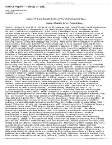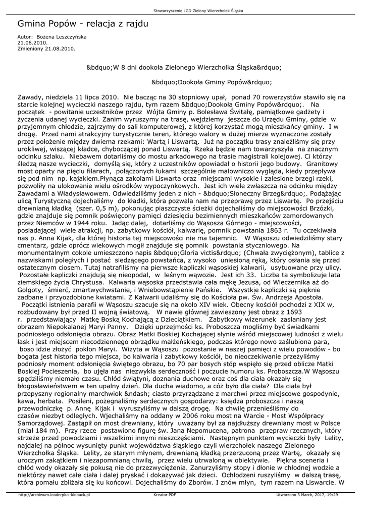 Stowarzyszenie LGD Zielony Wierzchołek Śląska Gmina Popów - relacja z rajdu Autor: Bożena Leszczyńska 21.06.2010. Zmieniony 21.08.2010. „W 8 dni dookoła Zielonego Wierzchołka Śląska” „Dookoła Gminy Popów” Zawady, niedziela 11 lipca 2010. Nie bacząc na 30 stopniowy upał, ponad 70 rowerzystów stawiło się na starcie kolejnej wycieczki naszego rajdu, tym razem „Dookoła Gminy Popów”. Na początek - powitanie uczestników przez Wójta Gminy p. Bolesława Świtałę, pamiątkowe gadżety i życzenia udanej wycieczki. Zanim wyruszymy na trasę, wejdziemy jeszcze do Urzędu Gminy, gdzie w przyjemnym chłodzie, zajrzymy do sali komputerowej, z której korzystać mogą mieszkańcy gminy. I w drogę. Przed nami atrakcyjny turystycznie teren, którego walory w dużej mierze wyznaczone zostały przez położenie między dwiema rzekami: Wartą i Liswartą. Już na początku trasy znaleźliśmy się przy urokliwej, wiszącej kładce, chyboczącej ponad Liswartą. Rzeka będzie nam towarzyszyła na znacznym odcinku szlaku. Niebawem dotarliśmy do mostu arkadowego na trasie magistrali kolejowej. Ci którzy śledzą nasze wycieczki, domyślą się, który z uczestników opowiadał o historii jego budowy. Granitowy most oparty na pięciu filarach, połączonych łukami szczególnie malowniczo wygląda, kiedy przepływa się pod nim np. kajakiem.Płynąca zakolami Liswarta oraz miejscami wysokie i zalesione brzegi rzeki, pozwoliły na ulokowanie wielu ośrodków wypoczynkowych. Jest ich wiele zwłaszcza na odcinku między Zawadami a Władysławowem. Odwiedziliśmy jeden z nich - „Słoneczny Brzeg”. Podążając ulicą Turystyczną dojechaliśmy do kładki, która pozwala nam na przeprawę przez Liswartę. Po przejściu drewnianą kładką (szer. 0,5 m), pokonując piaszczyste ścieżki dojechaliśmy do miejscowości Brzózki, gdzie znajduje się pomnik poświęcony pamięci dziesięciu bezimiennych mieszkańców zamordowanych przez Niemców w 1944 roku. Jadąc dalej, dotarliśmy do Wąsosza Górnego - miejscowości, posiadającej wiele atrakcji, np. zabytkowy kościół, kalwarię, pomnik powstania 1863 r. Tu oczekiwała nas p. Anna Kijak, dla której historia tej miejscowości nie ma tajemnic. W Wąsoszu odwiedziliśmy stary cmentarz, gdzie oprócz wiekowych mogił znajduje się pomnik powstania styczniowego. Na monumentalnym cokole umieszczono napis „Gloria victis” (Chwała zwyciężonym), tablice z nazwiskami poległych i postać siedzącego powstańca, z wysoko uniesioną ręką, który osłania się przed ostatecznym ciosem. Tutaj natrafiliśmy na pierwsze kapliczki wąsoskiej kalwarii, usytuowane przy ulicy. Pozostałe kapliczki znajdują się nieopodal, w leśnym wąwozie. Jest ich 33. Liczba ta symbolizuje lata ziemskiego życia Chrystusa. Kalwaria wąsoska przedstawia cała mękę Jezusa, od Wieczernika aż do Golgoty, śmierć, zmartwychwstanie, i Wniebowstąpienie Pańskie. Wszystkie kapliczki są pięknie zadbane i przyozdobione kwiatami. Z Kalwarii udaliśmy się do Kościoła pw. Św. Andrzeja Apostoła. Początki istnienia parafii w Wąsoszu szacuje się na około XIV wiek. Obecny kościół pochodzi z XIX w, rozbudowany był przed II wojną światową. W nawie głównej zawieszony jest obraz z 1693 r. przedstawiający Matkę Boską Kochającą z Dzieciątkiem. Zabytkowy wizerunek zasłaniany jest obrazem Niepokalanej Maryi Panny. Dzięki uprzejmości ks. Proboszcza mogliśmy być świadkami podniosłego odsłonięcia obrazu. Obraz Matki Boskiej Kochającej słynie wśród miejscowej ludności z wielu łask i jest miejscem niecodziennego obrządku małżeńskiego, podczas którego nowo zaślubiona para, boso idzie złożyć pokłon Maryi. Wizyta w Wąsoszu pozostanie w naszej pamięci z wielu powodów - bo bogata jest historia tego miejsca, bo kalwaria i zabytkowy kościół, bo nieoczekiwanie przeżyliśmy podniosły moment odsłonięcia świętego obrazu, bo 70 par bosych stóp wspięło się przed oblicze Matki Boskiej Pocieszenia, bo ujęła nas niezwykła serdeczność i poczucie humoru ks. Proboszcza.W Wąsoszu spędziliśmy niemało czasu. Chłód świątyni, doznania duchowe oraz coś dla ciała okazały się błogosławieństwem w ten upalny dzień. Dla ducha wiadomo, a cóż było dla ciała? Dla ciała był przepyszny regionalny marchwiok – ciasto przyrządzane z marchwi przez miejscowe gospodynie, kawa, herbata. Posileni, pożegnaliśmy serdecznych gospodarzy: księdza proboszcza i naszą przewodniczkę p. Annę Kijak i wyruszyliśmy w dalszą drogę. Na chwilę przenieśliśmy do czasów niezbyt odległych. Wjechaliśmy na oddany w 2006 roku most na Warcie - Most Współpracy Samorządowej. Zastąpił on most drewniany, który uważany był za najdłuższy drewniany most w Polsce (miał 184 m). Przy rzece postawiono figurę św. Jana Nepomucena, patrona przepraw rzecznych, który strzeże przed powodziami i wszelkimi innymi nieszczęściami. Następnym punktem wycieczki były Lelity, najdalej na północ wysunięty punkt województwa śląskiego czyli wierzchołek naszego Zielonego Wierzchołka Śląska. Lelity, ze starym młynem, drewnianą kładką przerzuconą przez Wartę, okazały się uroczym zakątkiem i niezapomnianą chwilą, przez wielu utrwaloną w obiektywie. Piękna sceneria i chłód wody okazały się pokusą nie do przezwyciężenia. Zanurzyliśmy stopy i dłonie w chłodnej wodzie a niektórzy nawet całe ciała i dalej pryskać i dokazywać jak dzieci. Ochłodzeni ruszyliśmy w dalszą trasę, która pomału zbliżała się ku końcowi. Dojechaliśmy do Zborów. I znów młyn, tym razem na Liswarcie. W http://archiwum.leaderplus-klobuck.pl Kreator PDF Utworzono 3 March, 2017, 19:29 Stowarzyszenie LGD Zielony Wierzchołek Śląska Zborach, nasz kolega Robert, zadbał, aby uczestnicy poznali miejscowe wyroby kulinarne. Degustacja lokalnych produktów odbyła się oczywiści nad rzeką (Liswartą) w piknikowej scenerii. Była