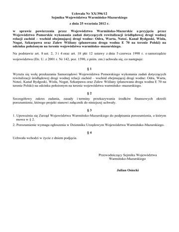 Uchwała Nr XX/396/12 Sejmiku Województwa Warmińsko-Mazurskiego z dnia 25 września 2012 r. w sprawie powierzenia przez Województwo Warmińsko-Mazurskie a przyjęcia przez Województwo Pomorskie wykonania zadań dotyczących rewitalizacji śródlądowej drogi wodnej relacji zachód – wschód obejmującej drogi wodne: Odra, Warta, Noteć, Kanał Bydgoski, Wisła, Nogat, Szkarpawa oraz Zalew Wiślany (planowana droga wodna E 70 na terenie Polski) na odcinku położonym na terenie województwa warmińsko–mazurskiego. Na podstawie art. 8 ust. 2, 3 i 4 oraz art. 18 pkt 12 ustawy z dnia 5 czerwca 1998 r. o samorządzie województwa (Dz. U. z 2001 r. Nr 142, poz. 1590, z późn. zm.) uchwala się, co następuje: §1 Wyraża się wolę przekazania Samorządowi Województwa Pomorskiego wykonania zadań dotyczących rewitalizacji śródlądowej drogi wodnej relacji zachód – wschód obejmującej drogi wodne: Odra, Warta, Noteć, Kanał Bydgoski, Wisła, Nogat, Szkarpawa oraz Zalew Wiślany (planowana droga wodna E 70 na terenie Polski) na odcinku położonym na terenie województwa warmińsko–mazurskiego. §2 Szczegółowy zakres zadania, zasady i terminy przekazywania środków finansowych określi porozumienie, którego projekt stanowi załącznik do niniejszej uchwały. §3 1. Upoważnia się Zarząd Województwa Warmińsko-Mazurskiego do podpisania porozumienia, o którym mowa w § 2. 2. Porozumienie wymaga ogłoszenia w Dzienniku Urzędowym Województwa Warmińsko-Mazurskiego. §4 Uchwała wchodzi w życie z dniem podjęcia. Przewodniczący Sejmiku Województwa Warmińsko-Mazurskiego Julian Osiecki Projekt POROZUMIENIE nr ……………. z dnia ……..…2012 r. w sprawie powierzenia przez Województwo Warmińsko-Mazurskie, a przyjęcia przez Województwo Pomorskie wykonania zadań dotyczących rewitalizacji śródlądowej drogi wodnej relacji zachód – wschód obejmującej drogi wodne: Odra, Warta, Noteć, Kanał Bydgoski, Wisła, Nogat, Szkarpawa oraz Zalew Wiślany (planowana droga wodna E70 na terenie Polski) na odcinku położonym na terenie województwa warmińsko –mazurskiego pomiędzy: Województwem Warmińsko - Mazurskim reprezentowanym przez Zarząd Województwa Warmińsko-Mazurskiego, w imieniu którego działają: 1) Jacek Protas – Marszałek Województwa Warmińsko-Mazurskiego 2) Witold Wróblewski – Członek Zarządu Województwa Warmińsko-Mazurskiego zwanym dalej „Powierzającym” a Województwem Pomorskim reprezentowanym przez Zarząd Województwa Pomorskiego, w imieniu którego działają: 1) Mieczysław Struk – Marszałek Województwa Pomorskiego 2) Ryszard Świlski – Członek Zarządu Województwa Pomorskiego zwanym dalej „Przyjmującym” Na podstawie art. 8 ust. 2, 3 i 4 ustawy z dnia 5 czerwca 1998 r. o samorządzie województwa (Dz. U. z 2001 r. Nr 142, poz. 1590, z późn. zm.) oraz na podstawie uchwały Sejmiku Województwa Warmińsko-Mazurskiego Nr …………. z dnia ……………., w sprawie ……………, jak i uchwały Sejmiku Województwa Pomorskiego Nr …………. z dnia …………… w sprawie …………………………. Strony niniejszego Porozumienia ustalają, co następuje: §1 Powierzający powierza, a Przyjmujący przyjmuje do wykonania: 1. Prowadzenie działań promujących polski odcinek MDW E70, a w szczególności: 1) wydawnictwo materiałów promocyjnych, w tym przewodników, map i broszur, 2) redagowanie strony internetowej, 3) organizacja konferencji tematycznych oraz innych wydarzeń związanych z turystyką wodną, 4) wykonanie materiałów wystawienniczych na wystawy promująco – lobbujące MDW E70. §2 1. Powierzający zapewni na realizację zadania określonego § 1 niniejszego Porozumienia środki finansowe w wysokości 100 000 zł (słownie: sto tysięcy złotych). 2. Środki finansowe, o których mowa w ust. 1 zostaną przekazane na konto Województwa Pomorskiego w PeKaO S.A. 23 1240 6292 1111 0010 4607 6800 z dopiskiem „Rewitalizacja MDW E70” nie wcześniej jak w terminie 14 dni od dnia ogłoszenia niniejszego Porozumienia w Dzienniku Urzędowym Województwa Warmińsko-Mazurskiego. 3. Przyznane środki nie mogą być wykorzystane na inny cel niż określony w § 1. §3 1. Przyjmujący zobowiązuje się wykonać zadania określone w § 1 w terminie do dnia 15 grudnia 2012 r. 2. Przyjmujący w terminie do 22 grudnia 2012 r. zobowiązuje się dostarczyć do Urzędu Marszałkowskiego Województwa Warmińsko-Mazurskiego w Olsztynie sprawozdanie merytoryczne i finansowe z realizacji Porozumienia. 3. Niewykorzystana część środków finansowych podlega zwrotowi na rachunek Powierzającego w Banku Polska Kasa Opieki S.A. Nr 78 1240 5598 1111 0010 3382 7095 nie później niż do 22 grudnia 2012 r. §4 1. Przyjmujący zobowiązuje się do wydatkowania otrzymanych środków w sposób celowy, racjonalny i zgodny z przepisami ustawy z dnia 29 stycznia 2004 r. Prawo zamówień publicznych (t.j. Dz. U. z 2010 r. Nr 113, poz. 759 ze zm.). 2. Przyjmujący zobowiązuje się do przekazania opracowań, o których mowa w § 1 ust.1, oraz wydawnictw i materiałów, o których mowa w § 1 ust. 1 pkt. 4 w wersji elektronicznej i papierowej, do Urzędu Marszałkowskiego Województwa WarmińskoMazurskiego w terminie 14 dni od dnia dostarczenia opracowań do siedziby Urzędu Marszałkowskiego Województwa Pomorskiego (decyduje data wpływu do Urzędu). 3. Powierzający zastrzega sobie prawo do wykorzystania w całości lub w części opracowań określonych w § 1 w dokumentach i materiałach przygotowywanych przez Województwo Warmińsko-Mazurskie bez dodatkowego wynagrodzenia i konieczności uzyskiwania zgody osób trzecich. 1. 2. §5 Powierzający zastrzega sobie prawo do przeprowadzenia kontroli prawidłowości wydatkowania przekazanych środków. Kontrola, o której mowa w ust. 1 odbywać się będzie w szczególności poprzez analizę przedłożonego sprawozdania finansowego. §6 W sprawach nieuregulowanych 