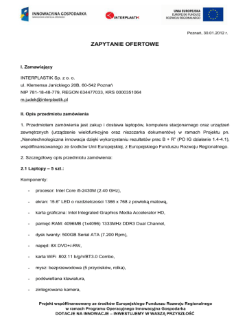 Poznań, 30.01.2012 r. ZAPYTANIE OFERTOWE I. Zamawiający INTERPLASTIK Sp. z o. o. ul. Klemensa Janickiego 20B, 60-542 Poznań NIP 781-18-48-779, REGON 634477033, KRS 0000351064 [email protected] II. Opis przedmiotu zamówienia 1. Przedmiotem zamówienia jest zakup i dostawa laptopów, komputera stacjonarnego oraz urządzeń zewnętrznych (urządzenie wielofunkcyjne oraz niszczarka dokumentów) w ramach Projektu pn. „Nanotechnologiczna innowacja dzięki wykorzystaniu rezultatów prac B + R” (PO IG działanie 1.4-4.1), współfinansowanego ze środków Unii Europejskiej, z Europejskiego Funduszu Rozwoju Regionalnego. 2. Szczegółowy opis przedmiotu zamówienia: 2.1 Laptopy – 5 szt.: Komponenty: - procesor: Intel Core i5-2430M (2.40 GHz), - ekran: 15.6” LED o rozdzielczości 1366 x 768 z powłoką matową, - karta graficzna: Intel Integrated Graphics Media Accelerator HD, - pamięć RAM: 4096MB (1x4096) 1333MHz DDR3 Dual Channel, - dysk twardy: 500GB Serial ATA (7.200 Rpm), - napęd: 8X DVD+/-RW, - karta WiFi 802.11 b/g/n/BT3.0 Combo, - mysz: bezprzewodowa (5 przycisków, rolka), - podświetlana klawiatura, - zintegrowana kamera, Projekt współfinansowany ze środków Europejskiego Funduszu Rozwoju Regionalnego w ramach Programu Operacyjnego Innowacyjna Gospodarka DOTACJE NA INNOWACJE – INWESTUJEMY W WASZĄ PRZYSZŁOŚĆ - czytnik linii papilarnych, 2.2 Laptopy – 2 szt.: Komponenty: - procesor: Intel Core i5-2430M (2.40 GHz), - ekran: 17.3” LED o rozdzielczości 1600 x 900 z powłoką matową, - karta graficzna: Intel Integrated Graphics Media Accelerator HD, - pamięć RAM: 4096MB (1x4096) 1333MHz DDR3 Dual Channel, - dysk twardy: 500GB Serial ATA (7.200 Rpm), - napęd: 8X DVD+/-RW, - karta WiFi 802.11 b/g/n/BT3.0 Combo, - mysz: bezprzewodowa (5 przycisków, rolka), - zintegrowana kamera, - czytnik linii papilarnych, 2.3 Komputer stacjonarny – 1 szt.: Komponenty: - procesor: Intel Core I7-2600M (3.4GHz, 8MB), - karta graficzna: 1GB AMD Radeon HD 6450, - pamięć RAM: 16384MB (4x4096) 1333MHz, - dysk twardy: 500GB Serial ATA (7.200 Rpm), - napęd: 16X DVD+/-RW, - monitor: LCD 24” Full HD, - mysz: bezprzewodowa (5 przycisków, rolka), - klawiatura. Projekt współfinansowany ze środków Europejskiego Funduszu Rozwoju Regionalnego w ramach Programu Operacyjnego Innowacyjna Gospodarka DOTACJE NA INNOWACJE – INWESTUJEMY W WASZĄ PRZYSZŁOŚĆ 2.4 Oprogramowanie – po 8 licencji.: - system: Windows 7 SP1 Professional (64 BIT), - Microsoft Office 2010 Home and Business – wersja polska. 2.5 Wielofunkcyjna sieciowa kolorowa drukarka laserowa – 1 szt.: - szybkość druku (A4): min. 25 stron/min – wydruk czarno-biały; min. 15 stron/min – wydruk kolorowy, - niszczenie CD i kart kredytowych, - faks. 2.6 Niszczarka dokumentów – 1 szt.: - min. Ilość niszczonych kartek: 10 szt., - niszczenie CD i kart kresytowych, - pojemnik na ścinki: ok. 30l. 3. W przypadku pytań lub wątpliwości Zamawiający udzielać będzie wyjaśnień. Pytania lub wątpliwości Dostawcy powinny być kierowane pisemnie lub w wersji elektronicznej na adres Zamawiającego wskazany w punkcie I, przy czym pytania lub wątpliwości nie mogą być składane później aniżeli 1 dzień przed upływem terminu składania ofert. Odpowiedzi Zamawiający będzie udzielał niezwłocznie, tj. w normalnym toku czynności. III. Warunki stawiane dostawcy: 1. Dostawca jest obowiązany wykazać spełnienie następujących wymogów: a) posiadanie i wykazanie właściwymi urzędowymi dokumentami uprawnienia do wykonywania określonej działalności lub czynności, jeżeli przepisy prawa nakładają obowiązek ich posiadania; b) złożenie odpisu z właściwego rejestru lub ewidencji, datowanego nie wcześniej niż 6 miesięcy od dnia otrzymania niniejszego zapytania, potwierdzającego dopuszczenie przedsiębiorcy do obrotu prawnego (zaświadczenie z EDG, odpis z KRS), c) oferowany sprzęt powinien być kompletny i składać się z w pełni kompatybilnych podzespołów oraz spełniać wymogi techniczne i bezpieczeństwa określone przepisami prawa oraz niniejszego zapytania 2. Dokumenty potwierdzające spełnienie przez Dostawcę powyższych warunków powinny być załączone do złożonej przez Dostawcę oferty. Projekt współfinansowany ze środków Europejskiego Funduszu Rozwoju Regionalnego w ramach Programu Operacyjnego Innowacyjna Gospodarka DOTACJE NA INNOWACJE – INWESTUJEMY W WASZĄ PRZYSZŁOŚĆ IV. Termin wykonania zamówienia Termin wykonania zamówienia: do 14 dni od dnia wyboru Dostawcy. V. Termin związania z ofertą Termin związania ofertą upływa dnia 13.02.2012 r. Złożona oferta powinna zawierać oświadczenie oferenta, iż jego oferta jest ważna do dnia upływu terminu związania ofertą określonego w zdaniu poprzedzającym. VI. Opis sposobu przygotowania oferty Oferent powinien sporządzić ofertę w języku polskim, w formie pisemnej, na maszynie lub komputerze i podpisaną w sposób nieścieralny; oferta powinna być umieszczona w zabezpieczonej (zamkniętej) kopercie i opisana w sposób następujący: „Dostawa laptopów, komputera stacjonarnego oraz urządzeń zewnętrznych (urządzenie wielofunkcyjne oraz niszczarka dokumentów) dla Interplastik Sp. z o.o.” Do przygotowania oferty właściwy będzie formularz ofertowy, stanowiący załącznik do niniejszego zapytania. VII. Miejsce oraz termin składania ofert 1. Ofertę należy złożyć najpóźniej do dnia 06.02.2012 r. godz. 12:00 w siedzibie Zamawiającego tj. w Poznaniu przy ul. Janickiego 20B. W przypadku składania osobistego ofertę należy złożyć w sekretariacie na II piętrze. Otwarcie ofert Otwarcie ofert nastąpi o godz. 12:15 dnia 06.02.2012 r. w siedzibie Zamawiającego tj. w Poznaniu przy ul. Janickiego 20B. 2. Oferty złożone po terminie nie będą rozpatrywane. 3. Oferent może, przed upływem terminu składania ofert, zmienić lub wycofać ofertę. 4. W toku weryfikacji i oceny ofert Zamawiający może żą