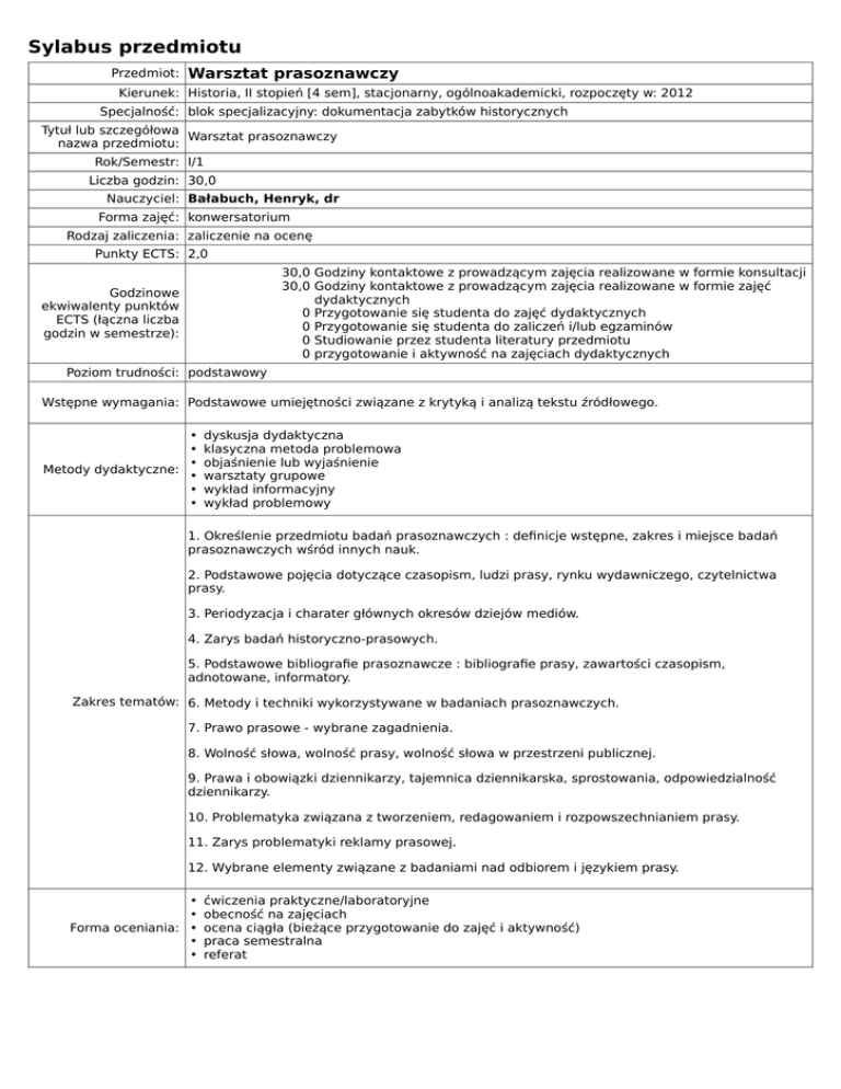 Sylabus przedmiotu Przedmiot: Warsztat prasoznawczy Kierunek: Historia, II stopień [4 sem], stacjonarny, ogólnoakademicki, rozpoczęty w: 2012 Specjalność: blok specjalizacyjny: dokumentacja zabytków historycznych Tytuł lub szczegółowa Warsztat prasoznawczy nazwa przedmiotu: Rok/Semestr: I/1 Liczba godzin: 30,0 Nauczyciel: Bałabuch, Henryk, dr Forma zajęć: konwersatorium Rodzaj zaliczenia: zaliczenie na ocenę Punkty ECTS: 2,0 30,0 Godziny kontaktowe z prowadzącym zajęcia realizowane w formie konsultacji 30,0 Godziny kontaktowe z prowadzącym zajęcia realizowane w formie zajęć dydaktycznych 0 Przygotowanie się studenta do zajęć dydaktycznych 0 Przygotowanie się studenta do zaliczeń i/lub egzaminów 0 Studiowanie przez studenta literatury przedmiotu 0 przygotowanie i aktywność na zajęciach dydaktycznych Godzinowe ekwiwalenty punktów ECTS (łączna liczba godzin w semestrze): Poziom trudności: podstawowy Wstępne wymagania: Podstawowe umiejętności związane z krytyką i analizą tekstu źródłowego. • • • Metody dydaktyczne: • • • dyskusja dydaktyczna klasyczna metoda problemowa objaśnienie lub wyjaśnienie warsztaty grupowe wykład informacyjny wykład problemowy 1. Określenie przedmiotu badań prasoznawczych : definicje wstępne, zakres i miejsce badań prasoznawczych wśród innych nauk. 2. Podstawowe pojęcia dotyczące czasopism, ludzi prasy, rynku wydawniczego, czytelnictwa prasy. 3. Periodyzacja i charater głównych okresów dziejów mediów. 4. Zarys badań historyczno-prasowych. 5. Podstawowe bibliografie prasoznawcze : bibliografie prasy, zawartości czasopism, adnotowane, informatory. Zakres tematów: 6. Metody i techniki wykorzystywane w badaniach prasoznawczych. 7. Prawo prasowe - wybrane zagadnienia. 8. Wolność słowa, wolność prasy, wolność słowa w przestrzeni publicznej. 9. Prawa i obowiązki dziennikarzy, tajemnica dziennikarska, sprostowania, odpowiedzialność dziennikarzy. 10. Problematyka związana z tworzeniem, redagowaniem i rozpowszechnianiem prasy. 11. Zarys problematyki reklamy prasowej. 12. Wybrane elementy związane z badaniami nad odbiorem i językiem prasy. • • Forma oceniania: • • • ćwiczenia praktyczne/laboratoryjne obecność na zajęciach ocena ciągła (bieżące przygotowanie do zajęć i aktywność) praca semestralna referat 1.Historia prasy polskiej, red. J. Łojek, t. 1-4,Warszawa 1976-1980. 2. J. Łojek, J. Myśliński, W. Władyka,Dzieje prasy polskiej, Warszawa 1988. 3.Encyklopedia wiedzy o prasie, red. F. Maślanki, Wrocław 1976. 4.Słownik wiedzy o mediach, red. E. Chudziński, Warszawa 2009, 5.Dziennikarstwo i świat mediów, red. Z. Bauer, E. Chudziński, Kraków 2000. 6.Metody i technii badawcze w prasoznawstwie, t. 1-3, Warszawa 1969-1971. Literatura: 7. P. Buchwald-Pelcowa,Cenzura w dawnej Polsce. Między prasy drukarską a stose m, Warszawa 1997. 8. B. Golka,Kształtowanie się wiedzy o prasie w Polsce XIX wieku . Wrocław 1969. 9. A. PAczkowski,Czwarta włądza : prasa dawniej i dziś, Warszawa 2000, 10. J. Sobczak,Prawo prasowe. Podręcznik akademicki, Warszawa 2000. 11. W. Pisarek,Nowa retoryka dziennikarska, Kraków 2002, 12. P. Levison,Miękkie ostrze. Naturalna historia mediów i przyszłość rewolucji informatycznej . WArszawa 1999. Dodatkowe informacje: Wszelkie dodatkowe informacje : [email protected]
