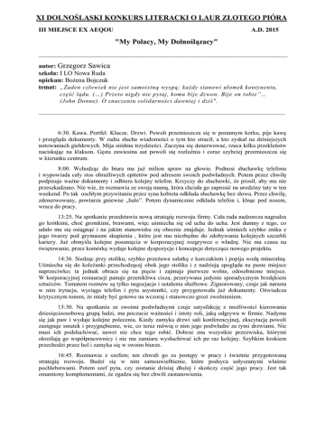 XI DOLNOŚLĄSKI KONKURS LITERACKI O LAUR ZŁOTEGO PIÓRA III MIEJSCE EX AEQOU A.D. 2015 "My Polacy, My Dolnoślązacy" ____________________________________________________________________________ autor: Grzegorz Sawica szkoła: I LO Nowa Ruda opiekun: Bożena Bojczuk temat: „Żaden człowiek nie jest samoistną wyspą; każdy stanowi ułomek kontynentu, część lądu. (…) Przeto nigdy nie pytaj, komu bije dzwon. Bije on tobie”… (John Donne). O znaczeniu solidarności dawniej i dziś". __________________________________________________________________________________ 6:30. Kawa. Portfel. Klucze. Drzwi. Powoli przemieszcza się w porannym korku, pije kawę i przegląda dokumenty. W radiu słucha wiadomości o tym kto stracił, a kto zyskał na dzisiejszych notowaniach giełdowych. Mija siódma trzydzieści. Zaczyna się denerwować, rzuca kilka przekleństw naciskając na klakson. Gęsta zawiesina aut powoli się rozluźnia i coraz szybciej przemieszcza się w kierunku centrum. 8:00. Wchodząc do biura ma już milion spraw na głowie. Podnosi słuchawkę telefonu i wypowiada cały stos obraźliwych epitetów pod adresem swoich podwładnych. Potem przez chwilę podpisuje ważne dokumenty i odbiera kolejny telefon. Krzyczy do słuchawki, że prosił, aby mu nie przeszkadzano. Nie wie, że rozmawia ze swoją mamą, która chciała go zaprosić na urodziny taty w ten weekend. Po tak oschłym przywitaniu przez syna kobieta odkłada słuchawkę bez słowa. Przez chwilę, zdenerwowany, powtarza gniewne „halo”. Potem dynamicznie odkłada telefon i, klnąc pod nosem, wraca do pracy. 13:25. Na spotkaniu przedstawia nową strategię rozwoju firmy. Cała rada nadzorcza nagradza go krótkimi, choć gromkimi, brawami, więc uśmiecha się od ucha do ucha. Jest dumny z tego, co udało mu się osiągnąć i na jakim stanowisku się obecnie znajduje. Jednak uśmiech szybko znika z jego twarzy pod grymasem skupienia , które jest mu niezbędne do zdobywania kolejnych szczebli kariery. Już obmyśla kolejne posunięcia w korporacyjnej rozgrywce o władzę. Nie ma czasu na świętowanie, przez komórkę wydaje kolejne dyspozycje i koncepcje dotyczące nowego projektu. 14:36. Siedząc przy stoliku, szybko przeżuwa sałatkę z kurczakiem i popija wodą mineralną. Uśmiecha się do koleżanki przechodzącej obok jego stolika i z nadzieją spogląda na puste miejsce naprzeciwko; ta jednak obraca się na pięcie i zajmuje pierwsze wolne, odosobnione miejsce. W korporacyjnej restauracji panuje przenikliwa cisza, przerywana jedynie sporadycznym brzdękiem sztućców. Tematem rozmów są tylko negocjacje i ustalenia służbowe. Zignorowany, czuje jak narasta w nim irytacja, wyciąga telefon i pyta asystentki, czy przygotowała już dokumenty. Oświadcza krytycznym tonem, że miały być gotowe na wczoraj i stanowczo grozi zwolnieniem. 15:30. Na spotkaniu ze swoimi podwładnymi czuje satysfakcję z możliwości kierowania dziesięcioosobową grupą ludzi, ma poczucie ważności i istoty roli, jaką odgrywa w firmie. Nadyma się jak paw i wydaje kolejne polecenia. Kiedy zamyka drzwi sali konferencyjnej, ekscytację powoli zastępuje smutek i przygnębienie, wie, co teraz mówią o nim jego podwładni za tymi drzwiami. Nie musi ich podsłuchiwać, nawet nie chce tego robić. Dobrze zna wszystkie przezwiska, którymi określają go współpracownicy i nie ma zamiaru wysłuchiwać ich po raz kolejny. Szybkim krokiem przechodzi przez hol i zamyka się w swoim biurze. 16:45. Rozmawia z szefem; ten chwali go za postępy w pracy i świetnie przygotowaną strategię rozwoju. Budzi się w nim samouwielbienie, które podsyca usłyszanymi właśnie pochlebstwami. Potem szef pyta, czy zostanie dzisiaj dłużej i skończy część jego pracy. Jest tak omamiony komplementami, że zgadza się bez chwili zastanowienia. 17:00. Patrząc na górę papierów piętrzącą się na jego biurku, pluje sobie w brodę, że znowu dał się wkopać w odwalanie papierkowej roboty za szefa. Patrzy jak szaro-granatowy tłum pracowników opuszcza biurowiec. Odpala papierosa, robi kawę i luzuje krawat. Siada przy biurku i bierze pierwszy plik dokumentów ze sterty. 22:30. Wstaje obolały z krzesła, powoli zbiera swoje rzeczy do aktówki. Słania się na nogach. Kiedy jest już gotowy, zakłada marynarkę, gasi światło, zamyka drzwi i przekręca klucz w zamku. W holu podchodzi do automatu z przekąskami, z kieszeni marynarki wyciąga drobne i ,ziewając, wrzuca je do maszyny. Wstukuje numer na klawiaturze i po chwili w pustym pomieszczeniu rozlega się stukot puszki, która obija się o ściany maszyny. Powoli schyla się po napój energetyczny. Otwiera i pije bardzo powoli. 22:45. Wsiada do samochodu. Odpala silnik i wyjeżdża z podziemnego parkingu. Szybko włącza się do ruchu, który jest znacznie mniejszy niż rano. Jedzie drogą ekspresową do swojego domu na przedmieściach. Czuje się bardzo senny, powieki zaczynają mu ciążyć, ziewa i podnosi puszkę z napojem energetycznym leżącą na siedzeniu pasażera razem z plikiem papierów, które musi przejrzeć na jutro. Pije dwa ostatnie łyki i stara się skupić na tym, by nie zasnąć. Budzi go głośny klakson. Szybko przekręca kierownicę w prawo i wraca na swój pas ruchu. Jego serce bije dwa razy szybciej, adrenalina uderza mu do głowy. Zdecydowanie przyspiesza. Chce jak najszybciej być w domu. 23:30. Otwiera drzwi. Zapala światło, o jego nogi ociera się rudy koty. Domaga się jedzenia. Wiesza marynarkę na wieszaku w przedpokoju, na podłodze stawia aktówkę i człapie do kuchni. Sypie kocią karmę do miski i stawia na podłodze. Bierze szybki prysznic i wreszcie dociera do łóżka. Znowu jestem dzieckiem, siedzę w szkolnej ławce, poznaję twarze swoich kolegów i koleżanek z podstawówki. Dzwoni dzwonek i zaczyna się lekcja historii. Starszy nauczyciel z siwymi włosami i brodą wchodzi do klasy i zaczyna opowiadać nam o tym, jak ludzie jednoczyli si