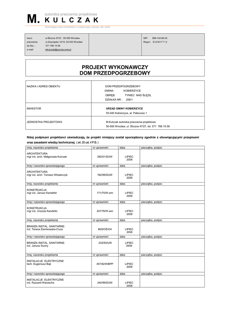M. autorska pracownia projektowa K U L C Z A K Dolnośląska Izba Architektów nr ewidencyjny członka: DS.-0378 biuro: ul.Śliczna 47/27, 50-550 Wrocław NIP: pracownia: ul.Zwycięska 14/10, 53-033 Wrocław Regon: 9 3 2 8 0 7 7 1 2 tel./fax. : 071 766 15 06 e-mail: [email protected] 899-142-66-02 PROJEKT WYKONAWCZY DOM PRZEDPOGRZEBOWY NAZWA I ADRES OBIEKTU DOM PRZEDPOGRZEBOWY GMINA: KOBIERZYCE OBRĘB: TYNIEC NAD ŚLĘZĄ DZIAŁKA NR : 206/1 URZĄD GMINY KOBIERZYCE INWESTOR 55-040 Kobierzyce, al. Pałacowa 1 JEDNOSTKA PROJEKTOWA M.Kulczak autorska pracownia projektowa 50-550 Wrocław, ul. Śliczna 47/27, tel. 071 766 15 06 NiŜej podpisani projektanci oświadczają, Ŝe projekt niniejszy został sporządzony zgodnie z obowiązującymi przepisami oraz zasadami wiedzy technicznej. ( art. 20 ust. 4 P.B. ) imię, nazwisko projektanta ARCHITEKTURA mgr inŜ. arch. Małgorzata Kulczak Imię i nazwisko sprawdzającego ARCHITEKTURA mgr inŜ. arch. Tomasz Włodarczyk imię, nazwisko projektanta KONSTRUKCJA mgr inŜ. Janusz Kandefer Imię i nazwisko sprawdzającego KONSTRUKCJA mgr inŜ. Urszula Kandefer imię, nazwisko projektanta BRANśA INSTAL. SANITARNE: inŜ. Teresa Ziemkowska-Ciura Imię i nazwisko sprawdzającego BRANśA INSTAL. SANITARNE: inŜ. Janusz Suchy imię, nazwisko projektanta INSTALACJE ELEKTRYCZNE tech. Eugeniusz Bąk Imię i nazwisko sprawdzającego INSTALACJE ELEKTRYCZNE inŜ. Ryszard Warzecha nr uprawnień: 292/01/DUW nr uprawnień: 162/99/DUW nr uprawnień: 171/75/W-wm nr uprawnień: 247/76/W-wm nr uprawnień: 66/DOŚ/O4 nr uprawnień: 232/93/UW nr uprawnień: 457/82/WBPP nr uprawnień: 240/99/DUW data: pieczątka, podpis: LIPIEC 2008 data: pieczątka, podpis: LIPIEC 2008 data: pieczątka, podpis: LIPIEC 2008 data: pieczątka, podpis: LIPIEC 2008 data: pieczątka, podpis: LIPIEC 2008 data: pieczątka, podpis: LIPIEC 2008 data: pieczątka, podpis: LIPIEC 2008 data: LIPIEC 2008 pieczątka, podpis: