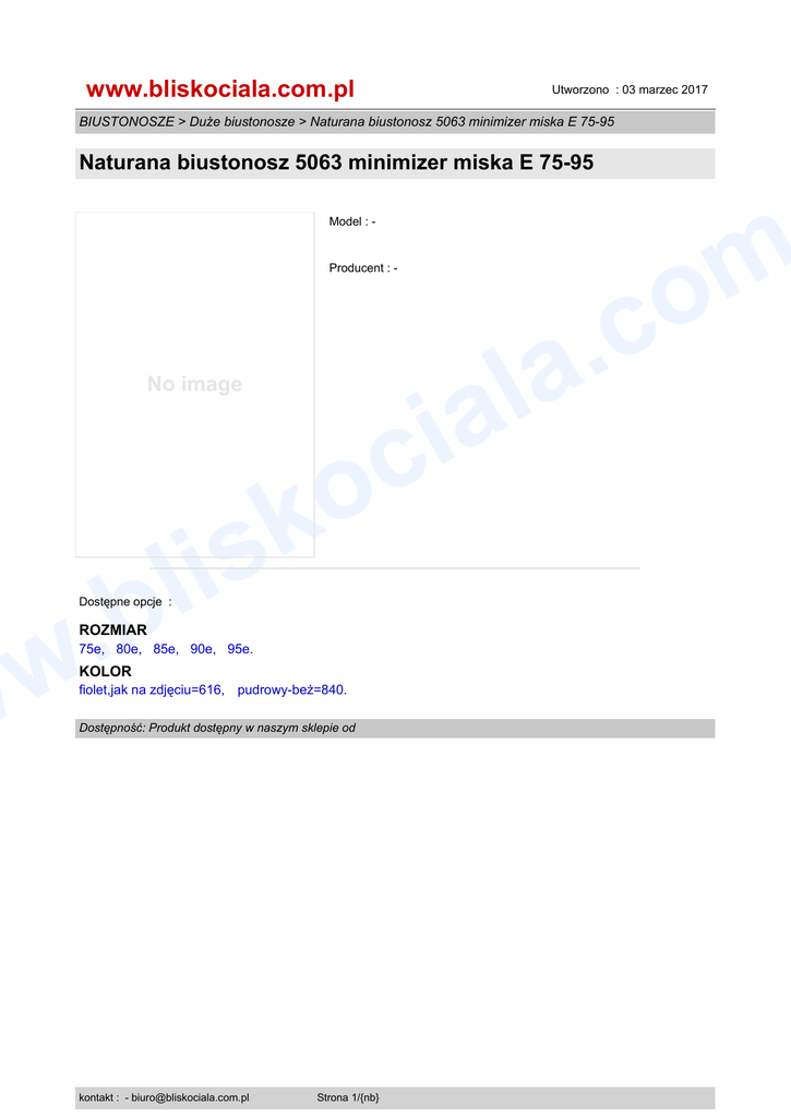 www.bliskociala.com.pl Utworzono : 03 marzec 2017 BIUSTONOSZE > Duże biustonosze > Naturana biustonosz 5063 minimizer miska E 75-95 Naturana biustonosz 5063 minimizer miska E 75-95 m o c . a l a Model : - Producent : - No image i c o k il s w b . w Dostępne opcje : ROZMIAR 75e, 80e, 85e, 90e, 95e. KOLOR fiolet,jak na zdjęciu=616, pudrowy-beż=840. Dostępność: Produkt dostępny w naszym sklepie od kontakt : - [email protected] Strona 1/{nb}