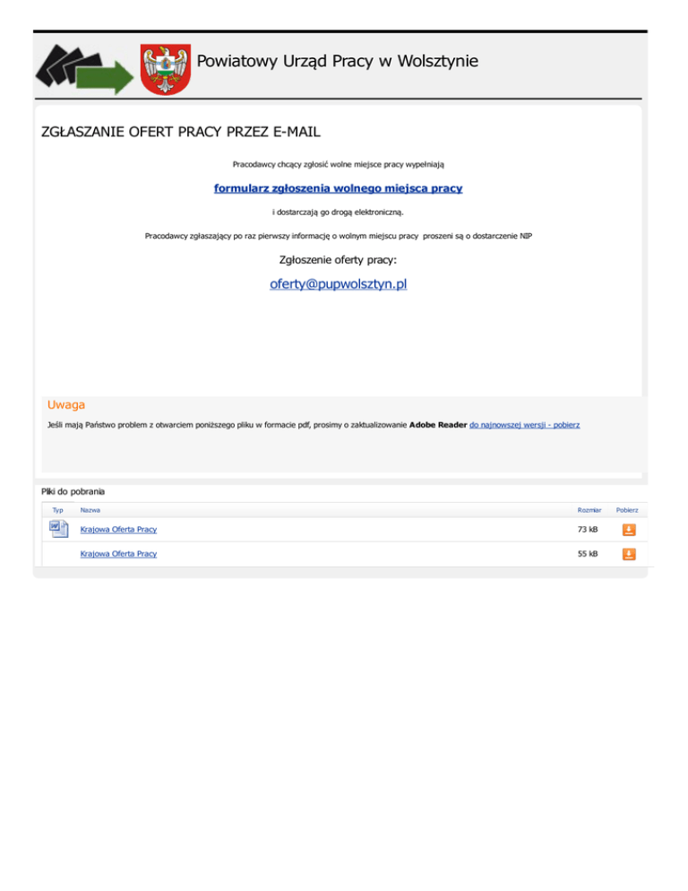 Powiatowy Urząd Pracy w Wolsztynie ZGŁASZANIE OFERT PRACY PRZEZ E-MAIL Pracodawcy chcący zgłosić wolne miejsce pracy wypełniają formularz zgłoszenia wolnego miejsca pracy i dostarczają go drogą elektroniczną. Pracodawcy zgłaszający po raz pierwszy informację o wolnym miejscu pracy proszeni są o dostarczenie NIP Zgłoszenie oferty pracy: [email protected] Uwaga Jeśli mają Państwo problem z otwarciem poniższego pliku w formacie pdf, prosimy o zaktualizowanie Adobe Reader do najnowszej wersji - pobierz Pliki do pobrania Typ Nazwa Rozmiar Krajowa Oferta Pracy 73 kB Krajowa Oferta Pracy 55 kB Pobierz