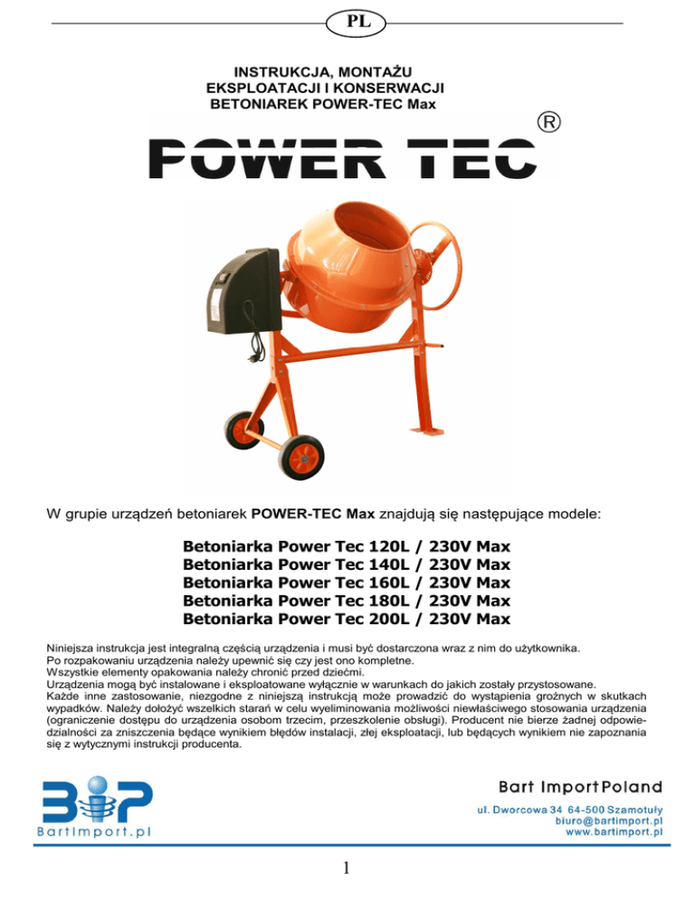 PL INSTRUKCJA, MONTAŻU EKSPLOATACJI I KONSERWACJI BETONIAREK POWER-TEC Max W grupie urządzeń betoniarek POWER-TEC Max znajdują się następujące modele: Betoniarka Power Tec 120L / 230V Max Betoniarka Power Tec 140L / 230V Max Betoniarka Power Tec 160L / 230V Max Betoniarka Power Tec 180L / 230V Max Betoniarka Power Tec 200L / 230V Max Niniejsza instrukcja jest integralną częścią urządzenia i musi być dostarczona wraz z nim do użytkownika. Po rozpakowaniu urządzenia należy upewnić się czy jest ono kompletne. Wszystkie elementy opakowania należy chronić przed dziećmi. Urządzenia mogą być instalowane i eksploatowane wyłącznie w warunkach do jakich zostały przystosowane. Każde inne zastosowanie, niezgodne z niniejszą instrukcją może prowadzić do wystąpienia groźnych w skutkach wypadków. Należy dołożyć wszelkich starań w celu wyeliminowania możliwości niewłaściwego stosowania urządzenia (ograniczenie dostępu do urządzenia osobom trzecim, przeszkolenie obsługi). Producent nie bierze żadnej odpowiedzialności za zniszczenia będące wynikiem błędów instalacji, złej eksploatacji, lub będących wynikiem nie zapoznania się z wytycznymi instrukcji producenta. Tabliczka znamionowa 1 PL Spis treści 1. BEZPIECZEŃSTWO ...................................................................................................3 2. OPIS ...........................................................................................................................4 3. ROZPAKOWYWANIE ................................................................................................4 4. MONTAŻ ....................................................................................................................5 5. PIERWSZE URUCHOMIENIE .................................................................................11 6. KONSERWACJA .......................................................................................................12 7. DEKLARACJE ZGODNOŚĆ......................................................................................14 8. WARUNKI GWARANCJI..........................................................................................15 2 PL 1. Bezpieczeństwo Miejsce pracy powinno być utrzymane w czystości. Bałagan może spowodować zranienia. Obserwuj stan miejsca pracy. Nie używaj urządzenia w wilgotnych i mokrych miejscach. Nie wystawiaj na deszcz. Zachowaj miejsce pracy dobrze oświetlone. Nie używaj urządzeń elektrycznych w pobliżu substancji wybuchowych. Urządzenie należy trzymać z dala od dzieci. W miejscu pracy nie powinny przebywać dzieci. Nie należy pozwalać dzieciom obsługiwać urządzenia. Gdy urządzenie jest nie używane powinno być przechowywane w suchym miejscu aby zapobiegać rdzy. Zawsze pozostawiaj zamknięte urządzenia z dala od dzieci. Nie należy przeciążać urządzenia. Praca będzie bardziej efektywna i bezpieczna jeśli betoniarka będzie pracowała w trybie do jakiego jest przeznaczona. Nie należy używać nieodpowiednich dodatków gdy pojemność przekracza dozwoloną pojemność urządzenia. Należy używać odpowiednich narzędzi do pracy. Nie należy próbować użyć urządzenia do celów do których nie jest przystosowane. Ubranie robocze. Nie należy nosić luźnych ubrań i biżuterii która może być wciągnięta przez ruchome części urządzenia. Odporne elektrycznie ubrania i antypoślizgowe obuwie jest zalecane przy pracy. Okrywać długie włosy podczas pracy. Należy używać ochrony na oczy i uszy. Zawsze należy nosić ochronne gogle. Używaj maski ochronnej na twarz w przypadku pracy przy dużym zapyleniu. Nie należy zbliżać się do urządzenia które jest w ruchu. Należy konserwować urządzenie. Zachowuj urządzenie w czystości dla lepszego działania. Należy postępować zgodnie z instrukcją w przypadku wymiany części urządzenia. Należy przeprowadzać przeglądy urządzenia, a w przypadku uszkodzenia naprawa powinna być przeprowadzona przez autoryzowany punkt. Uchwyty powinny być utrzymywane w czystości i nie pokryte olejem lub smarem. Należy odłączyć zasilanie w przypadku gdy urządzenie jest nie używane, myte lub jest konserwowane. Usuń narzędzia takie jak klucze z urządzenia przed włączeniem silnika. Zapobiegaj niechcianemu włączeniu. Zawsze sprawdzaj czy włącznik jest na pozycji OFF, gdy urządzenie jest wyłączone lub akurat podłączane do sieci. Bądź czujny. Nie używaj urządzenia gdy jesteś zmęczony. Sprawdzaj uszkodzone części. Przed użyciem urządzenia każda część która mogła się uszkodzić powinna być sprawdzona. Każda część która jest uszkodzona lub luźna powinna być naprawiona lub wymieniona przez wykwalifikowanego mechanika. Nie należy używać urządzenia jeśli jakaś część jest uszkodzona. Chroń się przed porażeniem prądem. Należy unikać kontaktu z częściami elektrycznymi. Wymiana części. Wymiana części powinna być przeprowadzona przez fachowca. Części zamienne powinny być wykorzystywane tylko takie, które są przystosowane do tego urządzenia. 3 PL Utrzymuj wolne miejsce wokół urządzenia. Utrzymuj wszystkie osoby ( oprócz operatora ) z dala od urządzenia w odległości minimum 2 m. Nie należy przeciążać urządzenia. Przeładowanie może spowodować uszkodzenie urządzenia. Nie przesuwaj urządzenia podczas pracy. Głowica lub silnik może zostać uszkodzony. Nie używaj urządzenia pod wpływem alkoholu lub narkotyków. Jeżeli zażywasz jakieś lekarstwa zapoznaj się ulotką czy są jakieś przeciwwskazania do obsługi urządzeń. Uwaga!!! Użytek urządzeń elektrycznych może być mocno uzależniony od zmienności napięcia w lokalnej sieci elektrycznej. Nie należy stosować przewodów zbyt długich oraz o małym przekroju poprzecznym, min 2,5 mm2. Stosowanie innych przewodów może prowadzić do spadku napięcia. Rozwiązania problemów i uszkodzeń o których mowa w tej instr