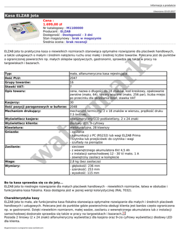 Informacje o produkcie Utworzono 03-03-2017 Kasa ELZAB Jota Cena : 1.699,00 zł Nr katalogowy : M1100000 Producent : ELZAB Dostępność : Dostępność - 3 dni Stan magazynowy : brak w magazynie Średnia ocena : brak recenzji mała, alfanumeryczna kasa rejestrująca 2047 16 7 cena, nazwa o długości do 18 znaków, kod kreskowy, opakowanie zwrotne (maks. 64), towary wiązane (maks. 256 par), liczba miejsc po przecinku dla określania ilości, stawka VAT Kasjerzy: 30 Ilość pozycji paragonowych w buforze: 2048 Mechanizm drukujący: mechanizm termiczny, 2 x 18 znaków w wierszu, prędkość druku 7,5 linii/sek. Wyświetlacz kasjera: alfanumeryczny LCD podświetlany, 2 x 24 znaki Wyświetlacz klienta: diodowy LED, 9-cyfrowy Klawiatura: wielofunkcyjna, 28 klawiszy Gniazda: - zasilania - komunikacji z PC (RS232) lub wagi ELZAB Prima - czytnika lub przejściówki do czytnika i wagi - szuflady na pieniądze Zasilanie: - sieciowe - z wewnętrznego akumulatora 6V/ 4,5 Ah - z instalacji samochodowej 12 - 30 V/ maks. 1 A - zewnętrzny zasilacz w komplecie Waga: 2,8 kg (bez zasilacza) Wymiary: - głębokość: 236 mm - szerokość: 253 mm - wysokość: 115 mm w at Typ: Ilość PLU: Grupy towarów: Stawki VAT: Opis towaru: er m ar k ELZAB Jota to praktyczna kasa o niewielkich rozmiarach stanowiąca optymalne rozwiązanie dla placówek handlowych, a także usługowych o małym i średnim natężeniu ruchu oraz małej i średniej liczbie towarów. Polecana jest do punktów o ograniczonej powierzchni np. małych sklepów spożywczych, gastronomii, sprawdza się także w pracy na targowiskach i bazarach. Bo ta kasa sprawdza się co do joty... ELZAB Jota to niedrogie rozwiązanie dla małych placówek handlowych - niewielkich rozmiarów, łatwa w obsłudze i funkcjonalna kasa fiskalna. Kasa dostępna jest w jasnej wersji kolorystycznej (RAL 7032). Charakterystyka kasy ELZAB Jota to mała, ale funkcjonalna kasa fiskalna stanowiąca optymalne rozwiązanie dla małych i średnich placówek handlowych i usługowych. Polecana jest do punktów gdzie powierzchnia obsługi klienta jest bardzo często ograniczona np. w gastronomii. Dzięki niewielkim rozmiarom, małej wadze, zasilaniu z wewnętrznego akumulatora lub z instalacji samochodowej doskonale sprawdza się także w pracy na targowiskach i bazarach. Posiada 2 liniowy (2 x 24 znaki) alfanumeryczny wyświetlacz dla kasjera oraz 9-cio cyfrowy wyświetlacz diodowy LED dla klienta. Wygenerowano w programie www.oscGold.com Wyposażona jest w nowoczesny, dwustacyjny, termiczny mechanizm CITIZEN drukujący jednocześnie oryginał i kopię paragonu. Wygoda pracy i eksploatacji Alfanumeryczna klawiatura i czytelny wyświetlacz z polskimi znakami oraz prosty układ menu ułatwiają obsługę, która szybko staje się intuicyjna nawet dla początkującego kasjera. Dzięki temu nawet intensywna i długa praca na kasie jest przyjemna. Nakładka na klawiaturę pełni funkcje ochronne w warunkach narażenia na zachlapanie (np. gastronomia) i pozwala zachować urządzenie w czystości przez długi okres czasu. Niewielkie koszty eksploatacji zapewniają stosowane materiały eksploatacyjne - tanie i wąskie rolki papierowe. Typowe zdarzenia Kasa obsługuje wszystkie typowe operacje w trakcie sprzedaży: ● ● ● ● ● ● towar do sprzedaży można wybrać za pomocą numeru w bazie towarowej, nazwy, kodu kreskowego lub zaprogramowanego klawisza (48 klawiszy), poszczególne pozycje paragonu można przeglądać, korygować lub usuwać przed jego zamknięciem, dostępne jest udzielanie rabatów i narzutów na poszczególne pozycje i na cały paragon, można sprzedawać za gotówkę lub za pomocą 3 innych form płatności, możliwa jest sprzedaż towarów ważonych, dla par towarów, które zawsze sprzedawane są razem dostępna jest sprzedaż wiązana, kasa obsługuje sprzedaż i przyjmowanie opakowań zwrotnych. er m ar k ● Udogodnienia poprawiające komfort pracy Kasa udostępnia 10 klawiszy skrótów do wybranych funkcji kasjera i raportów. Kasjer może sprzedawać z inną ceną niż zapamiętana w bazie towarowej dzięki funkcji "otwarta cena". Kasa obsługuje kody kreskowe z ilością i ceną. Dodatkowe korzyści dla użytkownika Rozwiązanie drukowania raportów zmian w bazie towarowej jest oszczędne i zmniejsza zużycie papieru. Kasa przypomina użytkownikowi o terminie obowiązkowego przeglądu okresowego. at Gotowa na Euro Kasa umożliwia przyjmowanie zapłaty w innej walucie niż złoty, zdefiniowanej poprzez (dwuwalutowość). nazwę i kurs wymiany w Współpraca z urządzeniami zewnętrznymi Obsługę klientów usprawnia współpraca z dodatkowymi urządzeniami: czytnikiem kodów kreskowych, wagą (polecana ELZAB Prima), szufladą (polecana rodzina szuflad ELZBA Gamma), komputerem. Do połączenia kasy z komputerem niezbędny jest interfejs komputerowy, który dopasowuje sygnały kasy do standardu RS232. Transmisja danych między kasą a komputerem PC odbywa się w tle, dzięki temu nie przerywa pracy kasjera. Wykorzystując multiplekser można podłączyć do jednego komputera do 8 kas. Zastosowanie modemu kasowego ELZAB Telekas umożliwia zdalne sterowanie i wymianę danych np. odczyt danych o sprzedaży z odległego stanowiska zarządzania poprzez sieć telefoniczną. W placówkach gastronomicznych kasa może współpracować z drukarką zamówień do kuchni ELZAB Kuchta. FORMULARZ ZAMÓWIENIA KASY FISKALNEJ: exel.png
