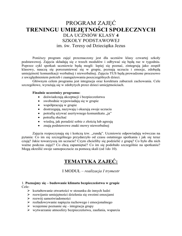 PROGRAM ZAJĘĆ TRENINGU UMIEJĘTNOŚCI SPOŁECZNYCH DLA UCZNIÓW KLASY 4 SZKOŁY PODSTAWOWEJ im. św. Teresy od Dzieciątka Jezus Poniższy program zajęć przeznaczony jest dla uczniów klasy czwartej szkoły podstawowej. Zajęcia składają się z trzech modułów i odbywać się będą raz w tygodniu. Poprzez cykl spotkań uczniowie będą mogli: lepiej się poznać, zintegrują jako zespół klasowy, nauczą się porozumiewać się w grupie, poznają uczucia i emocje, zdobędą umiejętność komunikacji werbalnej i niewerbalnej. Zajęcia TUS będą prowadzone procesowo z uwzględnieniem potrzeb i zaangażowania poszczególnych dzieci. Głównym celem programu jest integracja oraz korektura zaburzeń zachowania. Cele szczegółowe, wyrażają się w zdobytych przez dzieci umiejętnościach. Finalnie uczestnicy programu: doświadczają akceptacji i bezpieczeństwa swobodnie wypowiadają się w grupie współpracują w grupie dostrzegają, nazywają i okazują swoje uczucia potrafią używać asertywnego komunikatu „ja” potrafią słuchać wiedzą, jak poradzić sobie z złością lub agresją znają podstawowe znaki mowy niewerbalnej Zajęcia rozpoczynają się i kończą tzw. „rundą”. Uczniowie odpowiadają wówczas na pytania: Co im się szczególnego przydarzyło od czasu ostatniego spotkania i jak się teraz czują? Jakie towarzyszą im uczucia? Czym chcieliby się podzielić z grupą? Co było dla nich ważne podczas zajęć? Co chcą zapamiętać? Co im się podobało szczególnie na spotkaniu? Mogą określić swoje samopoczucie za pomocą skali (od 1do 10). TEMATYKA ZAJĘĆ: I MODUŁ – realizacja I trymestr 1. Poznajmy się – budowanie klimatu bezpieczeństwa w grupie Cele: kształtowanie otwartości w stosunku do innych ludzi rozwijanie umiejętności dzielenia się swoimi emocjami rozwój samoświadomości rozładowywanie napięcia ruchowego i emocjonalnego wzajemne poznanie się - integracja grupy wytwarzanie atmosfery bezpieczeństwa, zaufania, wsparcia 2. Tworzymy grupę – ustalamy zasady Cele: Nauczenie się otwartego i bezpośredniego zachowania wobec innych w grupie” tu i teraz” Odreagowanie napięć i emocji Wytworzenie bezpiecznej atmosfery w grupie przez zabawę Ustalenie reguł i norm grupowych Rozwijanie koncentracji uwagi Rozwijanie twórczego myślenia 3. Ćwiczenia wstępne i budujące emocje Cele: Budowanie wzajemnego zaufania ukazywanie pozytywnych cech osobowości Tworzenie doświadczeń korygujących zaburzenia związane z funkcjonowaniem społecznym Dostarczanie dzieciom poczucia bezpieczeństwa, otwartości, i szczerości Przyjazne współdziałanie w grupie Zwiększenie świadomości emocji odczuwalnych w różnych sytuacjach Konfrontowanie własnych opinii na swój temat z opiniami innych osób II MODUŁ – realizacja II trymestr 1. Rozpoznajemy i nazywamy uczucia Cele: Akceptowanie własnych uczuć Dostrzeganie potrzeb innych, budowanie empatii Nabywanie umiejętności wyrażania uczuć Rozpoznawanie emocji Zgodne działanie w zespole 2. Wyrażamy uczucie swoje i szanujemy uczucia innych Cele: Odreagowanie napięć i emocji Właściwe rozpoznawanie emocji u siebie i innych Rozwijanie umiejętności udzielania informacji zwrotnych Zgodne współdziałanie w grupie Tworzenie prac pokazujących uczucia 3. Uczymy się lepiej rozumieć siebie i innych Cele: Rozwijanie zdolności empatycznych Utrwalenie więzi grupowej Nauka radzenia sobie z napięciem (relaks) - odreagowanie emocji Uświadomienie sobie, że uczucia mogą się zmieniać Wytworzenie atmosfery bezpieczeństwa, zaufania i wsparcia Rozpoznawanie emocji u siebie i innych III MODUŁ – realizacja III trymestr 1. Opanowujemy i przezwyciężamy złości Cele: Odreagowanie napięcia Ćwiczenie umiejętności koniecznych do wzięcia odpowiedzialności za swoje zachowanie w kontaktach z innymi i do panowania nad tymi zachowaniami Ćwiczenie umiejętności radzenia sobie z napięciem Określenie własnego sposobu radzenia sobie ze złością Sposoby przeżywania złości i jej skutki 2. Dlaczego zachowujemy się agresywnie Cele: Odróżnienie zachowania agresywnego od nieagresywnego, określenie definicji agresji Uświadomienie sobie przez uczniów różnych przyczyn zachowań agresywnych Poszukiwanie sposobu zapobiegania tym zrachowaniom Pokazywanie dzieciom, że dokuczanie i wyśmiewanie to też agresja oraz uświadomienie im, jakie może powodować skutki 3. Używanie agresji, grupa, a przemoc Cele: Pokazanie dzieciom, co wpływa na to, że uczą się agresji, przemocy Uświadomienie uczniom istnienia społecznych przekazów używania agresji Uświadomienie sobie przez uczniów związku pomiędzy przynależnością do grupy, a zachowaniami agresywnymi jej członków 4. Eliminowane zachowań agresywnych w grupie i poza nią Cele: Wdrażanie do odpowiedzialności za swoje czyny Ustalenie wspólnego stanowiska w danej sprawie Zrozumienie intencji drugiej osoby oraz określenie strategii konstruktywnego rozwiązania konfliktów Wykształcenie motywacji do unikania sytuacji „trudnych” Eliminowanie postaw agresywnych Zaznajomienie wychowanków z postawami, normami i wzorami akceptowanymi i obowiązującymi a danym społeczeństwie, środowisku 5. Co znaczy być asertywnym Cele: Przybliżenie terminu „ asertywność” Nauczenie się rozpoznawania poszczególnych typów zachowań- agresywne, uległe i asertywne Zapoznanie z własnymi „ asertywnymi prawami” Trenowanie zachowań asertywnych Uczenie się argumentacji Nauka pokonywania barier komunikacji między ludzkiej Nauka efektywnego porozumiewania się w sytuacjach konfliktowych Poznanie zasad komunikacji interpersonalnej