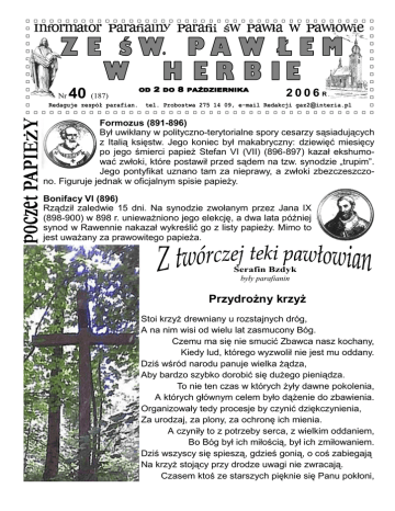 Nr 40 (187) Redaguje zespół parafian. OD 2 DO 8 PAŹDZIERNIKA 2 0 0 6 R. tel. Probostwa 275 14 09, e-mail Redakcji [email protected] Formozus (891-896) Był uwikłany w polityczno-terytorialne spory cesarzy sąsiadujących z Italią księstw. Jego koniec był makabryczny: dziewięć miesięcy po jego śmierci papieŜ Stefan VI (VII) (896-897) kazał ekshumować zwłoki, które postawił przed sądem na tzw. synodzie „trupim”. Jego pontyfikat uznano tam za nieprawy, a zwłoki zbezczeszczono. Figuruje jednak w oficjalnym spisie papieŜy. Bonifacy VI (896) Rządził zaledwie 15 dni. Na synodzie zwołanym przez Jana IX (898-900) w 898 r. uniewaŜniono jego elekcję, a dwa lata później synod w Rawennie nakazał wykreślić go z listy papieŜy. Mimo to jest uwaŜany za prawowitego papieŜa. Serafin Bzdyk były parafianin PrzydroŜny krzyŜ Stoi krzyŜ drewniany u rozstajnych dróg, A na nim wisi od wielu lat zasmucony Bóg. Czemu ma się nie smucić Zbawca nasz kochany, Kiedy lud, którego wyzwolił nie jest mu oddany. Dziś wśród narodu panuje wielka Ŝądza, Aby bardzo szybko dorobić się duŜego pieniądza. To nie ten czas w których Ŝyły dawne pokolenia, A których głównym celem było dąŜenie do zbawienia. Organizowały tedy procesje by czynić dziękczynienia, Za urodzaj, za plony, za ochronę ich mienia. A czyniły to z potrzeby serca, z wielkim oddaniem, Bo Bóg był ich miłością, był ich zmiłowaniem. Dziś wszyscy się spieszą, gdzieś gonią, o coś zabiegają Na krzyŜ stojący przy drodze uwagi nie zwracają. Czasem ktoś ze starszych pięknie się Panu pokłoni, Ale tych moŜna policzyć na palcach jednej dłoni. Zanim zapalę na cmentarzu znicze, Stanąłem Panie tuŜ przed Twoim Obliczem. I bardzo gorąco, serdecznie Cię pozdrawiam, Oraz modlitwę Ŝarliwą do Ciebie odmawiam. Czy mnie jeszcze pamiętasz Jezu mój kochany, Kiedy setki razy biegłem obok Ciebie zadyszany, Spiesząc do Kościoła - słuŜyć do Mszy świętej, I modlić się serdecznie do Matki Najświętszej, Ty Panie Jezu nigdy mnie nie zapomniałeś, Lecz wielkimi skarbami w Ŝyciu mnie obdarowałeś. Teraz stoję przed Tobą Panie, aby Ci dziękować, Lecz czym mogę Cię Panie BoŜe obdarować? Nie mam srebra ni złota, nie jestem bogaty, Więc kładę u stóp Twoich te piękne kwiaty. A nawet gdybym stał się dla Ciebie męczennikiem, To i tak pozostanę Twoim Panie dozgonnym dłuŜnikiem. Mój drogi Czytelniku zwaŜ co jeszcze ci powiem: Ten KrzyŜ stoi na skrzyŜowaniu dróg w Pawłowie. 2005 r. RóŜaniec - z pozoru to zwykła modlitwa. Modlitwa długa i nuŜąca. Tak jednak nie jest! RóŜaniec to nie jest zwykła modlitwa - to sposób na Ŝycie! Odmawiając róŜaniec oddajemy wszystkie nasze radości i smutki - całe nasze - Ŝycie Maryi. Gdy zwracamy się do Niej z ufnością, moŜemy być pewni, Ŝe Ona wstawia się za nami u Swego Syna - Jezusa. RóŜaniec jest zatem modlitwą zawierzenia, która kieruje nas przez Maryję do Jezusa. Odmówienie całej części róŜańca trwa 25 minut... To jedyne 25 minut z 1440 - które otrzymujemy od Boga kaŜdego dnia! O mocy róŜańca moŜna pisać wiele - jednak to kaŜdy osobiście musi się o niej przekonać. Spróbuj moŜe juŜ dziś porozmawiać z Maryją trzymając w ręku róŜaniec. Ja spróbowałem i wiem, Ŝe radości i pokoju, jakie daje mi ta modlitwa, nie da mi Ŝaden człowiek. W październiku zapraszamy na NaboŜeństwa RóŜańcowe w tygodniu o godz. 1730 a w niedzielę o godz. 1630. Za miesiąc – 21 października (sobota) – od godz. 800 powtórzona zostanie „AKCJA SZKŁO”. Zbierane będzie przygotowane przez Was białe i kolorowe szkło. Prosimy o nie wyrzucanie szkła do kontenerów i gromadzenie go do czasu naszej akcji. Uwaga: prosimy nie gromadzić szyb – nie będą przez nas zbierane – huta szkła nie przyjmuje ich do utylizacji. PODZIĘKOWANIE Serdeczne Bóg zapłać Czcigodnym Księdzu Proboszczowi oraz Księdzu Seniorowi za odprawione Msze św., Członkom Bractwa śywego RóŜańca, Scholi, wszystkim którzy uświetnili naszą uroczystość, a takŜe wszystkim zacnym krewnym i znajomym za uczestnictwo we Mszy św., złoŜone nam Ŝyczenia i inne dowody Ŝyczliwości z okazji naszych Jubileuszy. Maria i Edward Morgała Jolanta i Marian Calow OGŁOSZENIA DUSZPASTERSKIE: Rozpoczął się miesiąc październik i Tydzień Miłosierdzia. Zapraszam wszystkich parafian, szczególnie młodzieŜ i dzieci, które są wolne od zajęć szkolnych, do udziału w NaboŜeństwach RóŜańcowych dziś o godz. 1630 a w ciągu tygodnia o godz. 1730. Jutro, w poniedziałek, będzie odwiedzanie chorych. Zgłoszenia przyjmowane są dziś w zakrystii. Jutro, w czasie NaboŜeństwa róŜańcowego poświecone zostaną róŜańce dzieci, które w przyszłym roku przystąpią do I Komunii św. Msza św. szkolna odprawiona zostanie w środę o godz. 800. W tym tygodniu przypadają I czwartek, I piątek i I sobota miesiąca. Zapraszam do komunii św. wynagradzającej. Okazja do Spowiedzi św. dla dzieci szkolnych i gimnazjalnych - w czwartek o godz. 1700, dla młodzieŜy - w sobotę o godz. 1700; dla dorosłych przez cały tydzień rano i wieczorem. Członków Bractwa „śywego RóŜańca” zapraszamy na Mszę św. w sobotę o godz. 700 oraz na NaboŜeństwa róŜańcowe o godz. 1730. Za dzisiejsze ofiary na potrzeby naszej parafii składam „Bóg zapłać”. W przyszłą niedzielę kolekta przeznaczona będzie na WyŜsze Śląskie Seminarium Duchowne. W kancelarii parafialnej moŜna zamawiać Msze św. na rok 2007. MłodzieŜ, która nie przyjęła Sakramentu bierzmowania, proszona jest o zgłoszenie się po Mszy św. niedzielnej w zakrystii. U ministrantów moŜna nabyć „Gość Niedzielny”. Wszystkim zainteresowanym przypominamy bankowe konto parafii: BANK PeKaO SA I O/Gliwice 29 1240 1343 1111 0000 2370 6710 Parafia św. Pawła Apostoła ul. Gen. Wł. Sikorskiego 67b; 41-809 Zabrze INTENCJE MSZY św. od 2 do 8 paździ