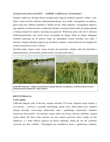 Sympetrum fonscolombii – szablak wędrowny (wiosenny) Gatunek wędrowny, którego obszar występowania sięga do ciepłych regionów Afryki i Azji. Stały i częsty bywalec obszaru śródziemnomorskiego, lecz rzadki i nieregularny na północy, gdzie może być całkiem pospolity w latach inwazji. Silne migracje i nieregularne napływy tego gatunku są obserwowane w północnej Europie wczesnym latem kiedy pozostałe gatunki z rodzaju Sympetrum dopiero zaczynają się pojawiać. Widywany przez cały rok w obszarze śródziemnomorskim, lecz mniej liczny od grudnia do lutego. Dalej na północ migrujące osobniki pojawiają się od połowy maja, po reprodukcji rozwój larwalny trwa tylko 3 miesiące. Drugie pokolenie pojawia się od połowy sierpnia i może przetrwać do listopada ale zwykle nie przeżywa zimy w Polsce. Zasiedla ciepłe, stojące wody, często otwarte, nie porośnięte i płytkie, takie jak zbiorniki w kamieniołomach, żwirowniach, piaskowniach, nowopowstałe stawy. 20-06-2007 Katowice – Dolina Trzech Stawów, płytki zbiornik wyrobiskowy, na którym obserwowano Sympetrum fonscolombii (fot. Alicja Miszta) IDENTYFIKACJA Cechy ogólne Całkowita długość ciała 33-40 mm, samego odwłoka 22-29 mm. Gatunek często mylony z Crocothemis erythraea z powodu niebieskiego spodu oczu, żółtej plamy przy nasadzie tylnego skrzydła, czerwonego zabarwienia ciała i podobnego zachowania. Jednakże Sympetrum fonscolombii ma znacznie węższe ciało a na twarzy, tułowiu, odwłoku i nogach czarne plamy lub linie. Ciało samców ma inny odcień czerwieni, który wydaje się być malinowy, a z boku tułowia pojawia się barwa niebieska, której nie ma ani szafranka czerwona ani inne szablaki. Pterostigma jest stosunkowo jasna i ograniczona cienkimi, czarnymi żyłkami co czyni ją szczególnie wyraźną. Pierś jest gęsto porośnięta jasnymi włoskami. Twarz dojrzałych samców jest żywo czerwona, kontrastuje z białawymi bokami. Zachowanie Samce są bardziej terytorialne niż u pozostałych Sympetrum. Okupują widoczne miejsca skąd podejmują dłuższe loty, spędzając większość czasu raczej w locie niż siedząc. Składanie jaj odbywa się w tandemach na otwartej ale płytkiej wodzie. Widywano migrujące tandemy składające jaja w morzu a nawet do chlorowanej wody basenów kąpielowych. Cykl życiowy jest odmienny od pozostałych Sympetrum, gdyż jaja rozwijają się gwałtownie zaraz po złożeniu, bez spoczynku zimowego. Rozwój larwalny trwa około 60 - 90 dni. Samica i samiec Sympetrum fonscolombii (fot. Bogusław Daraż, Alicja Miszta)