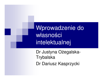 Wprowadzenie do własności intelektualnej Dr Justyna OżegalskaTrybalska Dr Dariusz Kasprzycki Własność intelektualna wytwory ludzkiego umysłu (stany faktyczne) mające charakter niematerialny nie będące rzeczami, choć zazwyczaj ucieleśnione w przedmiotach materialnych WŁASNOŚĆ INTELEKTUALNA Prawo autorskie utwory przedmioty praw pokrewnych Własność przemysłowa wynalazki wzory użytkowe wzory przemysłowe znaki towarowe oznaczenia geograficzne topografie scalone nowe odmiany roślin oznaczenia przedsiębiorstw Know--how Know poufne informacje techniczne, gospodarcze receptury prototypy PRAWO AUTORSKIE Prawo autorskie Przedmiot ochrony: 1) utwór 2) prawa pokrewne Podstawa prawna: Ustawa o prawie autorskim i prawach pokrewnych z 4 lutego 1994 r. artystyczne wykonania, fonogramy, wideogramy, nadania stacji radiowych i telewizyjnych, pierwsze wydania, wydania naukowe i krytyczne (tzw. prawa pokrewne wydawców) Przesłanki ochrony UTWÓR - każdy przejaw działalności twórczej: o indywidualnym charakterze ustalony w jakiejkolwiek postaci niezależnie od wartości, przeznaczenia sposobu wyrażenia Wyłączenia spod ochrony: są chronione odkrycia, idee, procedury, metody działania - „jako takie” nie Sposób uzyskiwania ochrony ochrona powstaje automatycznie w momencie ustalenia utworu w jakiejkolwiek postaci, bez spełnienia jakichkolwiek formalności (umieszczenia adnotacji o zastrzeżeniu praw, rejestracji dzieła, wniesienia opłat) Uzyskanie ochrony nie wymaga ponoszenia żadnych kosztów! Kategorie utworów Utwory: - samoistne, - zależne (opracowania), - utwory inspirowane - zbiorowe Przykłady opracowań utworów : - tłumaczenia, przeróbki, adaptacje Podmiot prawa autorskiego 1. TWÓRCA - pierwotnie uprawniony z tytułu praw osobistych i majątkowych 2. WSPÓLTWORCA 3. Inny podmiot uprawniony z tytułu autorskich praw majątkowych: - pracodawca - wydawca 4. Uprawnienia instytucji naukowych Podmiot prawa autorskiego TWÓRCA autorskie prawa majątkowe oraz autorskie prawa osobiste przysługują twórcy tj. osobie fizycznej, która stworzyła dzieło domniemanie autorstwa WSPÓŁAUTORSTWO domniemanie równości udziałów - z tym, że każdy ze współautorów może żądać określenia przez sąd innej wielkości udziałów na podstawie wkładu pracy twórczej tylko wniesienie wkładu twórczego do utworu stanowi podstawę przyznania statusu współtwórcy ! Utwory pracownicze Autorskie prawa majątkowe do utworu stworzonego przez pracownika w wyniku wykonywania obowiązków ze stosunku pracy nabywa pracodawca (art. 12 pr.aut): z chwilą przyjęcia utworu wyjątek w - programy komputerowe - art. 74 ust.3 granicach wynikających z celu umowy o pracę i zgodnego zamiaru stron jeżeli ustawa lub umowa o pracę nie stanowią inaczej! Utwory pracownicze Wyłączenie z zakresu „utworów pracowniczych” utworów stworzonych: na zamówienie na podstawie umowy o dzieło lub umowy zlecenia w ramach konkursu Pracodawca nabywa tylko autorskie prawa majątkowe, autorskie prawa osobiste zawsze pozostają przy twórcy ! Utwory naukowe prawo instytucji naukowej do pierwszeństwa opublikowania utworu naukowego pracownika, stworzonego w wyniku wykonywania obowiązków ze stosunku pracy jeżeli umowa o pracę nie stanowi inaczej! prawo pracownika do wynagrodzenia prawo do korzystania przez instytucję naukowa bez odrębnego wynagrodzenia z materiału naukowego zawartego w utworze oraz udostępniania utworu osobom trzecim, jeżeli to wynika z uzgodnionego przeznaczenia utworu lub zostało postanowione w umowie. Treść praw autorskich Treść praw autorskich: prawa osobiste - art. 16 pr. aut. prawa majątkowe - art. 17 pr. aut Autorskie prawa osobiste Treść - prawo do: autorstwa utworu oznaczenia utworu swoim nazwiskiem, lub pseudonimem, albo do udostępniania go anonimowo nienaruszalności treści i formy utworu oraz jego rzetelnego wykorzystania prawo do integralności utworu decydowania o pierwszym udostępnieniu utworu publiczności nadzoru nad sposobem korzystania z utworu Charakterystyka przysługują tylko i wyłącznie twórcy - os. fizycznej chronią więź twórcy z utworem nieograniczone w czasie (trwają nawet po śmierci twórcy) niezbywalne Autorskie prawa majątkowe Treść: prawo do korzystania z utworu na wszystkich polach eksploatacji prawo do rozporządzania utworem na wszystkich polach eksploatacji prawo do wynagrodzenia za korzystanie z utworu Charakterystyka: - ograniczone w czasie - - trwają 70 lat od śmierci twórcy są zbywalne podlegają dziedziczeniu Dozwolony użytek Dozwolony użytek osobisty - art. 23 1. 2. - korzystanie z utworu rozpowszechnionego - nieodpłatne - bez konieczności uzyskania zezwolenia twórcy - korzystanie w zakresie własnego użytku osobistego lub w kręgu najbliższych osób - wyłączony w odniesieniu do programów komputerowych i elektronicznych baz danych Dozwolony użytek publiczny - art. 24 – 33 - np. tzw. prawo cytatu PATENTY Patent Patent – prawo wyłączne udzielane - bez względu na dziedzinę techniki - na wynalazki, które są - nowe, - nieoczywiste, - nadają się do przemysłowego stosowania PATENT Prawo podmiotowe Prawo wyłączne do korzystania z wynalazku Na określonym terytorium W określonym czasie Patenty – nowość Wynalazek uważa się za nowy, jeśli nie jest on częścią stanu techniki. Stan techniki: wszystko to, co przed datą, według której oznacza się pierwszeństwo do uzyskania patentu, zostało udostępnione do wiadomości powszechnej oraz informacje zawarte w zgłoszeniach wynalazków lub wzorów użytkowych, korzystających z wcześniejszego pierwszeństwa Nowość światowa Patenty – pierwszeństwo Krajowe Dzień złożenia wniosku przed UPRP Konwencyjne Dzień prawidłowo złożonej aplikacji w państwie członkowskim Konwencji Paryskiej 12 miesięcy Z wystawy Dzień oficjalnie uznanej wystawy 6 miesięcy Konwencja Paryska o wystawach międzynarodowych 1928 Patent – poziom wyna