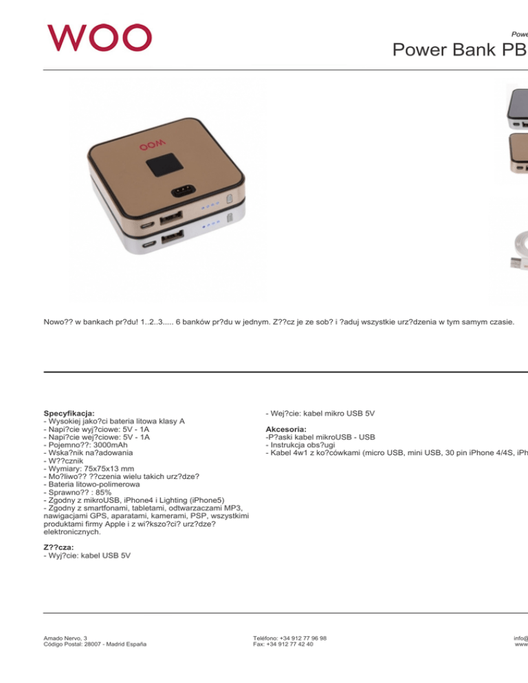 Powe Power Bank PB3 Nowo?? w bankach pr?du! 1..2..3..... 6 banków pr?du w jednym. Z??cz je ze sob? i ?aduj wszystkie urz?dzenia w tym samym czasie. Specyfikacja: - Wysokiej jako?ci bateria litowa klasy A - Napi?cie wyj?ciowe: 5V - 1A - Napi?cie wej?ciowe: 5V - 1A - Pojemno??: 3000mAh - Wska?nik na?adowania - W??cznik - Wymiary: 75x75x13 mm - Mo?liwo?? ??czenia wielu takich urz?dze? - Bateria litowo-polimerowa - Sprawno?? : 85% - Zgodny z mikroUSB, iPhone4 i Lighting (iPhone5) - Zgodny z smartfonami, tabletami, odtwarzaczami MP3, nawigacjami GPS, aparatami, kamerami, PSP, wszystkimi produktami firmy Apple i z wi?kszo?ci? urz?dze? elektronicznych. - Wej?cie: kabel mikro USB 5V Akcesoria: -P?aski kabel mikroUSB - USB - Instrukcja obs?ugi - Kabel 4w1 z ko?cówkami (micro USB, mini USB, 30 pin iPhone 4/4S, iPh Z??cza: - Wyj?cie: kabel USB 5V Amado Nervo, 3 Código Postal: 28007 - Madrid España Teléfono: +34 912 77 96 98 Fax: +34 912 77 42 40 info@ www