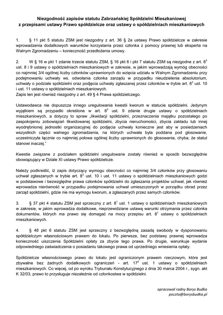 Niezgodność zapisów statutu Zabrzańskiej Spółdzielni Mieszkaniowej z przepisami ustawy Prawo spółdzielcze oraz ustawy o spółdzielniach mieszkaniowych 1. § 11 pkt 5 statutu ZSM jest niezgodny z art. 36 § 2a ustawy Prawo spółdzielcze w zakresie wprowadzenia dodatkowych warunków korzystania przez członka z pomocy prawnej lub eksperta na Walnym Zgromadzeniu – konieczność przedłożenia umowy. 2. W § 16 w pkt 1 zdanie trzecie statutu ZSM, § 16 pkt 6 i pkt 7 statutu ZSM są niezgodne z art. 83 ust. 8 i 9 ustawy o spółdzielniach mieszkaniowych w zakresie, w jakim wprowadzają wymóg obecności co najmniej 3/4 ogólnej liczby członków uprawnionych do wzięcia udziału w Walnym Zgromadzeniu przy podejmowaniu uchwały ws. odwołania członka zarządu w przypadku nieudzielenia absolutorium, uchwały o podziale spółdzielni oraz podjęcia uchwały zgłaszanej przez członków w trybie art. 83 ust. 10 i ust. 11 ustawy o spółdzielniach mieszkaniowych. Zapis ten jest również niezgodny z art. 49 § 4 Prawa spółdzielczego. Ustawodawca nie dopuszcza innego uregulowania kwestii kworum w statucie spółdzielni. Jedynym wyjątkiem są przypadki określone w art. 83 ust. 9 zdanie drugie ustawy o spółdzielniach mieszkaniowych, a dotyczy to spraw „likwidacji spółdzielni, przeznaczenia majątku pozostałego po zaspokojeniu zobowiązań likwidowanej spółdzielni, zbycia nieruchomości, zbycia zakładu lub innej wyodrębnionej jednostki organizacyjnej do podjęcia uchwały konieczne jest aby w posiedzeniach wszystkich części walnego zgromadzenia, na których uchwała była poddana pod głosowanie, uczestniczyła łącznie co najmniej połowa ogólnej liczby uprawnionych do głosowania, chyba, że statut stanowi inaczej.” Kwestie związane z podziałem spółdzielni uregulowane zostały również w sposób bezwzględnie obowiązujący w Dziale XI ustawy Prawo spółdzielcze. Należy podkreślić, iż zapis dotyczący wymogu obecności co najmniej 3/4 członków przy głosowaniu uchwał zgłaszanych w trybie art. 83 ust. 10 i ust. 11 ustawy o spółdzielniach mieszkaniowych godzi w podstawowe i bezwzględne prawa członków spółdzielni do zgłaszania projektów uchwał, jak również wprowadza nierówność w przypadku podejmowania uchwał umieszczonych w porządku obrad przez zarząd spółdzielni, gdzie nie ma wymogu kworum, a zgłaszanych przez samych członków. 3. § 37 pkt 4 statutu ZSM jest sprzeczny z art. 81 ust. 1 ustawy o spółdzielniach mieszkaniowych w zakresie, w jakim wprowadza dodatkowe, nieprzewidziane ustawą warunki otrzymania przez członka dokumentów, których ma prawo się domagać na mocy przepisu art. 81 ustawy o spółdzielniach mieszkaniowych. 4. § 48 pkt 6 statutu ZSM jest sprzeczny z bezwzględną zasadą swobody w dysponowaniu spółdzielczym własnościowym prawem do lokalu. Po pierwsze, bez podstawy prawnej wprowadza konieczność uiszczenia Spółdzielni opłaty za zbycie tego prawa. Po drugie, warunkuje wydanie odpowiedniego zaświadczenia o posiadaniu takowego prawa od uprzedniego wniesienia opłaty. Spółdzielcze własnościowego prawo do lokalu jest ograniczonym prawem rzeczowym, które jest zbywalne bez żadnych dodatkowych ograniczeń - art. 172 ust. 1 ustawy o spółdzielniach mieszkaniowych. Co więcej, od po wyroku Trybunału Konstytucyjnego z dnia 30 marca 2004 r., sygn. akt K 32/03, prawo to przysługuje niezależnie od członkostwa w spółdzielni. opracował radny Borys Budka [email protected]