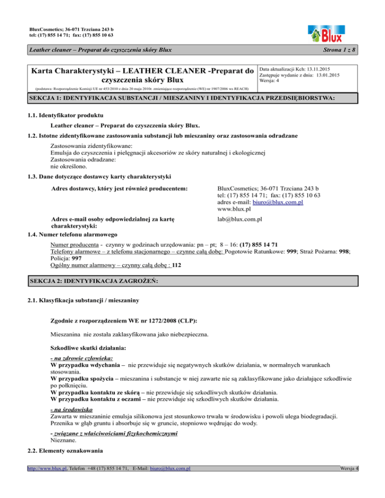BluxCosmetics; 36-071 Trzciana 243 b tel: (17) 855 14 71; fax: (17) 855 10 63 Leather cleaner – Preparat do czyszczenia skóry Blux Strona 1 z 8 Karta Charakterystyki – LEATHER CLEANER -Preparat do czyszczenia skóry Blux Data aktualizacji Kch: 13.11.2015 Zastępuje wydanie z dnia: 13.01.2015 Wersja: 4 (podstawa: Rozporządzenie Komisji UE nr 453/2010 z dnia 20 maja 2010r. zmieniające rozporządzenie (WE) nr 1907/2006 ws REACH) SEKCJA 1: IDENTYFIKACJA SUBSTANCJI / MIESZANINY I IDENTYFIKACJA PRZEDSIĘBIORSTWA: 1.1. Identyfikator produktu Leather cleaner – Preparat do czyszczenia skóry Blux. 1.2. Istotne zidentyfikowane zastosowania substancji lub mieszaniny oraz zastosowania odradzane Zastosowania zidentyfikowane: Emulsja do czyszczenia i pielęgnacji akcesoriów ze skóry naturalnej i ekologicznej Zastosowania odradzane: nie określono. 1.3. Dane dotyczące dostawcy karty charakterystyki Adres dostawcy, który jest również producentem: Adres e-mail osoby odpowiedzialnej za kartę charakterystyki: 1.4. Numer telefonu alarmowego BluxCosmetics; 36-071 Trzciana 243 b tel: (17) 855 14 71; fax: (17) 855 10 63 adres e-mail: [email protected] www.blux.pl [email protected] Numer producenta - czynny w godzinach urzędowania: pn – pt; 8 – 16: (17) 855 14 71 Telefony alarmowe – z telefonu stacjonarnego – czynne całą dobę: Pogotowie Ratunkowe: 999; Straż Pożarna: 998; Policja: 997 Ogólny numer alarmowy – czynny całą dobę : 112 SEKCJA 2: IDENTYFIKACJA ZAGROŻEŃ: 2.1. Klasyfikacja substancji / mieszaniny Zgodnie z rozporządzeniem WE nr 1272/2008 (CLP): Mieszanina nie została zaklasyfikowana jako niebezpieczna. Szkodliwe skutki działania: - na zdrowie człowieka: W przypadku wdychania – nie przewiduje się negatywnych skutków działania, w normalnych warunkach stosowania. W przypadku spożycia – mieszanina i substancje w niej zawarte nie są zaklasyfikowane jako działające szkodliwie po połknięciu. W przypadku kontaktu ze skórą – nie przewiduje się szkodliwych skutków działania. W przypadku kontaktu z oczami – nie przewiduje się szkodliwych skutków działania. - na środowisko Zawarta w mieszaninie emulsja silikonowa jest stosunkowo trwała w środowisku i powoli ulega biodegradacji. Przenika w głąb gruntu i absorbuje się w gruncie, stopniowo wędrując do wody. - związane z właściwościami fizykochemicznymi Nieznane. 2.2. Elementy oznakowania http://www.blux.pl, Telefon +48 (17) 855 14 71, E-Mail: [email protected] Wersja 4 BluxCosmetics; 36-071 Trzciana 243 b tel: (17) 855 14 71; fax: (17) 855 10 63 Leather cleaner – Preparat do czyszczenia skóry Blux Strona 2 z 8 ZNAK OSTRZEGAWCZY: brak - nie dotyczy. ZWROTY WSKAZUJĄCE RODZAJ ZAGROŻENIA: nie dotyczy. ZWROTY OKREŚLAJĄCE WARUNKI BEZPIECZNEGO STOSOWANIA: nie dotyczy. DODATKOWE ZWROTY INFORMUJĄCE O ZAGROŻENIACH: EUH 208 - Zawiera mieszaninę 5-Chloro-2-metylo-2H-izotiazol-3-on, 2-Metylo-2H-izotiazol-3-on (3:1). Może powodować wystąpienie reakcji alergicznej. 2.3. Inne zagrożenia Inne zagrożenia – mieszaniny nie poddano ocenie, w celu sprawdzenia, czy spełnia kryteria PBT lub vPvB. Odnośnie składników – brak danych SEKCJA 3: SKŁAD / INFORMACJA O SKŁADNIKACH: 3.1. Substancje nie dotyczy. 3.2. Mieszaniny Mieszanina produkowana jest na bazie emulsji silikonowej, która nie jest klasyfikowana jako niebezpieczna. Zawiera konserwant (patrz sekcja 2.2) SEKCJA 4: ŚRODKI PIERWSZEJ POMOCY: 4.1. Opis środków pierwszej pomocy Ze względu na drogę narażenia: Drogi oddechowe: Nie dotyczy. Kontakt ze skórą: Oblane miejsce spłukać dużą ilością wody. W razie wystąpienia niepokojących objawów (pieczenie, swędzenie, zaczerwienienie) skontaktować się z lekarzem. Kontakt z oczami: W przypadku kontaktu z oczami płukać dużą ilością wody przy otwartych powiekach przez około 15 minut. Skontaktować się z lekarzem. Po spożyciu: W przypadku spożycia przepłukać usta wodą. Podać poszkodowanemu dużą ilość wody. Nie wywoływać wymiotów. Skontaktować się z lekarzem. Jeśli poszkodowany jest nieprzytomny: NIE WOLNO podawać mu nic do picia NATYCHMIAST wezwać pomoc lekarską UŁOŻYĆ w pozycji bocznej bezpiecznej 4.2. Najważniejsze ostre i opóźnione objawy oraz skutki narażenia Ze względu na drogę narażenia: Mieszanina nie została zaklasyfikowana jako niebezpieczne, jednak w razie wystąpienia niepokojących objawów należy skontaktować się z lekarzem. Drogi oddechowe: nie przewiduje się szkodliwego działania. Kontakt ze skórą: nie przewiduje się szkodliwego działania. Kontakt z oczami: nie przewiduje się szkodliwego działania. Po spożyciu: Brak danych. http://www.blux.pl, Telefon +48 (17) 855 14 71, E-Mail: [email protected] Wersja 4 BluxCosmetics; 36-071 Trzciana 243 b tel: (17) 855 14 71; fax: (17) 855 10 63 Leather cleaner – Preparat do czyszczenia skóry Blux Strona 3 z 8 4.3. Wskazania dotyczące wszelkiej natychmiastowej pomocy lekarskiej i szczególnego postępowania z poszkodowanym W razie nagłego wypadku, podczas którego doszło do połknięcia mieszaniny, należy wezwać lekarza. http://www.blux.pl, Telefon +48 (17) 855 14 71, E-Mail: [email protected] Wersja 4 BluxCosmetics; 36-071 Trzciana 243 b tel: (17) 855 14 71; fax: (17) 855 10 63 Leather cleaner – Preparat do czyszczenia skóry Blux Strona 4 z 8 SEKCJA 5: POSTĘPOWANIE W PRZYPADKU POŻARU: 5.1. Środki gaśnicze Odpowiednie środki gaśnicze: Piana, dwutlenek węgla, proszek, mgła wodna. Nieodpowiednie środki gaśnicze: Silny strumień wodny – z uwagi na ryzyko rozprzestrzenienia pożaru. 5.2. Szczególne zagrożenia związane z substancją lub mieszaniną Brak danych. 5.3. Informacje dla straży pożarnej Nie wdychać gazów pożarowych. SEKCJA 6: POSTĘPOWANIE W PRZYPADKU NIEZAMIERZONEGO UWOLNIENIA DO ŚRODOWISKA: 6.1. Indywidualne środki ostrożności, wyposażenie ochronne i procedury w sytuacjach awaryjnych Bez specjalnych wymagań. Przestrzegać zasad bezpiecz