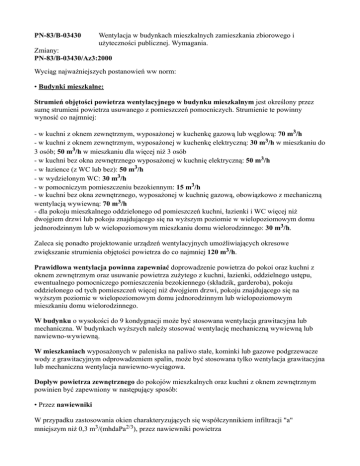 PN-83/B-03430 Wentylacja w budynkach mieszkalnych zamieszkania zbiorowego i użyteczności publicznej. Wymagania. Zmiany: PN-83/B-03430/Az3:2000 Wyciąg najważniejszych postanowień ww norm: • Budynki mieszkalne: Strumień objętości powietrza wentylacyjnego w budynku mieszkalnym jest określony przez sumę strumieni powietrza usuwanego z pomieszczeń pomocniczych. Strumienie te powinny wynosić co najmniej: - w kuchni z oknem zewnętrznym, wyposażonej w kuchenkę gazową lub węglową: 70 m3/h - w kuchni z oknem zewnętrznym, wyposażonej w kuchenkę elektryczną: 30 m3/h w mieszkaniu do 3 osób; 50 m3/h w mieszkaniu dla więcej niż 3 osób - w kuchni bez okna zewnętrznego wyposażonej w kuchnię elektryczną: 50 m3/h - w łazience (z WC lub bez): 50 m3/h - w wydzielonym WC: 30 m3/h - w pomocniczym pomieszczeniu bezokiennym: 15 m3/h - w kuchni bez okna zewnętrznego, wyposażonej w kuchnię gazową, obowiązkowo z mechaniczną wentylacją wywiewną: 70 m3/h - dla pokoju mieszkalnego oddzielonego od pomieszczeń kuchni, łazienki i WC więcej niż dwojgiem drzwi lub pokoju znajdującego się na wyższym poziomie w wielopoziomowym domu jednorodzinnym lub w wielopoziomowym mieszkaniu domu wielorodzinnego: 30 m3/h. Zaleca się ponadto projektowanie urządzeń wentylacyjnych umożliwiających okresowe zwiększanie strumienia objętości powietrza do co najmniej 120 m3/h. Prawidłowa wentylacja powinna zapewniać doprowadzenie powietrza do pokoi oraz kuchni z oknem zewnętrznym oraz usuwanie powietrza zużytego z kuchni, łazienki, oddzielnego ustępu, ewentualnego pomocniczego pomieszczenia bezokiennego (składzik, garderoba), pokoju oddzielonego od tych pomieszczeń więcej niż dwojgiem drzwi, pokoju znajdującego się na wyższym poziomie w wielopoziomowym domu jednorodzinnym lub wielopoziomowym mieszkaniu domu wielorodzinnego. W budynku o wysokości do 9 kondygnacji może być stosowana wentylacja grawitacyjna lub mechaniczna. W budynkach wyższych należy stosować wentylację mechaniczną wywiewną lub nawiewno-wywiewną. W mieszkaniach wyposażonych w paleniska na paliwo stałe, kominki lub gazowe podgrzewacze wody z grawitacyjnym odprowadzeniem spalin, może być stosowana tylko wentylacja grawitacyjna lub mechaniczna wentylacja nawiewno-wyciągowa. Dopływ powietrza zewnętrznego do pokojów mieszkalnych oraz kuchni z oknem zewnętrznym powinien być zapewniony w następujący sposób: • Przez nawiewniki W przypadku zastosowania okien charakteryzujących się współczynnikiem infiltracji "a" mniejszym niż 0,3 m3/(mhdaPa2/3), przez nawiewniki powietrza o regulowanym stopniu otwarcia usytuowane: - w górnej części okna (w ościeżnicy, ramie skrzydła, między ramą skrzydła a górną krawędzią szyby zespolonej), lub - w otworze okiennym (między nadprożem a górną krawędzią ościeżnicy, w obudowie rolety zewnętrznej), albo - w przegrodzie zewnętrznej ponad oknem. Strumień powietrza przepływającego przez całkowicie otwarty nawiewnik, przy różnicy ciśnienia po obu jego stronach 10 Pa, powinien mieścić się w granicach: - od 20 do 50 m3/h, jeśli zastosowana jest wentylacja grawitacyjna, - od 15 do 30 m3/h, jeśli zastosowana jest wentylacja mechaniczna wywiewna. Strumień powietrza przepływającego przez nawiewnik, którego element dławiący znajduje się w pozycji całkowitego zamknięcia, powinien zawierać się w granicach od 20 do 30% strumienia przy jego całkowitym otwarciu. W budynkach o wysokości do 9 kondygnacji włącznie dopuszcza się doprowadzenie powietrza przez okna charakteryzujące się współczynnikiem infiltracji "a" wyższym niż 0,5 a nie większym niż 1,0 m3/(mhdaPa2/3), pod warunkiem, że okna wyposażone są w skrzydło uchylno-rozwieralne, górny wywietrznik uchylny lub górne skrzydło uchylne. • Przez otwory nawiewne wentylacji mechanicznej Powietrze z pokojów mieszkalnych powinno być odprowadzane przez otwory wyrównawcze umieszczone ponad drzwiami lub w ich górnej części lub przez otwory wywiewne. Dopuszcza się odprowadzenie powietrza przez szczeliny pomiędzy dolną krawędzią drzwi a podłogą. Przekrój netto otworów lub szczelin powinien wynosić co najmniej 80 cm2. Dopływ powietrza wewnętrznego do kuchni, łazienek, ustępów oraz pomocniczych pomieszczeń bezokiennych powinien być zapewniony przez otwory w dolnych częściach drzwi lub przez szczeliny pomiędzy dolną krawędzią drzwi a podłogą lub progiem. Przekrój netto otworów lub szczelin powinien wynosić 200 cm2. Do poszczególnych pionów wentylacyjnych powinny być przyłączone tylko pomieszczenia o tym samym charakterze (kuchenne, sanitarno-higieniczne itd.). Nie dopuszcza się pionów obsługujących mieszkania do usuwania powietrza z pomieszczeń niemieszkalnych (piwnice, pralnie, suszarnie itd.) Piwnice: Wentylacja piwnic powinna zapewnić minimum 0,3 wymiany na godzinę. Poddasza: Poddasza winny mieć zapewniony dopływ i odpływ powietrza przez otwory w zewnętrznych przegrodach budowlanych. Klatki schodowe: Klatki schodowe powinny mieć w górnej części otwór wywiewny o przekroju netto 200 cm2. Zsypy śmieci: Rura zsypu śmieci powinna mieć wylot ponad dachem a strumień powietrza wywiewanego powinna wynosić co najmniej 200 m3/h. Pralnie: Pomieszczenia pralni domowych powinny mieć zapewnioną wentylację odpowiadającym minimum 2 krotnej wymianie powietrza na godzinę. Suszarnie: Pomieszczenia suszarni bielizny powinny mieć zapewnioną wentylację odpowiadającą 1 wymianie powietrza na godzinę. • Budynki zamieszkania zbiorowego: Strumień objętości powietrza wentylacyjnego powinien wynosić: - dla pokojów mieszkalnych: 20 m3/h dla każdego mieszkańca lecz nie mniej niż 1 wymiana na godzinę - dla pokojów zbiorowego przebywania ludzi (świetlice, pokoje nauki, jadalnie): 20 m3/h dla każdej przebywającej osoby - dla pokojów klimatyzowanych oraz wentylowanych o nie otwieranych oknach: 30 m3/h - kuchnie, łazienki o