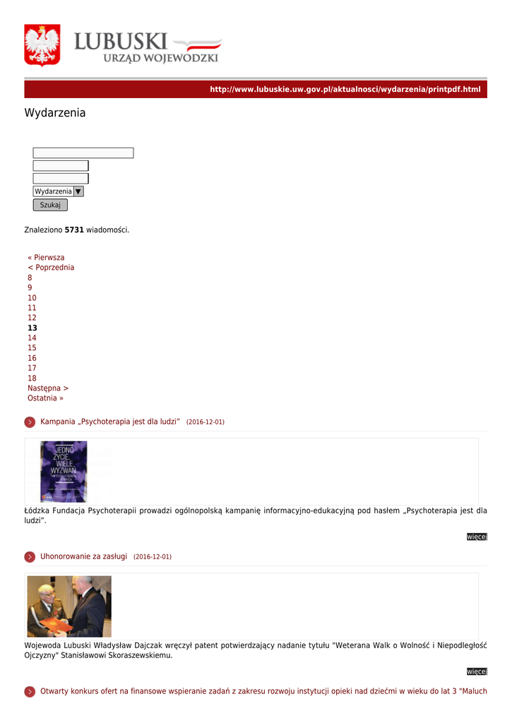 http://www.lubuskie.uw.gov.pl/aktualnosci/wydarzenia/printpdf.html Wydarzenia Wydarzenia ▼ Szukaj Znaleziono 5731 wiadomości. « Pierwsza < Poprzednia 8 9 10 11 12 13 14 15 16 17 18 Następna > Ostatnia » Kampania „Psychoterapia jest dla ludzi” (2016-12-01) Łódzka Fundacja Psychoterapii prowadzi ogólnopolską kampanię informacyjno-edukacyjną pod hasłem „Psychoterapia jest dla ludzi”. więcej Uhonorowanie za zasługi (2016-12-01) Wojewoda Lubuski Władysław Dajczak wręczył patent potwierdzający nadanie tytułu "Weterana Walk o Wolność i Niepodległość Ojczyzny" Stanisławowi Skoraszewskiemu. więcej Otwarty konkurs ofert na finansowe wspieranie zadań z zakresu rozwoju instytucji opieki nad dziećmi w wieku do lat 3 "Maluch plus" 2017 (2016-11-30) Minister Rodziny, Pracy i Polityki Społecznej ogłosił otwarty konkurs ofert na finansowe wspieranie zadań z zakresu rozwoju instytucji opieki nad dziećmi w wieku do lat 3 "Maluch plus" 2017. więcej Wojewoda Lubuski otworzył wyremontowane drogi w Lubiszynie (2016-11-29) Dzisiaj Wojewoda Lubuski Władysław Dajczak uroczyście otworzył wyremontowane drogi w Lubiszynie . W październiku zakończyła się duża powiatowa inwestycja drogowa. więcej Reforma edukacji- Dobra Szkoła (2016-11-29) Zgodnie z zapowiedzią w kwestiach związanych z wdrażaniem reformy edukacji Wojewoda Lubuski z Lubuskim Kuratorem Oświaty pozostają do Państwa dyspozycji. więcej Rejon kostrzyński włączony do Skoncentrowanej Dyspozytorni Medycznej w Gorzowie Wlkp. (2016-11-29) Jutro, zadania dyspozytorni medycznej w rejonie kostrzyńskim przejmie Skoncentrowana Dyspozytornia Medyczna (SDM) w Gorzowie Wlkp. więcej Społecznik roku 2016 (2016-11-28) Rozstrzygnięto 15, jubileuszową edycja konkursu Społecznik Roku w Pomocy Społecznej. więcej Reforma edukacji – cel: podniesienie jakości kształcenia (2016-11-25) Wojewoda Władysław Dajczak gościł Minister Edukacji Narodowej Annę Zalewską. Minister Zalewska prezentowała założenia reformy edukacji podczas spotkania z samorządowcami oraz dyrektorami szkół województwa lubuskiego. więcej Spotkanie z Konsulem Generalnym Republiki Białorusi (2016-11-25) Wojewoda Lubuski Władysław Dajczak spotkał się z Siergiejem Michniewiczem, Konsulem Generalnym Republiki Białorusi w Gdańsku. więcej Odznaczeni za długoletnią służbę (2016-11-24) Pracownicy Wojewódzkiego Inspektoratu Inspekcji Handlowej w Gorzowie Wlkp. zostali wyróżnieni. Wojewoda Lubuski Władysław Dajczak w imieniu Prezydenta RP uhonorował pracowników odznaczeniami za długoletnią służbę. więcej « Pierwsza < Poprzednia 8 9 10 11 12 13 14 15 16 17 18 Następna > Ostatnia »