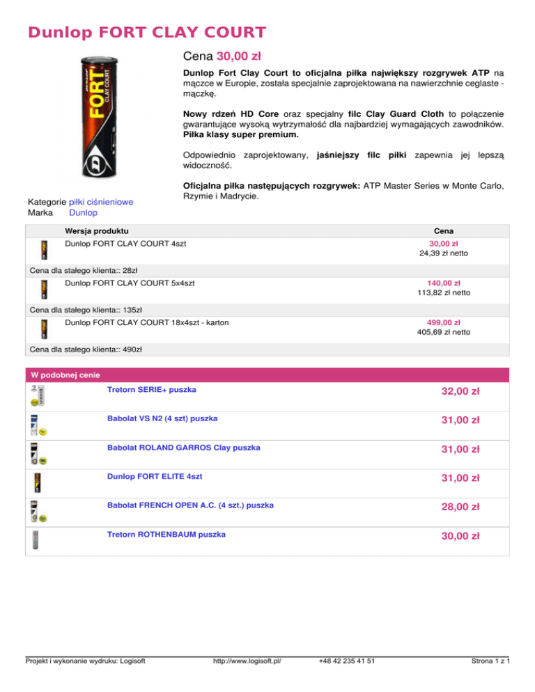 Dunlop FORT CLAY COURT Cena 30,00 zł Dunlop Fort Clay Court to oficjalna piłka największy rozgrywek ATP na mączce w Europie, została specjalnie zaprojektowana na nawierzchnie ceglaste mączkę. Nowy rdzeń HD Core oraz specjalny filc Clay Guard Cloth to połączenie gwarantujące wysoką wytrzymałość dla najbardziej wymagających zawodników. Piłka klasy super premium. Odpowiednio zaprojektowany, jaśniejszy filc piłki zapewnia jej lepszą widoczność. Kategorie piłki ciśnieniowe Marka Dunlop Oficjalna piłka następujących rozgrywek: ATP Master Series w Monte Carlo, Rzymie i Madrycie. Wersja produktu Cena Dunlop FORT CLAY COURT 4szt 30,00 zł 24,39 zł netto Cena dla stałego klienta:: 28zł Dunlop FORT CLAY COURT 5x4szt 140,00 zł 113,82 zł netto Cena dla stałego klienta:: 135zł Dunlop FORT CLAY COURT 18x4szt - karton 499,00 zł 405,69 zł netto Cena dla stałego klienta:: 490zł W podobnej cenie Tretorn SERIE+ puszka 32,00 zł Babolat VS N2 (4 szt) puszka 31,00 zł Babolat ROLAND GARROS Clay puszka 31,00 zł Dunlop FORT ELITE 4szt 31,00 zł Babolat FRENCH OPEN A.C. (4 szt.) puszka 28,00 zł Tretorn ROTHENBAUM puszka 30,00 zł Projekt i wykonanie wydruku: Logisoft Powered by TCPDF (www.tcpdf.org) http://www.logisoft.pl/ +48 42 235 41 51 Strona 1 z 1