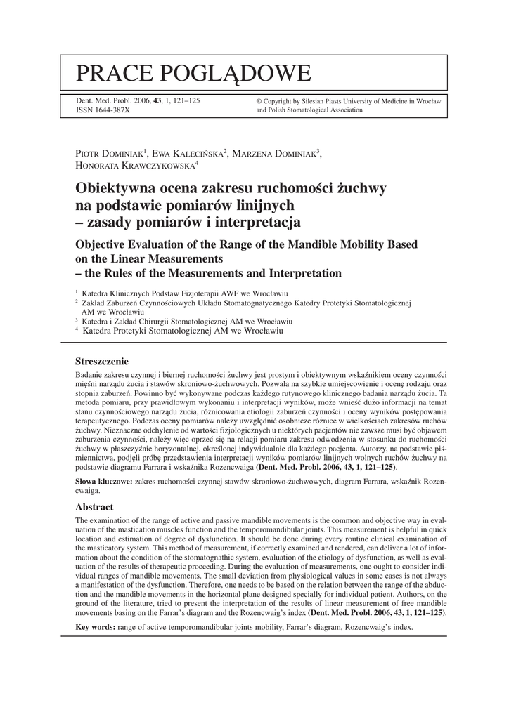 PRACE POGLĄDOWE Dent. Med. Probl. 2006, 43, 1, 121–125 ISSN 1644−387X © Copyright by Silesian Piasts University of Medicine in Wrocław and Polish Stomatological Association PIOTR DOMINIAK1, EWA KALECIŃSKA2, MARZENA DOMINIAK3, HONORATA KRAWCZYKOWSKA4 Obiektywna ocena zakresu ruchomości żuchwy na podstawie pomiarów linijnych – zasady pomiarów i interpretacja Objective Evaluation of the Range of the Mandible Mobility Based on the Linear Measurements – the Rules of the Measurements and Interpretation 1 2 3 4 Katedra Klinicznych Podstaw Fizjoterapii AWF we Wrocławiu Zakład Zaburzeń Czynnościowych Układu Stomatognatycznego Katedry Protetyki Stomatologicznej AM we Wrocławiu Katedra i Zakład Chirurgii Stomatologicznej AM we Wrocławiu Katedra Protetyki Stomatologicznej AM we Wrocławiu Streszczenie Badanie zakresu czynnej i biernej ruchomości żuchwy jest prostym i obiektywnym wskaźnikiem oceny czynności mięśni narządu żucia i stawów skroniowo−żuchwowych. Pozwala na szybkie umiejscowienie i ocenę rodzaju oraz stopnia zaburzeń. Powinno być wykonywane podczas każdego rutynowego klinicznego badania narządu żucia. Ta metoda pomiaru, przy prawidłowym wykonaniu i interpretacji wyników, może wnieść dużo informacji na temat stanu czynnościowego narządu żucia, różnicowania etiologii zaburzeń czynności i oceny wyników postępowania terapeutycznego. Podczas oceny pomiarów należy uwzględnić osobnicze różnice w wielkościach zakresów ruchów żuchwy. Nieznaczne odchylenie od wartości fizjologicznych u niektórych pacjentów nie zawsze musi być objawem zaburzenia czynności, należy więc oprzeć się na relacji pomiaru zakresu odwodzenia w stosunku do ruchomości żuchwy w płaszczyźnie horyzontalnej, określonej indywidualnie dla każdego pacjenta. Autorzy, na podstawie piś− miennictwa, podjęli próbę przedstawienia interpretacji wyników pomiarów linijnych wolnych ruchów żuchwy na podstawie diagramu Farrara i wskaźnika Rozencwaiga (Dent. Med. Probl. 2006, 43, 1, 121–125). Słowa kluczowe: zakres ruchomości czynnej stawów skroniowo−żuchwowych, diagram Farrara, wskaźnik Rozen− cwaiga. Abstract The examination of the range of active and passive mandible movements is the common and objective way in eval− uation of the mastication muscles function and the temporomandibular joints. This measurement is helpful in quick location and estimation of degree of dysfunction. It should be done during every routine clinical examination of the masticatory system. This method of measurement, if correctly examined and rendered, can deliver a lot of infor− mation about the condition of the stomatognathic system, evaluation of the etiology of dysfunction, as well as eval− uation of the results of therapeutic proceeding. During the evaluation of measurements, one ought to consider indi− vidual ranges of mandible movements. The small deviation from physiological values in some cases is not always a manifestation of the dysfunction. Therefore, one needs to be based on the relation between the range of the abduc− tion and the mandible movements in the horizontal plane designed specially for individual patient. Authors, on the ground of the literature, tried to present the interpretation of the results of linear measurement of free mandible movements basing on the Farrar’s diagram and the Rozencwaig’s index (Dent. Med. Probl. 2006, 43, 1, 121–125). Key words: range of active temporomandibular joints mobility, Farrar’s diagram, Rozencwaig’s index. 122 Badanie zakresu ruchomości czynnej i biernej żuchwy jest prostym i obiektywnym wskaźnikiem oceny czynności mięśni narządu żucia i stawu skro− niowo−żuchwowego (s.s.ż.). Badanie ruchomości czynnej żuchwy wymaga współpracy ze strony pa− cjenta, prawidłowego działania ośrodkowego i ob− wodowego układu nerwowego, a także prawidłowej funkcji stawów s.ż. i mięśni żucia. Daje ono szybki obraz rodzaju, umiejscowienia i stopnia zaburzeń czynności. Z punktu widzenia mechaniki wszystkie ruchy czynne są ruchami rotacyjnymi. Ruchy bierne służą do oceny stawów oraz tkanek miękkich, nie te− stują czynnej pracy mięśni. Wykonywane są przez badającego bez współudziału badanego przy maksy− malnie rozluźnionych mięśniach. Są identyczne z ruchami czynnymi, ale zakres ruchu biernego jest nieznacznie większy niż ruchu czynnego [1, 2]. Do przeprowadzenia diagnostyki różnicującej Cyriax [1] proponuje, aby porównać ze sobą ruchy czynne i bierne. W tym celu należy je wykonać bezpośrednio po sobie w tych samych kierunkach. Jeśli ruchy czynne i bierne są ograniczone i/albo wywołują jednocześnie bolesność podczas ruchu w tym samym kierunku, wskazuje to na uszkodze− nie struktur niekurczliwych (kości, torebki stawo− wej, więzadeł). Jeśli ruchy czynne i bierne są ogra− niczone i/lub bolesne w przeciwnych kierunkach, to wskazuje na uszkodzenie struktur kurczliwych (mięśni, ścięgien oraz miejsc ich przyczepów). Podczas badania dokonuje się ilościowej i jako− ściowej oceny ruchu. Jakościową ocenę ruchomości przeprowadza się w dwóch fazach, tj. od rozpoczęcia ruchu do pierw− szego oporu i od pierwszego oporu do oporu końco− wego, wykonując czynny i bierny ruch. W czasie te− go badania, według Cyriaxa [1, 2], może pojawić się tzw. łuk bolesny, który świadczy o ściskaniu delikat− nej struktury przez tkanki twarde. Wiąże się z wystą− pieniem bólu w dowolnym przedziale podczas wy− konywania ruchu czynnego lub biernego, który po jego przejściu zanika. Mogą temu towarzyszyć rów− nież trzaski w s.s.ż. [3–5]. Aby dokonać oceny jako− ściowej ruchu od jego rozpoczęcia do pierwszego oporu, badanie ruchomości czynnej poprzedza bada− nie ruchomości biernej. Podczas ruchu czynnego z pozycji zerowej badający obserwuje rozpoczęcie ruchu oraz tor prowadzenia żuchwy. Podczas ruchu bierne